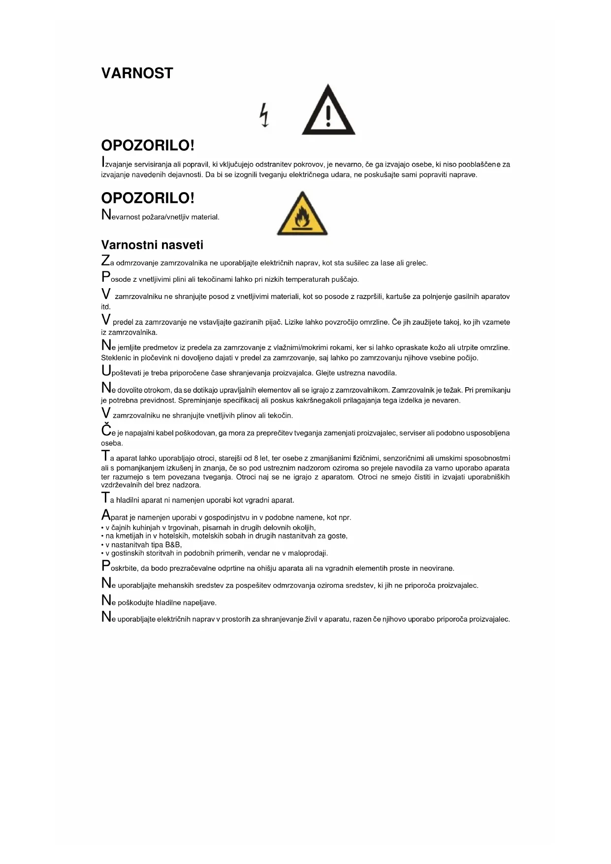 Varnostni nasveti Za odmrzovanje zamrzovalnika ne uporabljajte električnih naprav, kot sta sušilec za lase ali grelec. Posode z vnetljivimi plini ali tekočinami lahko pri nizkih temperaturah puščajo. V zamrzovalniku ne shranjujte posod z vnetljivimi materiali, kot so posode z razpršili, kartuše za polnjenje gasilnih aparatov itd. V predel za zamrzovanje ne vstavljajte gaziranih pijač. Lizike lahko povzročijo omrzline. Če jih zaužijete takoj, ko jih vzamete iz zamrzovalnika. Ne jemljite predmetov iz predela za zamrzovanje z vlažnimi/mokrimi rokami, ker si lahko opraskate kožo ali utrpite omrzline. Steklenic in pločevink ni dovoljeno dajati v predel za zamrzovanje, saj lahko po zamrzovanju njihove vsebine počijo. Upoštevati je treba priporočene čase shranjevanja proizvajalca. Glejte ustrezna navodila. Ne dovolite otrokom, da se dotikajo upravljalnih elementov ali se igrajo z zamrzovalnikom. Zamrzovalnik je težak. Pri premikanju je potrebna previdnost. Spreminjanje specifikacij ali poskus kakršnegakoli prilagajanja tega izdelka je nevaren. V zamrzovalniku ne shranjujte vnetljivih plinov ali tekočin. Če je napajalni kabel poškodovan, ga mora za preprečitev tveganja zamenjati proizvajalec, serviser ali podobno usposobljena oseba. Ta aparat lahko uporabljajo otroci, starejši od 8 let, ter osebe z zmanjšanimi fizičnimi, senzoričnimi ali umskimi sposobnostmi ali s pomanjkanjem izkušenj in znanja, če so pod ustreznim nadzorom oziroma so prejele navodila za varno uporabo aparata ter razumejo s tem povezana tveganja. Otroci naj se ne igrajo z aparatom. Otroci ne smejo čistiti in izvajati uporabniških vzdrževalnih del brez nadzora. Ta hladilni aparat ni namenjen uporabi kot vgradni aparat. Aparat je namenjen uporabi v gospodinjstvu in v podobne namene, kot npr.