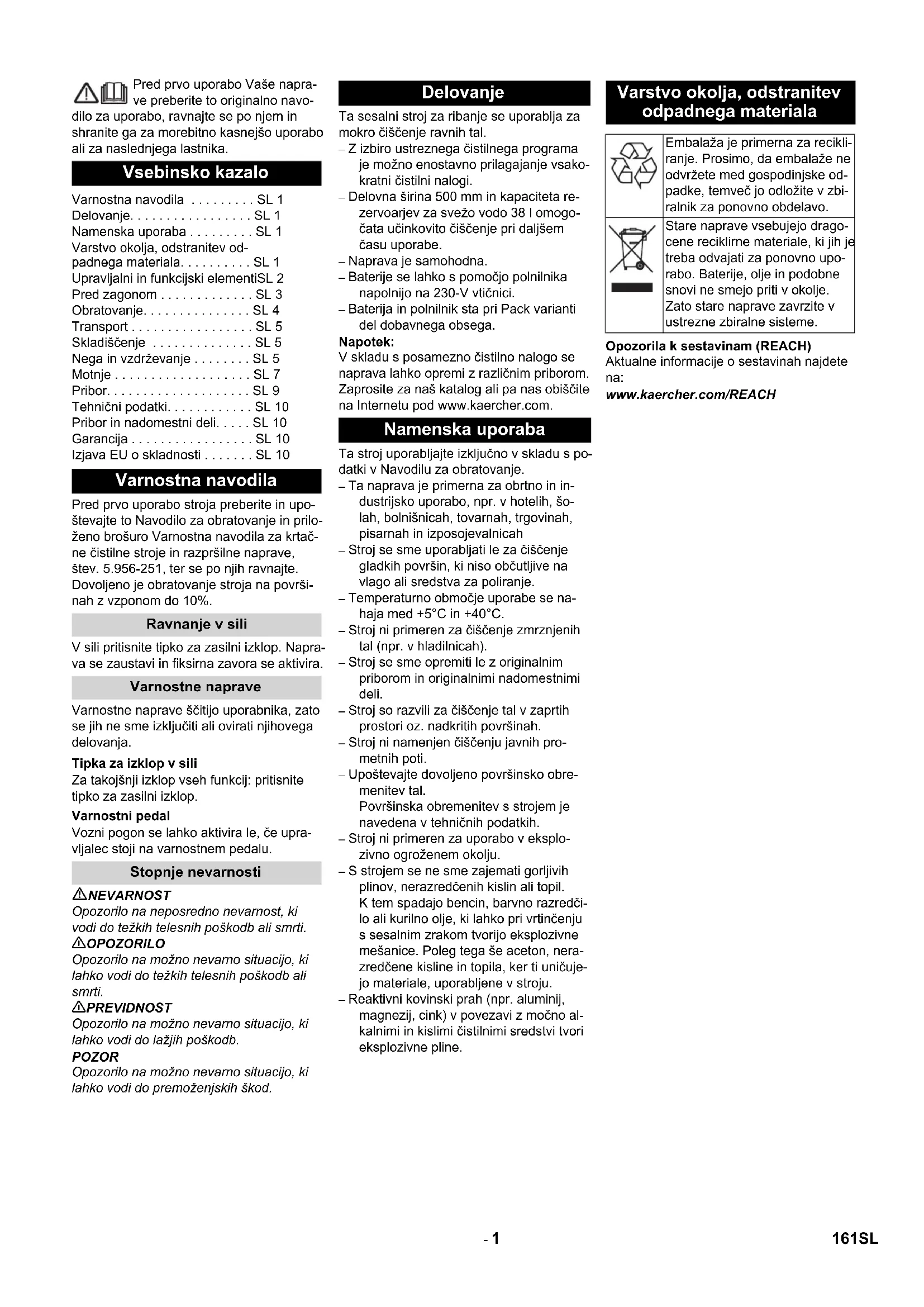 Chairman of the Board of Management Director Regulatory Affairs & Certification 160 CS- 1 Pred prvo uporabo Vaše napra- ve preberite to originalno navo- dilo za uporabo, ravnajte se po njem in shranite ga za morebitno kasnejšo uporabo ali za naslednjega lastnika. Pred prvo uporabo stroja preberite in upo- števajte to Navodilo za obratovanje in prilo- ženo brošuro Varnostna navodila za krtač- ne čistilne stroje in razpršilne naprave, štev. 5.956-251, ter se po njih ravnajte. Dovoljeno je obratovanje stroja na površi- nah z vzponom do 10%. V sili pritisnite tipko za zasilni izklop. Napra- va se zaustavi in fiksirna zavora se aktivira. Varnostne naprave ščitijo uporabnika, zato se jih ne sme izključiti ali ovirati njihovega delovanja. Za takojšnji izklop vseh funkcij: pritisnite tipko za zasilni izklop. Vozni pogon se lahko aktivira le, če upra- vljalec stoji na varnostnem pedalu. NEVARNOST Opozorilo na neposredno nevarnost, ki vodi do težkih telesnih poškodb ali smrti. 몇 OPOZORILO Opozorilo na možno nevarno situacijo, ki lahko vodi do težkih telesnih poškodb ali smrti. 몇 PREVIDNOST Opozorilo na možno nevarno situacijo, ki lahko vodi do lažjih poškodb. POZOR Opozorilo na možno nevarno situacijo, ki lahko vodi do premoženjskih škod. Ta sesalni stroj za ribanje se uporablja za mokro čiščenje ravnih tal. – Z izbiro ustreznega čistilnega programa je možno enostavno prilagajanje vsako- kratni čistilni nalogi. – Delovna širina 500 mm in kapaciteta re- zervoarjev za svežo vodo 38 l omogo- čata učinkovito čiščenje pri daljšem času uporabe. – Naprava je samohodna. – Baterije se lahko s pomočjo polnilnika napolnijo na 230-V vtičnici. – Baterija in polnilnik sta pri Pack varianti del dobavnega obsega. Napotek: V skladu s posamezno čistilno nalogo se naprava lahko opremi z različnim priborom. Zaprosite za naš katalog ali pa nas obiščite na Internetu pod www.kaercher.com. Ta stroj uporabljajte izključno v skladu s po- datki v Navodilu za obratovanje. – Ta naprava je primerna za obrtno in in- dustrijsko uporabo, npr. v hotelih, šo- lah, bolnišnicah, tovarnah, trgovinah, pisarnah in izposojevalnicah – Stroj se sme uporabljati le za čiščenje gladkih površin, ki niso občutljive na vlago ali sredstva za poliranje. – Temperaturno območje uporabe se na- haja med +5°C in +40°C. – Stroj ni primeren za čiščenje zmrznjenih tal (npr. v hladilnicah). – Stroj se sme opremiti le z originalnim priborom in originalnimi nadomestnimi deli. – Stroj so razvili za čiščenje tal v zaprtih prostori oz. nadkritih površinah. – Stroj ni namenjen čiščenju javnih pro- metnih poti. – Upoštevajte dovoljeno površinsko obre- menitev tal. Površinska obremenitev s strojem je navedena v tehničnih podatkih. – Stroj ni primeren za uporabo v eksplo- zivno ogroženem okolju. – S strojem se ne sme zajemati gorljivih plinov, nerazredčenih kislin ali topil. K tem spadajo bencin, barvno razredči- lo ali kurilno olje, ki lahko pri vrtinčenju s sesalnim zrakom tvorijo eksplozivne mešanice. Poleg tega še aceton, nera- zredčene kisline in topila, ker ti uničuje- jo materiale, uporabljene v stroju. – Reaktivni kovinski prah (npr. aluminij, magnezij, cink) v povezavi z močno al- kalnimi in kislimi čistilnimi sredstvi tvori eksplozivne pline. Opozorila k sestavinam (REACH) Aktualne informacije o sestavinah najdete na: www.kaercher.com/REACH Vsebinsko kazalo Varnostna navodila . . . . . . . . . SL 1 Delovanje. . . . . . . . . . . . . . . . . SL 1 Namenska uporaba . . . . . . . . . SL 1 Varstvo okolja, odstranitev od- padnega materiala. . . . . . . . . . SL 1 Upravljalni in funkcijski elementiSL 2 Pred zagonom . . . . . . . . . . . . . SL 3 Obratovanje. . . . . . . . . . . . . . . SL 4 Transport . . . . . . . . . . . . . . . . . SL 5 Skladiščenje . . . . . . . . . . . . . . SL 5 Nega in vzdrževanje . . . . . . . . SL 5 Motnje . . . . . . . . . . . . . . . . . . . SL 7 Pribor. . . . . . . . . . . . . . . . . . . . SL 9 Tehnični podatki. . . . . . . . . . . . SL 10 Pribor in nadomestni deli. . . . . SL 10 Garancija . . . . . . . . . . . . . . . . . SL 10 Izjava EU o skladnosti . . . . . . . SL 10 Varnostna navodila Ravnanje v sili Varnostne naprave Tipka za izklop v sili Varnostni pedal Stopnje nevarnosti Delovanje Namenska uporaba Varstvo okolja, odstranitev odpadnega materiala Embalaža je primerna za recikli- ranje. Prosimo, da embalaže ne odvržete med gospodinjske od- padke, temveč jo odložite v zbi- ralnik za ponovno obdelavo. Stare naprave vsebujejo drago- cene reciklirne materiale, ki jih je treba odvajati za ponovno upo- rabo. Baterije, olje in podobne snovi ne smejo priti v okolje. Zato stare naprave zavrzite v ustrezne zbiralne sisteme. 161SL- 2 1 Priključek gibke cevi, polnilna avtomati-