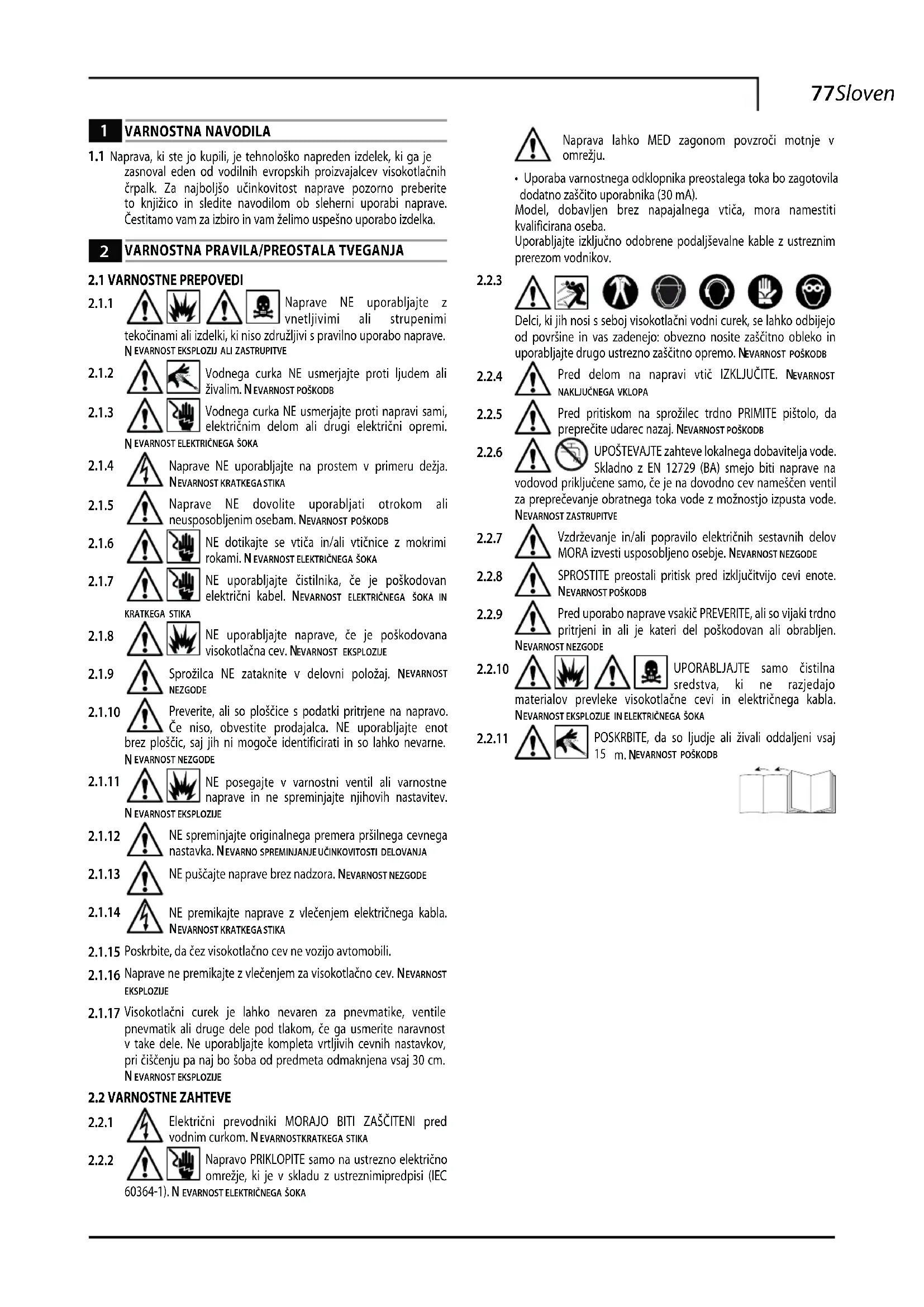 Električni prevodniki MORAJO BITI ZAŠČITENI pred vodnim curkom. NEVARNOST KRATKEGA STIKA Napravo PRIKLOPITE samo na ustrezno električno omrežje, ki je v skladu z ustreznimipredpisi (IEC 60364-1). NEVARNOST ELEKTRIČNEGA ŠOKA Naprava lahko MED zagonom povzroči motnje v omrežju.• Uporaba varnostnega odklopnika preostalega toka bo zagotovila dodatno zaščito uporabnika (30 mA).Model, dobavljen brez napajalnega vtiča, mora namestiti kvalificirana oseba.Uporabljajte izključno odobrene podaljševalne kable z ustreznim prerezom vodnikov. Delci, ki jih nosi s seboj visokotlačni vodni curek, se lahko odbijejo od površine in vas zadenejo: obvezno nosite zaščitno obleko in uporabljajte drugo ustrezno zaščitno opremo. NEVARNOST POŠKODB Pred delom na napravi vtič IZKLJUČITE. NEVARNOST NAKLJUČNEGA VKLOPA Pred pritiskom na sprožilec trdno PRIMITE pištolo, da preprečite udarec nazaj. NEVARNOST POŠKODB UPOŠTEVAJTE zahteve lokalnega dobavitelja vode. Skladno z EN 12729 (BA) smejo biti naprave na vodovod priključene samo, če je na dovodno cev nameščen ventil za preprečevanje obratnega toka vode z možnostjo izpusta vode. EVARNOST ZASTRUPITVE Vzdrževanje in/ali popravilo električnih sestavnih delov MORA izvesti usposobljeno osebje. NEVARNOST NEZGODE SPROSTITE preostali pritisk pred izključitvijo cevi enote. EVARNOST POŠKODB Pred uporabo naprave vsakič PREVERITE, ali so vijaki trdno pritrjeni in ali je kateri del poškodovan ali obrabljen. EVARNOST NEZGODE UPORABLJAJTE samo čistilna sredstva, ki ne razjedajo materialov prevleke visokotlačne cevi in električnega kabla. EVARNOST EKSPLOZIJE