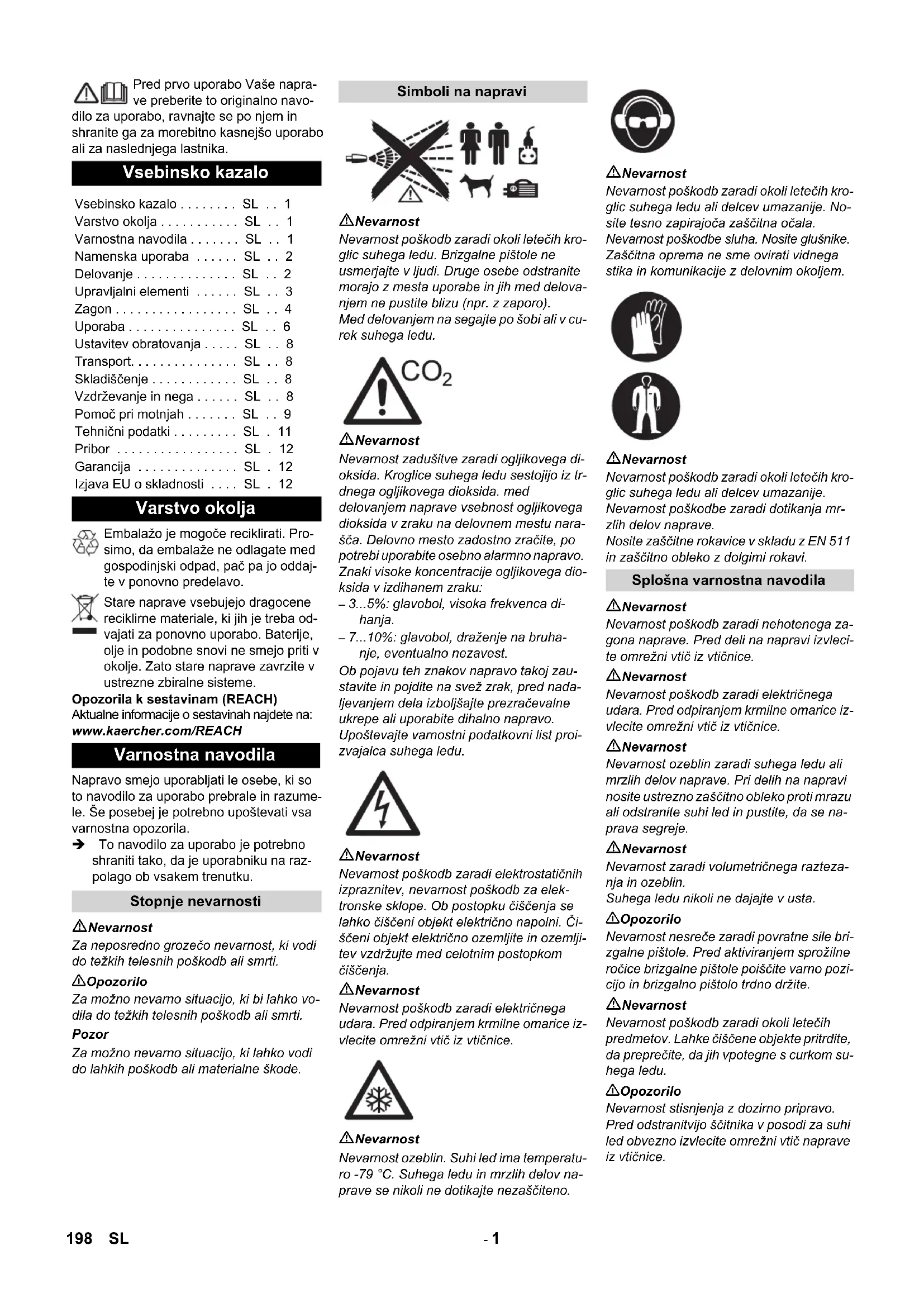 - %: glavobol, visoka frekvenca di- hanja. – 7 %: glavobol, draženje na bruha- nje, eventualno nezavest. Ob pojavu teh znakov napravo takoj zau- stavite in pojdite na svež zrak, pred nada- ljevanjem dela izboljšajte prezračevalne ukrepe ali uporabite dihalno napravo. Upoštevajte varnostni podatkovni list proi- zvajalca suhega ledu. Nevarnost Nevarnost poškodb zaradi elektrostatičnih izpraznitev, nevarnost poškodb za elek- tronske sklope. Ob postopku čiščenja se lahko čiščeni objekt električno napolni. Či- ščeni objekt električno ozemljite in ozemlji- tev vzdržujte med celotnim postopkom čiščenja. Nevarnost Nevarnost poškodb zaradi električnega udara. Pred odpiranjem krmilne omarice iz- vlecite omrežni vtič iz vtičnice. Nevarnost Nevarnost ozeblin. Suhi led ima temperatu- ro -79 °C. Suhega ledu in mrzlih delov na- prave se nikoli ne dotikajte nezaščiteno. Nevarnost Nevarnost poškodb zaradi okoli letečih kro- glic suhega ledu ali delcev umazanije. No- site tesno zapirajoča zaščitna očala. Nevarnost poškodbe sluha. Nosite glušnike. Zaščitna oprema ne sme ovirati vidnega stika in komunikacije z delovnim okoljem. Nevarnost Nevarnost poškodb zaradi okoli letečih kro- glic suhega ledu ali delcev umazanije. Nevarnost poškodbe zaradi dotikanja mr- zlih delov naprave. Nosite zaščitne rokavice v skladu z EN 511 in zaščitno obleko z dolgimi rokavi. Nevarnost Nevarnost poškodb zaradi nehotenega za- gona naprave. Pred deli na napravi izvleci- te omrežni vtič iz vtičnice. Nevarnost Nevarnost poškodb zaradi električnega udara. Pred odpiranjem krmilne omarice iz- vlecite omrežni vtič iz vtičnice. Nevarnost Nevarnost ozeblin zaradi suhega ledu ali mrzlih delov naprave. Pri delih na napravi nosite ustrezno zaščitno obleko proti mrazu ali odstranite suhi led in pustite, da se na- prava segreje. Nevarnost Nevarnost zaradi volumetričnega razteza- nja in ozeblin. Suhega ledu nikoli ne dajajte v usta. 몇 Opozorilo Nevarnost nesreče zaradi povratne sile bri- zgalne pištole. Pred aktiviranjem sprožilne ročice brizgalne pištole poiščite varno pozi- cijo in brizgalno pištolo trdno držite. Nevarnost Nevarnost poškodb zaradi okoli letečih predmetov. Lahke čiščene objekte pritrdite, da preprečite, da jih vpotegne s curkom su- hega ledu. 몇 Opozorilo Nevarnost stisnjenja z dozirno pripravo. Pred odstranitvijo ščitnika v posodi za suhi led obvezno izvlecite omrežni vtič naprave iz vtičnice. Vsebinsko kazalo Vsebinsko kazalo p. 10