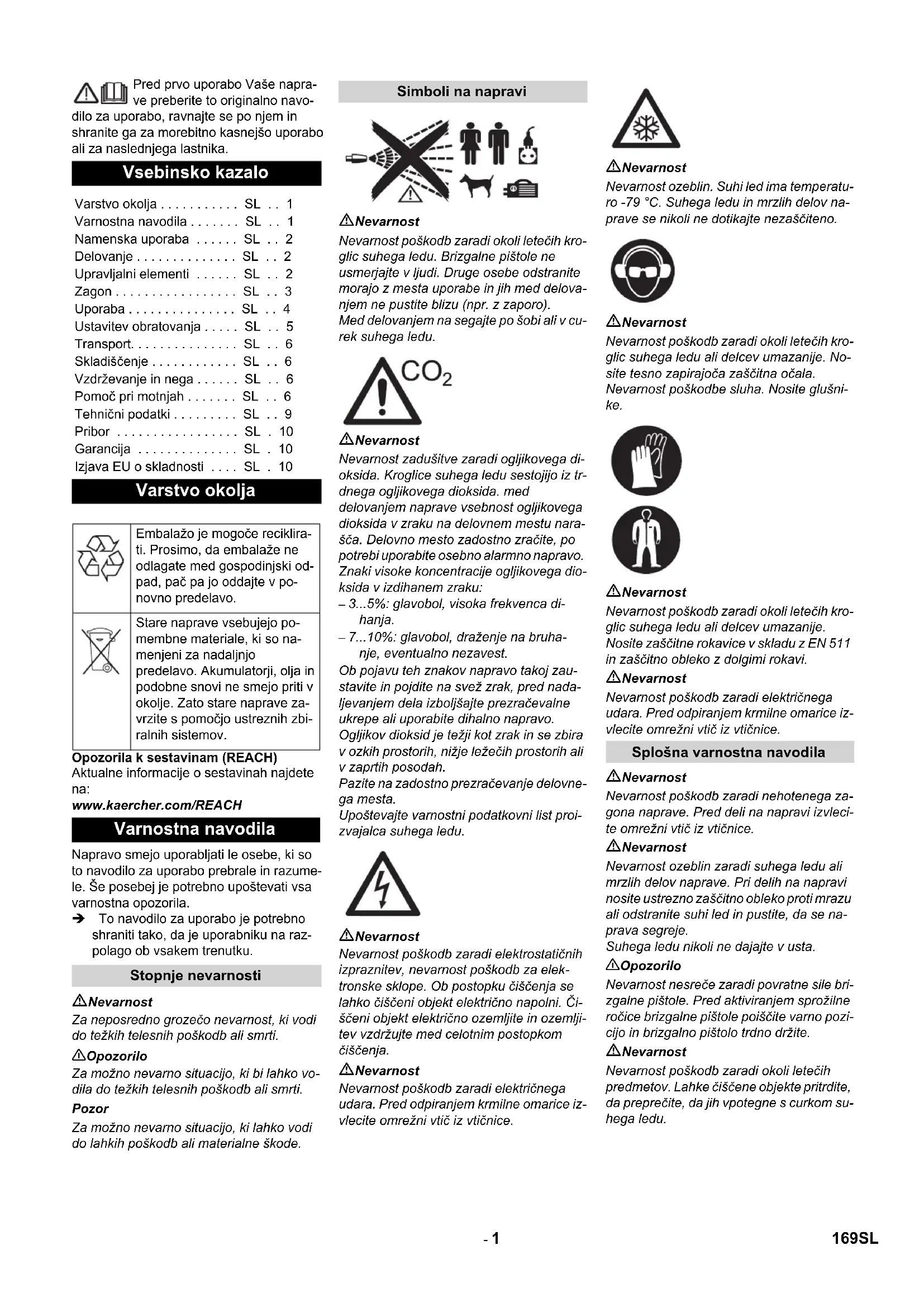 Nevarnost Nevarnost nesreče zaradi ostankov suhe- ga ledu v napravi. Pred transportom v zapr- tih vozilih je potrebno suhi led brez ostankov odstraniti iz naprave, da se pre- preči ogrožanje oseb, ki se vozijo poleg, z ogljikovim dioksidom. Pozor Nevarnost poškodbe in škode! Pri transpor- tu upoštevajte težo naprave. Pred transportom izvedite vse korake v poglavju „Zaustavitev obratovanja“. Napravo namestite na transportno vozi- lo. Zablokirajte zavore vodilnih koles. Napravo z napenjalnimi pasovi pritrdite na vozilo. Pozor Nevarnost poškodbe in škode! Pri shranje- vanju upoštevajte težo naprave. Ta naprava se sme shraniti le v notranjih prostorih. Nevarnost Nevarnost zadušitve zaradi nabiranja oglji- kovega dioksida. Kroglice suhega ledu skladiščite le na dobro prezračevanih me- stih. Pogoj za zanesljivo obratovanje naprave je redno vzdrževanje po naslednjem vzdrže- valnem načrtu. Uporabljajte izključno orginalne nadome- stne dele proizvajalca ali dele, ki jih slednji priporoča, kot – nadomestne in obrabne dele, – dele pribora, – goriva, – čistila. Nevarnost! Nevarnost nesreče pri delu na napravi. Pred deli na napravi izvedite vse korake poglavja „Zaustavitev obratovanja“. Nevarnost Nevarnost ozeblin zaradi suhega ledu ali mrzlih delov naprave. Pri delih na napravi nosite ustrezno zaščitno obleko proti mrazu ali odstranite suhi led in pustite, da se na- prava segreje. Suhega ledu nikoli ne dajajte v usta. 몇 Opozorilo Nevarnost poškodb. Brizgalne pištole ne či- stite s topili, bencinom ali čistili, ki vsebujejo olje. Za zagotovitev zanesljivega obratovanja naprave priporočamo, da sklenete pogod- bo o vzdrževanju. Prosimo, da se obrnete na pristojen uporabniški servis podj. Kär- cher. Gibko cev za brizgalno sredstvo skrbno preglejte glede razpok, pregibov in dru- gih poškodb. Mehka mesta v gibki cevi kažejo obrabo na notranji strani gibke cevi. Okvarjeno ali izrabljeno gibko cev je potrebno zamenjati z novo gibko cev- jo. Preglejte električni kabel in vtič glede poškodb. Okvarjene dele naj zamenja uporabniški servis. Spoje na gibki cevi za brizgalno sred- stvo, na napravi in na brizgalni pištoli preglejte glede poškodb in obrabe. Za- menjajte okvarjeno gibko cev, okvarje- ne spoje na napravi ali brizgalni pištoli naj zamenja uporabniški servis. Preverite dozirno pripravo glede po- škodb in netesnosti. Če se ugotovijo po- škodbe/netesnosti, obvestite uporabniški servis. Preverite trdno naleganje pritrditvenih kap zadnjih koles. Naj vam napravo pregleda servisna služba. Gibko cev za brizgalno sredstvo obno- vite najmanj vsaki 2 leti. Za izvajanje vzdrževalnih del je potrebno odstraniti stranske obloge naprave: 1 Stranska obloga 2 Hitro zapiralo Hitro zapiralo odprite v nasprotni smeri urnega kazalca. Snemite stransko oblogo. 1 Vijak 2 Spodnji del 3 Matica 4 Kolut 5 Filtrni vložek 6 Zgornji del Izvijte 4 vijake. Snemite spodnji del. Odvijte matice. Odstranite kolut. Snemite filtrni vložek in ga zamenjajte z novim filtrnim vložkom. Vodni ločevalnik ponovno sestavite v obratnem vrstnem redu. V skladu z BGV D 26 mora strokovnjak na napravi opraviti naslednje preglede. Rezul- tate pregleda je potrebno podati pisno v Potrdilu o pregledu. Potrdilo o pregledu mora upravljavec naprave shraniti do na- slednjega pregleda. preverite napravo glede pravilnega sta- nja in delovanja. preverite napravo glede pravilnega sta- nja, delovanja in postavitve. preverite napravo glede pravilnega sta- nja, delovanja in postavitve. Nevarnost! Nevarnost nesreče pri delu na napravi. Pred deli na napravi izvedite vse korake poglavja „Zaustavitev obratovanja“. Nevarnost Nevarnost ozeblin zaradi suhega ledu ali mrzlih delov naprave. Pri delih na napravi nosite ustrezno zaščitno obleko proti mrazu ali odstranite suhi led in pustite, da se na- prava segreje. Suhega ledu nikoli ne dajajte v usta. Transport Skladiščenje Vzdrževanje in nega Navodila za vzdrževanje Vzdrževalna pogodba Načrt servisiranja Dnevno pred začetkom obratovanja Vsakih 100 obratovalnih ur Vsakih 500 ur ali letno Vsaki 2 leti Odpiranje naprave Vzdrževanje Menjava fitrnega vložka v vodnem loče- valniku Pregledi Po prekinitvi obratovanja več kot ene- ga leta Po spremembi kraja namestitve Po servisnih delih ali spremembah, ki bi lahko vplivale na varnost obratova- nja Pomoč pri motnjah 174 SL- 7 Motnje s prikazom na prikazovalniku Prikaz Kontrolna lučka (KL) Možen vzrok Odprava Kdo E001 KL Krmilna nape- tost sveti rdeče Krmilna napetost prenizka Izklopite napravo, malo počakajte, ponovno vklopite napravo. Preverite vtičnico. Pri večkratnem pojavljanju kode napake obvestite uporabniški servis podjetja Kärcher Uporabnik E002 KL Zasilni izklop sveti rdeče Tipka za zasilni izklop je priti- snjena Tipko za izklop v sili deblokirajte z obračanjem. Uporabnik E003 KL Stisnjeni zrak sveti rdeče Tlak oskrbe s stisnjenim zra- kom premajhen Povečajte tlak. Izklopite napravo, malo počakajte, ponovno vklopite napravo. Uporabnik E004 KL Doziranje sveti rdeče Motnja v dozirni enoti Izklopite napravo, malo počakajte, ponovno vklopite napravo. Pri večkratnem pojavljanju kode napake obvestite uporabniški servis podjetja Kärcher Uporabnik E005 KL Brizgalna pištola sveti rdeče Povezava med napravo in bri- zgalno pištolo motena. Preverite pravilno povezavo spojev v krmilnem vodu. Krmilni kabel preglejte glede poškodb. Uporabnik E006 KL Brizgalna pištola sveti rdeče Kratek stik v brizgalni pištoli ali krmilnem kablu Zamenjajte brizgalno pištolo ali brizgalno gibko cev s krmilnim kablom. Uporabnik E007 KL Stisnjeni zrak sveti rdeče Motnja na regulirnem ventilu stisnjenega zraka Obrnite se na uporabniški servis. Uporabnik E008 KL Brizgalna pištola sveti oranžno Sprožilna ročica brizgalne pi- štole je bila med vklopom ali po deblokadi tipke za zasilni izklop aktivirana Spustite sprožilno ročico brizgalne pištole. Uporabnik 175SL- 8 Motnje brez prikaza na prikaz