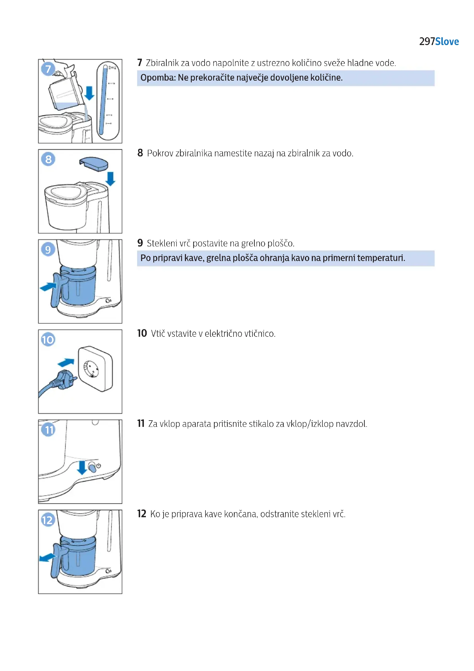 - Ak zo zariadenia počas varenia vyberiete kanvicu na viac ako 20 sekúnd, lter začne pretekať. 290 SlovenčinaKazalo Uvod 292 Pomembne varnostne informacije 292 Elektromagnetna polja (EMF) 292 Na kratko o aparatu 293 Pred prvo uporabo 294 Priprava kave 296 Funkcija za preprečevanje kapljanja 298 Čiščenje 298 Odstranjevanje vodnega kamna 299 Naročanje dodatne opreme 300 Jamstvo in podpora 300 Recikliranje 301 Odpravljanje težav 301 291SlovenščinaUvod Čestitamo za nakup in pozdravljeni pri Philipsu! Če želite popolnoma izkoristiti podporo, ki jo ponuja Philips, izdelek registrirajte na spletnem mestu www.philips.com/welcome. Pomembne varnostne informacije Pred uporabo aparata natančno preberite te pomembne informacije in jih shranite za poznejšo uporabo. Nevarnost - Aparata ne potapljajte v vodo ali katero koli drugo tekočino. Opozorilo - Preden aparat priključite na električno omrežje, preverite, ali napetost, navedena na njem, ustreza napetosti lokalnega električnega omrežja. - Aparat priključite v ozemljeno električno vtičnico. - Aparata ne uporabljajte, če je poškodovan vtič, napajalni kabel ali sam aparat. - Poškodovani omrežni kabel sme zamenjati samo Philips, Philipsov pooblaščeni servis ali ustrezno usposobljeno osebje, da se izognete nevarnosti. - Ta aparat lahko uporabljajo otroci od 8. leta starosti naprej in osebe z zmanjšanimi zičnimi, zaznavnimi ali psihičnimi sposobnostmi ali s pomanjkljivimi izkušnjami in znanjem, če imajo na voljo in razumejo navodila za varno uporabo aparata ali jih pri uporabi nadzoruje odgovorna oseba in če so seznanjeni z morebitnimi nevarnostmi. Otroci aparata ne smejo čistiti in vzdrževati, razen če so starejši od 8 let in jih kdo nadzoruje. Aparat in kabel hranite izven dosega otrok, mlajših od 8 let. - Otroci naj se ne igrajo z aparatom. - Električni kabel naj ne visi čez rob mize ali pulta, na katerem stoji aparat. - Ta aparat uporabljajte samo za predviden namen, da preprečite morebitno nevarnost ali telesne poškodbe. Opozorilo - Aparat pred prvo uporabo vedno splaknite s svežo vodo. - Aparata ne postavljajte na vročo površino in pazite, da napajalni kabel ne pride v stik z vročimi površinami. - Aparat naj med uporabo ne bo v omari. - Aparat pred čiščenjem in v primeru težav med pripravljanjem kave izklopite. - Med pripravo kave in dokler aparata ne izklopite, so nosilec ltra, spodnji del aparata, grelna plošča in vrč s kavo vroči. - Vrča ne postavljajte na štedilnik ali v mikrovalovno pečico, da bi pogreli kavo. - Ta aparat je namenjen uporabi v gospodinjstvih in podobnih okoljih, kot so vikendi, gostišča, ki ponujajo prenočišča z zajtrkom, čajne kuhinje v trgovinah, pisarne in druga delovna okolja ter v hotelskih in motelskih sobah in ostalih namestitvenih objektih. - Za pregled ali popravilo aparata se obrnite na Philipsov pooblaščeni servis. Aparata ne odpirajte in ga ne poskušajte sami popraviti. Elektromagnetna polja (EMF) Ta Philipsov aparat ustreza vsem veljavnim standardom in predpisom glede izpostavljenosti elektromagnetnim poljem. 292 SlovenščinaNa kratko o aparatu 1 Filter 2 Ohišje ltra 3 Pokrov vrča 4 Stekleni vrč 5 Grelna plošča 6 Stikalo za vklop/izklop 7 Zbiralnik za vodo 8 Pokrov ltra 9 Pokrov zbiralnika za vodo