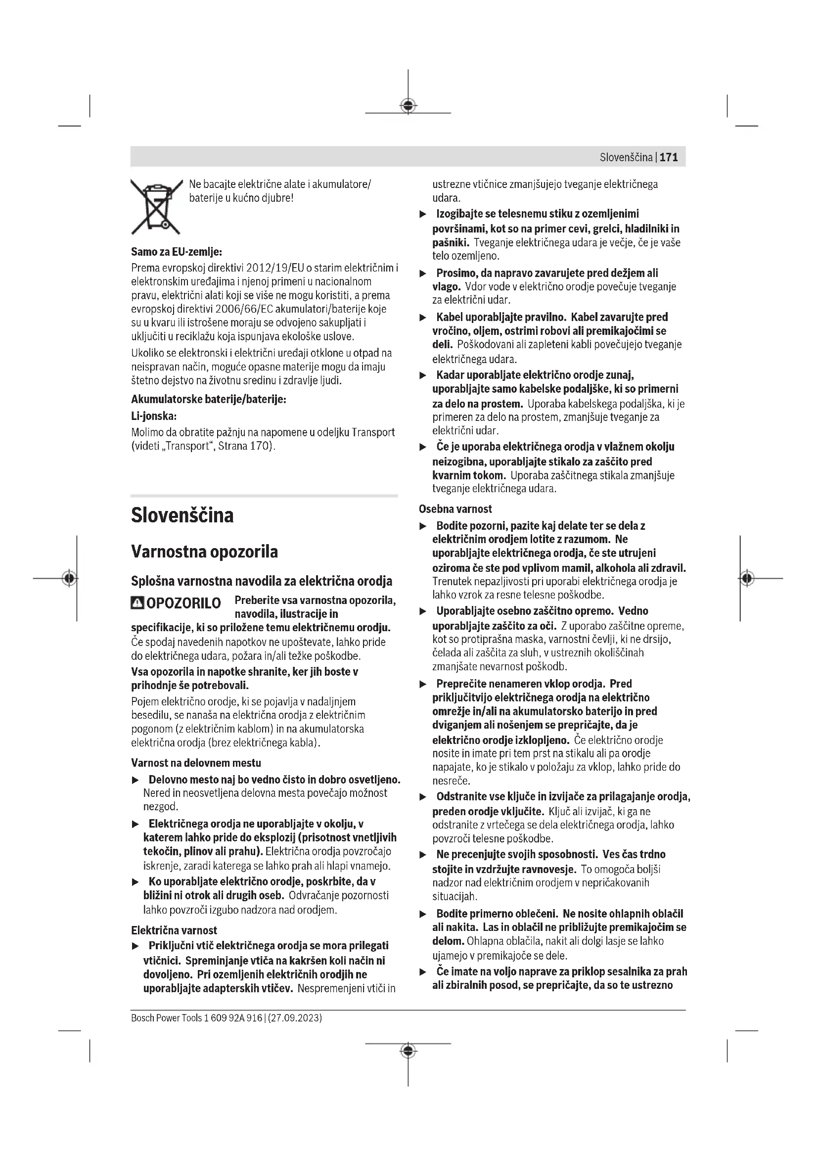 Podesite prsten za podešavanje izbora obrtnog momenta(3) na željeni obrtni momenat. Za maksimalni obrtni moment postavite prsten za podešavanje izbora režima rada(4) na simbol „Bušenje/zavrtanje MAKS“. Zavrtanje i bušenje Za zavrtanje velikih zavrtanja i za bušenje podesite prsten za podešavanje izbora režima rada(4) na simbol „Bušenje/zavrtanje MAKS“. Udarno bušenje Za udarno bušenje postavite prsten za podešavanje izbora režima rada(4) na simbol „Udarno bušenje“. Potpuno automatska blokada vretena (Auto‑Lock) Kada prekidač za uključivanje/isključivanje nije pritisnut (10) blokira se vreteno bušilice i samim tim i prihvat alata (1). Ovo omogućava uvrtanje zavrtanja i pri praznom akumulatoru (7) odnosno korišćenje električnog alata kao odvrtača za zavrtnje. Zaštita od preopterećenja zavisna od temperature Prilikom upotrebe u skladu sa odredbama električni alat ne može da se preoptereti. U slučaju prejakog opterećenja ili prekoračenja dozvoljene temperature akumulatorske baterije elektronika isključuje električni alat dok ponovo ne bude u optimalnom opsegu radne temperature. Napomene za rad u Električni alat stavljajte na navrtku/zavrtanj samo kada je isključen. Električni alati koji se okreću mogu proklizati. Posle dužeg rada sa malim brojem obrtaja trebalo bi električni alat ostaviti da se okreće radi hlađenja otpr. 3 minuta pri maksimalnom broju obrtaja u praznom hodu. Održavanje i servis Održavanje i čišćenje u Izvadite bateriju pre svih radova na električnom alatu (na primer održavanja, promene pribora itd.) kao i kod njegovog transporta i čuvanja. Kod slučajnog aktiviranja prekidača za uključivanje/isključivanje postoji opasnost od povrede. u Držite električni alat i proreze za ventilaciju čiste, da bi dobro i sigurno radili. Servis i saveti za upotrebu Servis odgovara na vaša pitanja u vezi sa popravkom i održavanjem vašeg proizvoda kao i u vezi sa rezervnim delovima. Šematske prikaze i informacije u vezi rezervnih delova naći ćete i pod: www.bosch-pt.com Bosch tim za konsultacije vam rado pomaže tokom primene, ukoliko imate pitanja o našim proizvodima i njihovom priboru. Molimo da kod svih pitanja i naručivanja rezervnih delova neizostavno navedete broj artikla sa 10brojčanih mesta prema tipskoj pločici proizvoda. Srpski Bosch Elektroservis Dimitrija Tucovića 59 11000 Beograd Tel.: +381 11 644 8546 Tel.: +381 11 744 3122 Tel.: +381 11 641 6291 Fax: +381 11 641 6293 E-Mail: office@servis-bosch.rs www.bosch-pt.rs Dodatne adrese servisa pogledajte na: www.bosch-pt.com/serviceaddresses Transport Preporučeni litijum-jonski akumulatori podležu zahtevima propisa o opasnim materijama. Korisnik može bez dodatnih uslova transportovati akumulatore na drumu. Kod slanja preko trećih lica (na primer vazdušnih transportom ili špedicijom) mora se obratiti pažnja na posebne zahteve u pogledu pakovanja i označavanja. Tada se kod pripreme paketa za slanje mora pozvati stručnjak za opasne materije. Akumulatorske baterije šaljite samo ako kućište nije oštećeno. Odlepite otvorene kontakte i upakujte akumulatorsku bateriju tako, da se ne pokreće u paketu. Molimo da obratite pažnju na eventualne dalje nationalne propise. Uklanjanje đubreta Električne alate, akumulacione baterije, pribor i pakovanja treba predati na reciklažu koja je u skladu sa zaštitom životne sredine. 1 609 92A 916 | (27.09.2023) Bosch Power ToolsSlovenščina | 171 Ne bacajte električne alate i akumulatore/ baterije u kućno djubre! Samo za EU‑zemlje: Prema evropskoj direktivi 2012/19/EU o starim električnim i elektronskim uređajima i njenoj primeni u nacionalnom pravu, električni alati koji se više ne mogu koristiti, a prema evropskoj direktivi 2006/66/EC akumulatori/baterije koje su u kvaru ili istrošene moraju se odvojeno sakupljati i uključiti u reciklažu koja ispunjava ekološke uslove. Ukoliko se elektronski i električni uređaji otklone u otpad na neispravan način, moguće opasne materije mogu da imaju štetno dejstvo na životnu sredinu i zdravlje ljudi. Akumulatorske baterije/baterije: Li-jonska: Molimo da obratite pažnju na napomene u odeljku Transport (videti „Transport“, Strana170). Slovenščina Varnostna opozorila Splošna varnostna navodila za električna orodja OPOZORILO Preberite vsa varnostna opozorila, navodila, ilustracije in specifikacije, ki so priložene temu električnemu orodju. Če spodaj navedenih napotkov ne upoštevate, lahko pride do električnega udara, požara in/ali težke poškodbe. Vsa opozorila in napotke shranite, ker jih boste v prihodnje še potrebovali. Pojem električno orodje, ki se pojavlja v nadaljnjem besedilu, se nanaša na električna orodja z električnim pogonom (z električnim kablom) in na akumulatorska električna orodja (brez električnega kabla). Varnost na delovnem mestu u Delovno mesto naj bo vedno čisto in dobro osvetljeno. Nered in neosvetljena delovna mesta povečajo možnost nezgod. u Električnega orodja ne uporabljajte v okolju, v katerem lahko pride do eksplozij (prisotnost vnetljivih tekočin, plinov ali prahu). Električna orodja povzročajo iskrenje, zaradi katerega se lahko prah ali hlapi vnamejo. u Ko uporabljate električno orodje, poskrbite, da v bližini ni otrok ali drugih oseb. Odvračanje pozornosti lahko povzroči izgubo nadzora nad orodjem. Električna varnost u Priključni vtič električnega orodja se mora prilegati vtičnici. Spreminjanje vtiča na kakršen koli način ni dovoljeno. Pri ozemljenih električnih orodjih ne uporabljajte adapterskih vtičev. Nespremenjeni vtiči in ustrezne vtičnice zmanjšujejo tveganje električnega udara. u Izogibajte se telesnemu stiku z ozemljenimi površinami, kot so na primer cevi, grelci, hladilniki in pašniki. Tveganje električnega udara je večje, če je vaše telo ozemljeno. u Prosimo, da napravo zavarujete pred dežjem ali vlago. Vdor vode v električno orodje povečuje tveganje za električni 