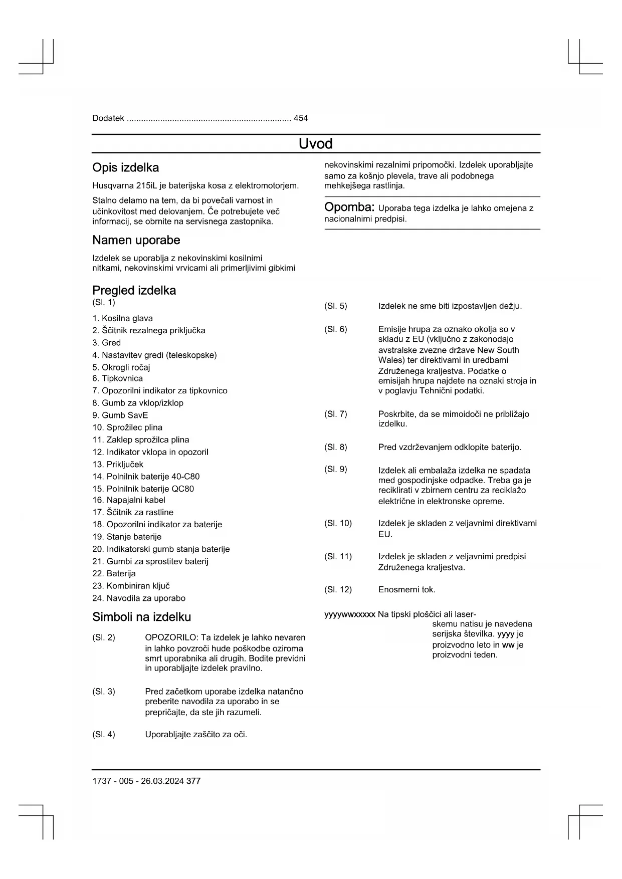 Simboli na izdelku (Sl. 2) OPOZORILO: Ta izdelek je lahko nevaren in lahko povzroči hude poškodbe oziroma smrt uporabnika ali drugih. Bodite previdni in uporabljajte izdelek pravilno. (Sl. 3) Pred začetkom uporabe izdelka natančno preberite navodila za uporabo in se prepričajte, da ste jih razumeli. (Sl. 4) Uporabljajte zaščito za oči. (Sl. 5) Izdelek ne sme biti izpostavljen dežju. (Sl. 6) Emisije hrupa za oznako okolja so v skladu z EU (vključno z zakonodajo avstralske zvezne države New South Wales) ter direktivami in uredbami Združenega kraljestva. Podatke o emisijah hrupa najdete na oznaki stroja in v poglavju Tehnični podatki. (Sl. 7) Poskrbite, da se mimoidoči ne približajo izdelku. (Sl. 8) Pred vzdrževanjem odklopite baterijo. (Sl. 9) Izdelek ali embalaža izdelka ne spadata med gospodinjske odpadke. Treba ga je reciklirati v zbirnem centru za reciklažo električne in elektronske opreme. (Sl. 10) Izdelek je skladen z veljavnimi direktivami EU. (Sl. 11) Izdelek je skladen z veljavnimi predpisi Združenega kraljestva. (Sl. 12) Enosmerni tok. yyyywwxxxxx Na tipski ploščici ali laser- skemu natisu je navedena serijska številka. yyyy je proizvodno leto in ww je proizvodni teden. 1737 - 005 - 26.03.2024 377Simboli na bateriji in/ali polnilniku baterije (Sl. 16) Izdelek je treba reciklirati v zbir- nem centru za reciklažo elek- trične in elektronske opreme. (velja samo za Evropo) (Sl. 13) Pretvornik za varno odpoved. (Sl. 14) Polnilnik baterije hranite in uporabljajte samo v zaprtih prostorih. (Sl. 15) Dvojna izolacija. Škoda izdelka Za škodo na izdelku ne odgovarjamo, če: