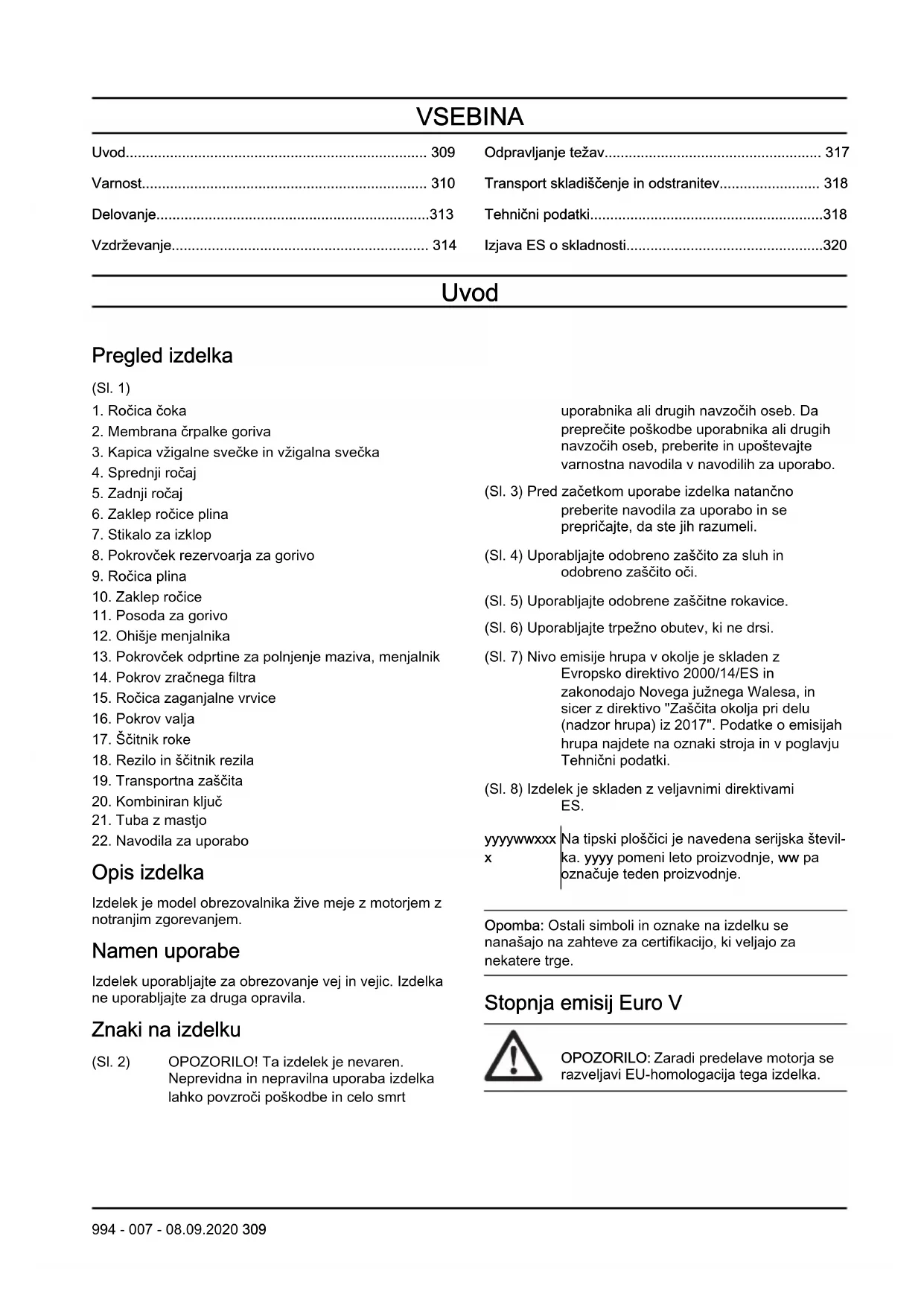 Na tipski ploščici je navedena serijska števil- ka. yyyy pomeni leto proizvodnje, ww pa označuje teden proizvodnje. Opomba: Ostali simboli in oznake na izdelku se nanašajo na zahteve za certifikacijo, ki veljajo za nekatere trge. Stopnja emisij Euro V OPOZORILO: Zaradi predelave motorja se razveljavi EU-homologacija tega izdelka.
