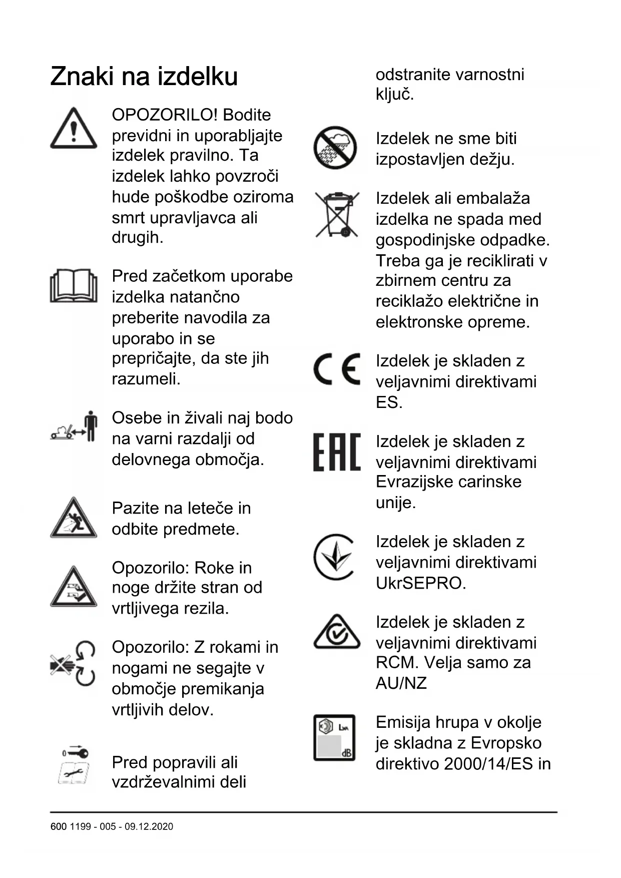 1199 - 005 - 09.12.2020 599Znaki na izdelku OPOZORILO! Bodite previdni in uporabljajte izdelek pravilno. Ta izdelek lahko povzroči hude poškodbe oziroma smrt upravljavca ali drugih. Pred začetkom uporabe izdelka natančno preberite navodila za uporabo in se prepričajte, da ste jih razumeli. Osebe in živali naj bodo na varni razdalji od delovnega območja. Pazite na leteče in odbite predmete. Opozorilo: Roke in noge držite stran od vrtljivega rezila. Opozorilo: Z rokami in nogami ne segajte v območje premikanja vrtljivih delov. Pred popravili ali vzdrževalnimi deli odstranite varnostni ključ. Izdelek ne sme biti izpostavljen dežju. Izdelek ali embalaža izdelka ne spada med gospodinjske odpadke. Treba ga je reciklirati v zbirnem centru za reciklažo električne in elektronske opreme. Izdelek je skladen z veljavnimi direktivami ES. Izdelek je skladen z veljavnimi direktivami Evrazijske carinske unije. Izdelek je skladen z veljavnimi direktivami UkrSEPRO. Izdelek je skladen z veljavnimi direktivami RCM. Velja samo za AU/NZ Emisija hrupa v okolje je skladna z Evropsko direktivo 2000/14/ES in 600 1199 - 005 - 09.12.2020zakonodajo Novega južnega Walesa, in sicer z direktivo "Zaščita okolja pri delu (nadzor hrupa) iz 2017". Podatke o emisijah hrupa najdete na oznaki stroja in v poglavju Tehnični podatki. Izdelek je zaščiten pred kapljicami. Zagonski postopek: pritisnite gumb za VKLOP/IZKLOP, sprostite blokado vžiga, in ročico zavore motorja potis- nite navzdol. Za zaustavitev sprostite ročico zavore motorja. Počasi Hitro Bralna koda Opomba: Ostali simboli in oznake na izdelku se nanašajo na zahteve za certifikacijo, ki veljajo za nekatere trge. Nalepke na izdelku Roke in noge držite stran od vrtljivih rezil. Odgovornost proizvajalca Kot je navedeno v zakonodaji, ki ureja odgovornost proizvajalca, ne prevzemamo nikakršne odgovornosti za poškodbe, ki bi jih naši izdelki povzročili v naslednjih primerih: