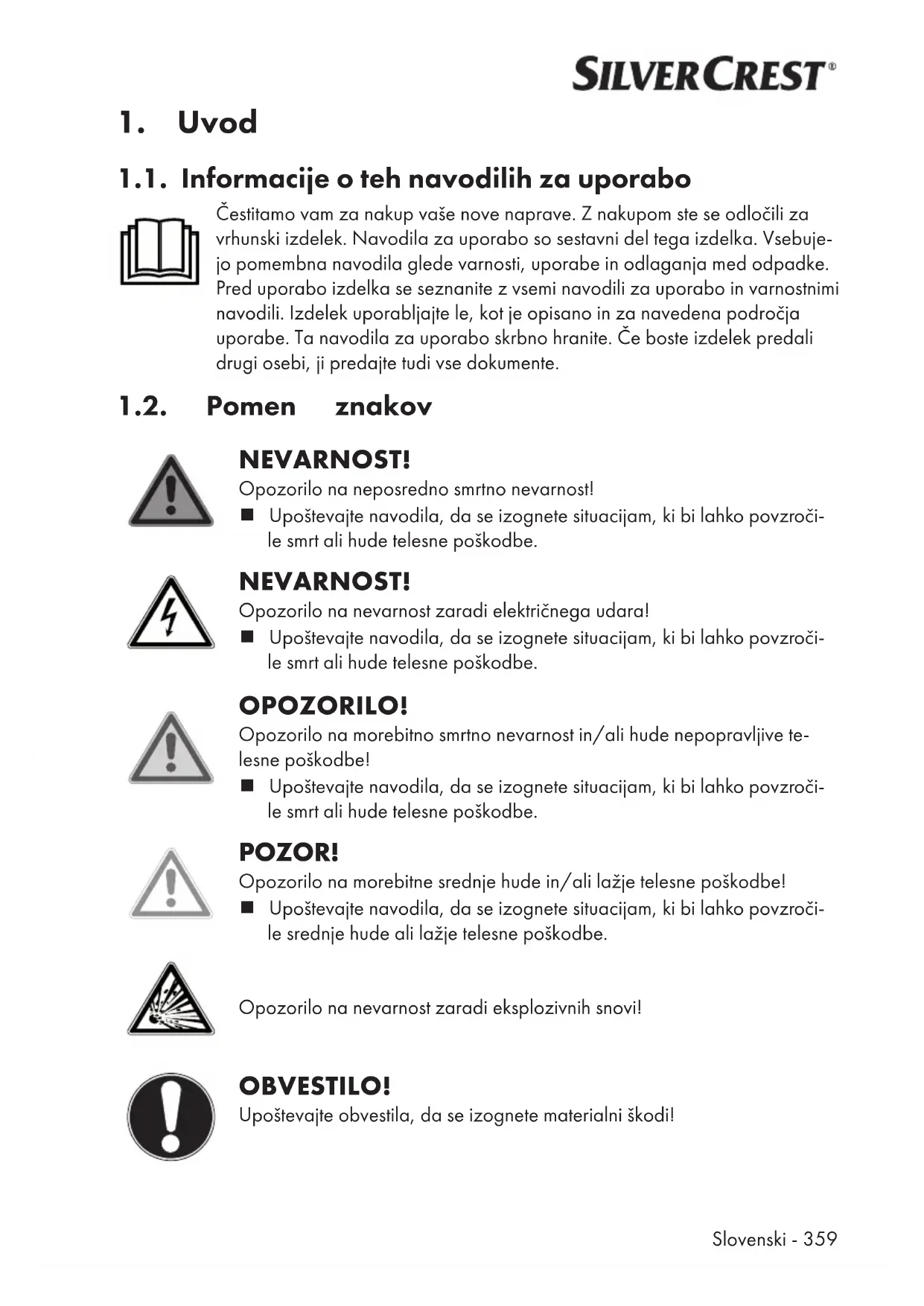 1.1. Informacije o teh navodilih za uporabo Čestitamo vam za nakup vaše nove naprave. Z nakupom ste se odločili za vrhunski izdelek. Navodila za uporabo so sestavni del tega izdelka. Vsebuje- jo pomembna navodila glede varnosti, uporabe in odlaganja med odpadke. Pred uporabo izdelka se seznanite z vsemi navodili za uporabo in varnostnimi navodili. Izdelek uporabljajte le, kot je opisano in za navedena področja uporabe. Ta navodila za uporabo skrbno hranite. Če boste izdelek predali drugi osebi, ji predajte tudi vse dokumente. 1.2. Pomen znakov NEVARNOST! Opozorilo na neposredno smrtno nevarnost! Upoštevajte navodila, da se izognete situacijam, ki bi lahko povzroči- le smrt ali hude telesne poškodbe. NEVARNOST! Opozorilo na nevarnost zaradi električnega udara! Upoštevajte navodila, da se izognete situacijam, ki bi lahko povzroči- le smrt ali hude telesne poškodbe. OPOZORILO! Opozorilo na morebitno smrtno nevarnost in/ali hude nepopravljive te- lesne poškodbe! Upoštevajte navodila, da se izognete situacijam, ki bi lahko povzroči- le smrt ali hude telesne poškodbe. POZOR! Opozorilo na morebitne srednje hude in/ali lažje telesne poškodbe! Upoštevajte navodila, da se izognete situacijam, ki bi lahko povzroči- le srednje hude ali lažje telesne poškodbe. Opozorilo na nevarnost zaradi eksplozivnih snovi! OBVESTILO! Upoštevajte obvestila, da se izognete materialni škodi!360 - Slovenski Dodatne informacije o uporabi naprave! Upoštevajte obvestila v navodilih za uporabo!
