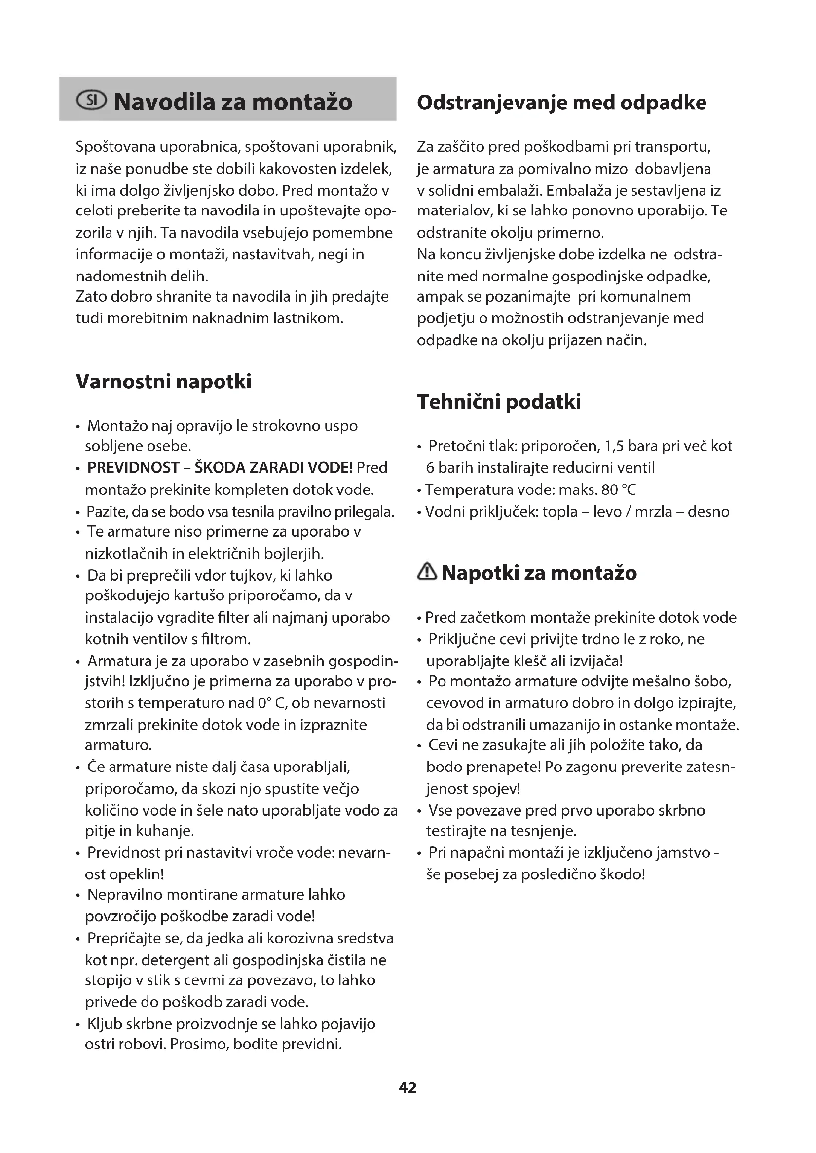 - Armatura je za uporabo v zasebnih gospodin- jstvih! Izključno je primerna za uporabo v pro- storih s temperaturo nad 0° C, ob nevarnosti zmrzali prekinite dotok vode in izpraznite armaturo.