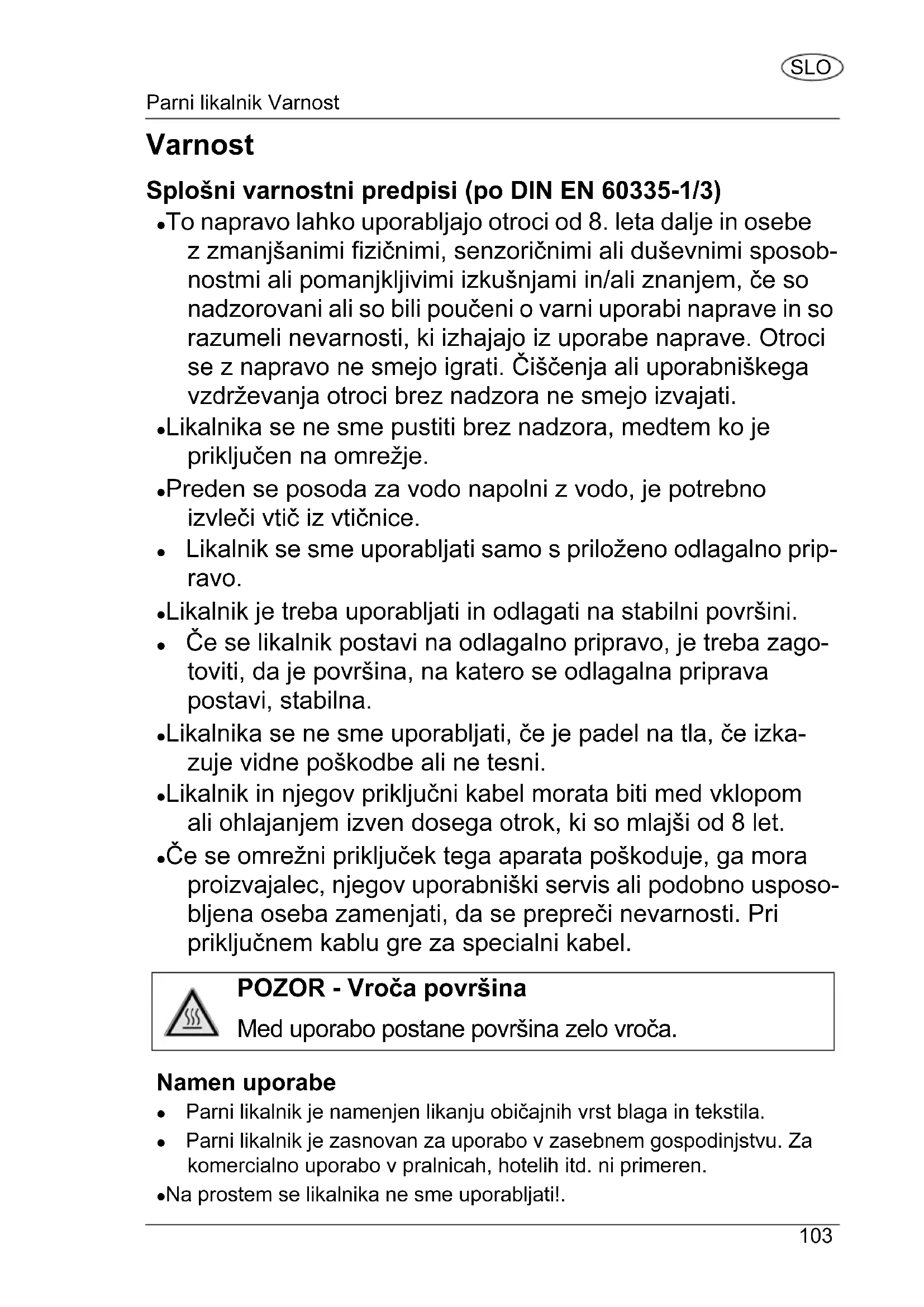 SLO Nevarnost za otroke in širši krog oseb Ta naprava ni namenjena za to, da jo uporabljajo osebe (vključno z otroci) z omejenimi fizičnimi, senzoričnimi ali duševnimi sposobnostmi ali s pomanjkljivimi izkušnjami in/ali s pomanjkljivim znanjem, razen če jih nadzoruje oseba, pristojna za njihovo varnost, ali so od nje prejeli navodila, kako je potrebno napravo uporabljati. Nadzorujte otroke, da zagotovite, da se ne igrajo z napravo. Embalažno vrečko in embalažne folije hranite proč od dojenčkov in majhnih otrok, obstaja nevarnost zadušitve! Nevarnost zaradi elektrike Likalnik se sme polniti z vodo. Vendar pa aparata samega ter električnega kabla in vtiča nikoli ne pomakajte v vodo ali drugo tekočino, ker sicer obstaja nevarnost električnega udara. Če je pri polnjenju voda stekla čez likalnik, se mora aparat najprej popolnoma posušiti, preden ga priključite. Aparat priključite na pravilno instalirano vtičnico z zaščitnimi kontakti, katerih napetost ustreza „Tehničnim podatkom“. Pazite na to, da je vtičnica dobro dosegljiva, da se jo po potrebi lahko z lahkoto izvleče iz omrežne vtičnice. Likalnika ne uporabljajte: - če je aparat poškodovan (npr. če ne tesni), - če je električni kabel ali vtič poškodovan, - ali če je aparat padel na tla. Pazite na to, da se električni kabel ne more poškodovati zaradi ostrih robov ali vročih predmetov, npr. zaradi vroče likalne površine. Likalnika ne pustite brez nadzora, dokler je priključen na omrežje. Izvlecite vtič iz vtičnice: - če aparata ne uporabljate ali ste likanje prekinili (tudi pri kratkih preki- nitvah!) - preden polnite ali praznite vodo iz aparata, - če med delovanjem očitno pride do okvare, - ob nevihtah. Pri tem vedno vlecite za vtič, ne za kabel. Omrežni vtič izvlecite iz vtičnice tudi takrat, ko želite likanje le kratko- trajno prekiniti. Vendar pa vedno obrnite regulator temperature na 0. Dampfbuegeleisen SLO E44317.book Seite 104 Montag, 10. Oktober 2011 11:02 11105 Parni likalnik Varnost SLO Ne izvajajte sprememb na aparatu ali na električnem kablu. Popravila naj izvaja strokovna delavnica, ker lahko nestrokovno popravljeni aparati ogrožajo uporabnika. Upoštevajte tudi priložene garancijske pogoje. Če se omrežni priključek tega aparata poškoduje, ga mora proizvajalec, njegov uporabniški servis ali podobno usposobljena oseba zamenjati, da se prepreči ogrožanje. Pri priključnem kablu gre za specialni kabel. Nevarnost opeklin/oparin in požara Likalna površina postane med uporabo zelo vroča. Ne dotikajte se je in likalnik prijemajte izključno za ročaj. Nikoli ne likajte Vaših oblačil ali drugega tekstila na telesu. Izstopajoča para je zelo vroča. Ne dotikajte se je. Nikoli ne usmerite likalne površine in izpusta pare v ljudi in živali. Likalnika nikoli ne postavite z vročo likalno površino navzdol na mizo, delovno ploščo ali podobno. Likalnik vedno postavite na njegovo stojno ploskev ali za to predvideno in ustrezno odlagalno površino Vaše likalne deske. Vedno uporabljajte stabilno, toplotno odporno in trdno podlago. Aparata ne pustite brez nadzora, ko se segreva ali še ohlaja. Pustite, da se likalnik popolnoma ohladi, preden ga čistite ali pospravite. Nevarnost pred poškodbami zaradi drugih vzrokov Pazite na to, da električni kabel ne predstavlja nevarnosti za spotikanje. Pozor - škode na stvareh Z likalnikom likajte le tekstil, ki je za to predviden in primeren. V kolikor niste gotovi, ali je tekstil primeren za izbrane nastavitve, likajte najprej na nevidnem mestu za preizkus. Likalnik vedno odložite tako, da ne more pasti. Pri tem ga vedno posta- vite na njegovo stojno ploskev ali na za to predvideno in primerno odlagalno površino Vaše likalne deske. Pred uporabo električni kabel popolnoma odvijte. Ponovno ga navijte šele, ko je likalnik popolnoma ohlajen. Upoštevajte napotke in simbole v tekstilu za likanje. Simboli na regula- torju temperature ustrezajo običajnim simbolom za nego. Likalnika ne čistite s kovinskimi gobicami, čistilnimi sredstvi, ki drgnejo ali praskajo. Le-ti bi lahko likalno površino poškodovali. Dampfbuegeleisen SLO E44317.book Seite 105 Montag, 10. Oktober 2011 11:02 11Parni likalnik Uporaba