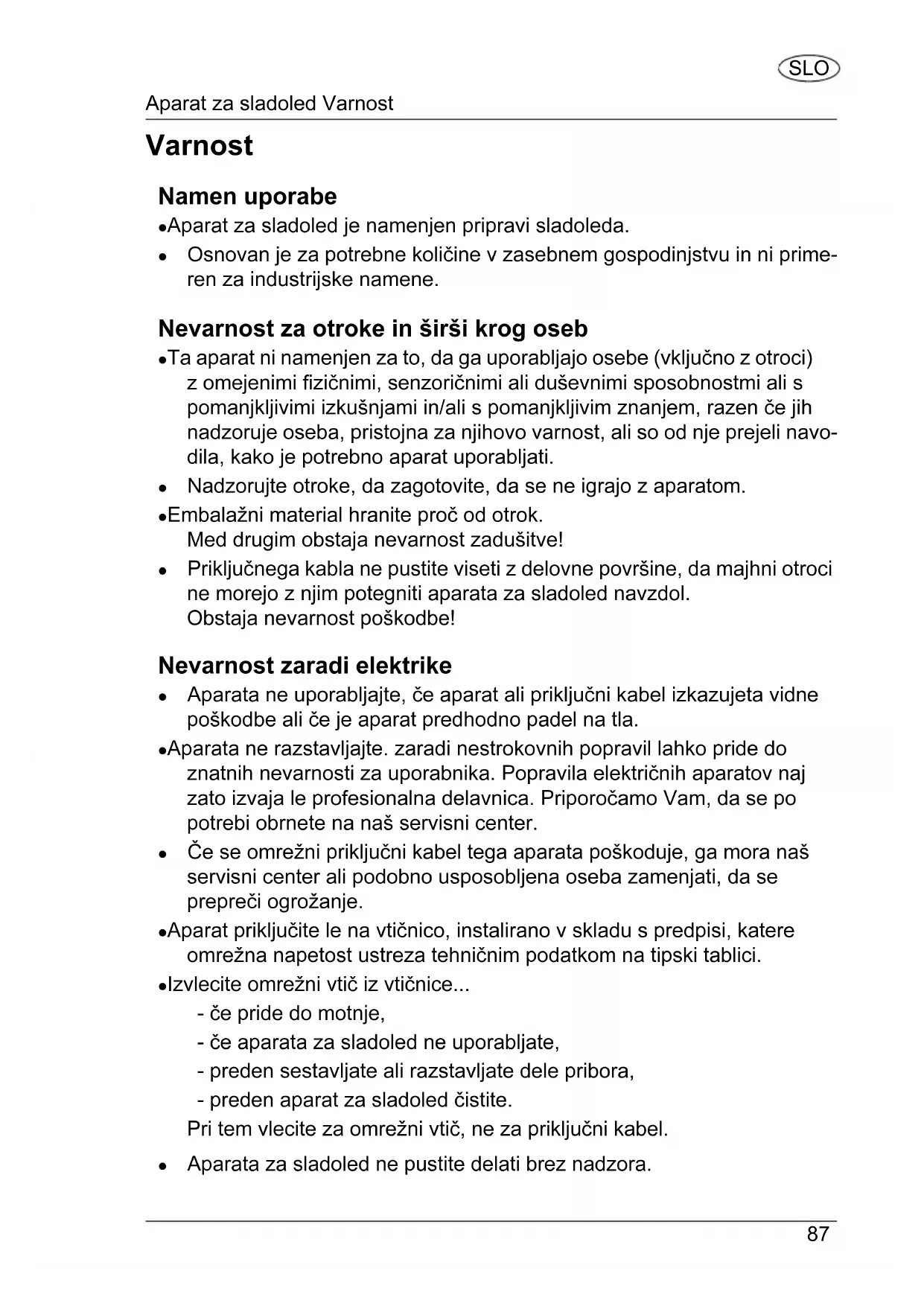 - Garancijski list 7 Aparat za sladoled Varnost SLO Varnost Namen uporabe Aparat za sladoled je namenjen pripravi sladoleda. Osnovan je za potrebne količine v zasebnem gospodinjstvu in ni prime- ren za industrijske namene. Nevarnost za otroke in širši krog oseb Ta aparat ni namenjen za to, da ga uporabljajo osebe (vključno z otroci) z omejenimi fizičnimi, senzoričnimi ali duševnimi sposobnostmi ali s pomanjkljivimi izkušnjami in/ali s pomanjkljivim znanjem, razen če jih nadzoruje oseba, pristojna za njihovo varnost, ali so od nje prejeli navo- dila, kako je potrebno aparat uporabljati. Nadzorujte otroke, da zagotovite, da se ne igrajo z aparatom. Embalažni material hranite proč od otrok. Med drugim obstaja nevarnost zadušitve! Priključnega kabla ne pustite viseti z delovne površine, da majhni otroci ne morejo z njim potegniti aparata za sladoled navzdol. Obstaja nevarnost poškodbe! Nevarnost zaradi elektrike Aparata ne uporabljajte, če aparat ali priključni kabel izkazujeta vidne poškodbe ali če je aparat predhodno padel na tla. Aparata ne razstavljajte. zaradi nestrokovnih popravil lahko pride do znatnih nevarnosti za uporabnika. Popravila električnih aparatov naj zato izvaja le profesionalna delavnica. Priporočamo Vam, da se po potrebi obrnete na naš servisni center. Če se omrežni priključni kabel tega aparata poškoduje, ga mora naš servisni center ali podobno usposobljena oseba zamenjati, da se prepreči ogrožanje. Aparat priključite le na vtičnico, instalirano v skladu s predpisi, katere omrežna napetost ustreza tehničnim podatkom na tipski tablici. Izvlecite omrežni vtič iz vtičnice - če pride do motnje, - če aparata za sladoled ne uporabljate, - preden sestavljate ali razstavljate dele pribora, - preden aparat za sladoled čistite. Pri tem vlecite za omrežni vtič, ne za priključni kabel. Aparata za sladoled ne pustite delati brez nadzora.Aparat za sladoled Varnost p. 1008