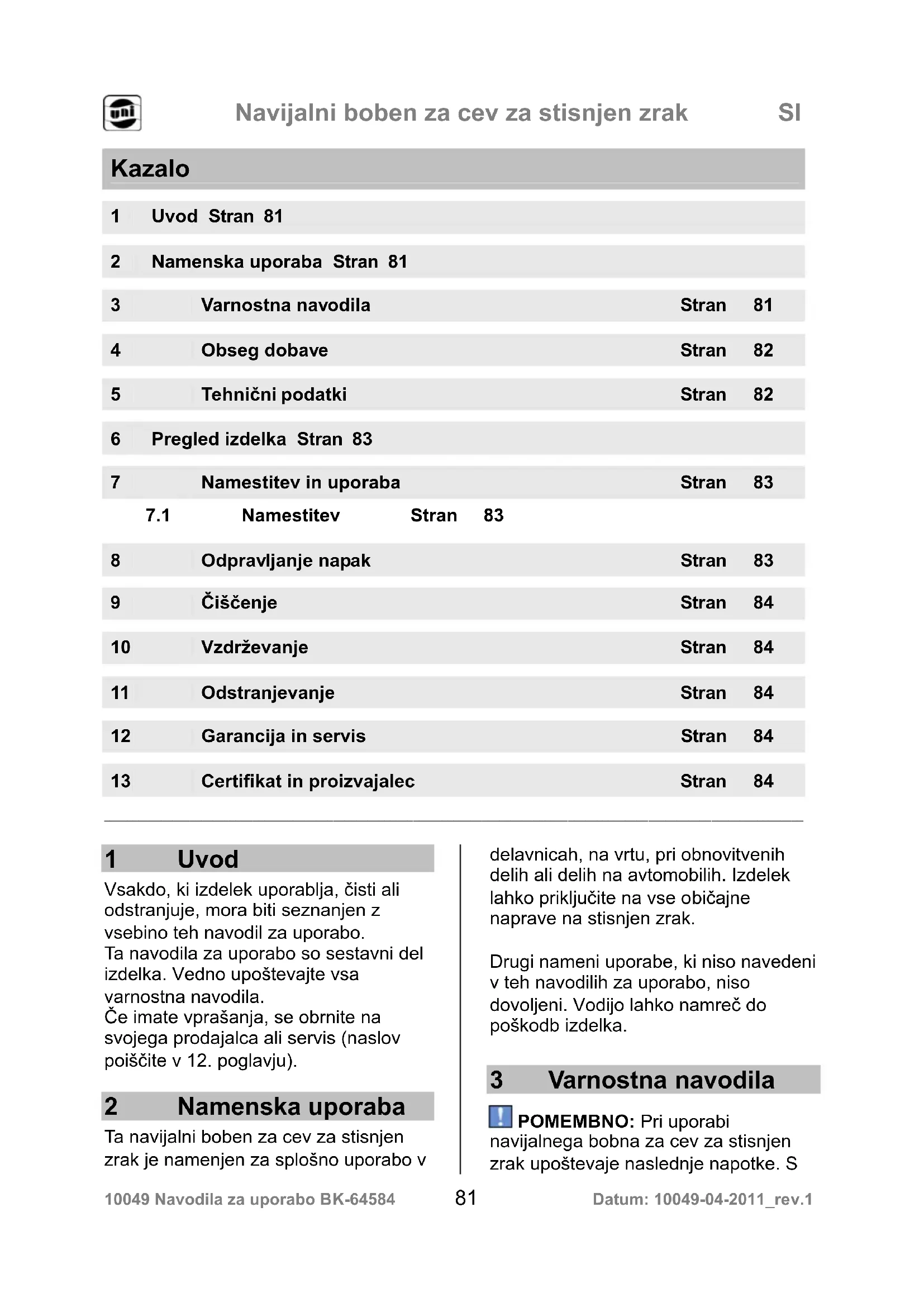 - Zaščitite cev za stisnjen zrak. Cev za stisnjen zrak zaščitite pred oljem, kislino, ostrimi robovi in visokimi temperaturami. Če tega ne upoštevate, lahko pride do okvar. 4 Obseg dobave Takoj ob razpakiranju izdelka, preverite, ali je dobavljeni komplet popoln in ali je izdelek v brezhibnem stanju. 1 x navijalni boben za cev za stisnjen zrak 5 Tehnični podatki Izdelek: Navijalni boben za cev za stisnjen zrak Številka artikla: 10049Navijalni boben za cev za stisnjen zrak SI 10049 Navodila za uporabo BK-64584 83 Datum: 10049-04-2011_rev.1 Klasifikacija: Gibljiva PVC cev za stisnjenzrak, prozorna modra z ojačevalno mrežo Delovna temperatura: –20 °C do +60 °C Dolžina cevi: pribl. 20 m Premer: 6/12 mm Maks. tlak: maks. 15 bar Priključki: Priključek in medeninasta enoročna hitra spojka Stojalo: pocinkana jeklena cev z vodilom za cev Ohišje: Plastično vreteno Mere (v x g x š): 35,5 x 19 x 28,5 cm 6 Pregled izdelka V tem poglavju boste našli predstavitev delov za upravljanje, sliko izdelka in kratek opis funkcij. V naslednjem poglavju (7. poglavje) bodo funkcije podrobneje opisane. Slika 1: Pregled naprave – navijalni boben za cev za stisnjen zrak Št. Poimenovanje Funkcija 1 Stojalo z vodilom za cev Poenostavi navijanje in odvijanje cevi za stisnjen zrak 2 Cev za stisnjen zrak Povezava orodje – cev – kompresor 3 Priključki Enoročno upravljanje Tabela 2: Deli bobna za cev za stisnjen zrak 7 Namestitev in uporaba POMEMBNO: To poglavje opisuje osnovne funkcije bobna za cev za stisnjen zrak. Poglavje pozorno preberite, da boste razumeli možnosti in funkcije in da boste lahko izdelek uporabljali. Upoštevajte naslednja navodila, zlasti varnostna navodila, da bi se izognili napakam pri upravljanju in okvaram. V primeru težav si oglejte Odpravljanje težav (8. poglavje) ali pa se obrnite na naš servis (kontakt: gl. 12. poglavje). Upoštevajte varnostna navodila (glejte
