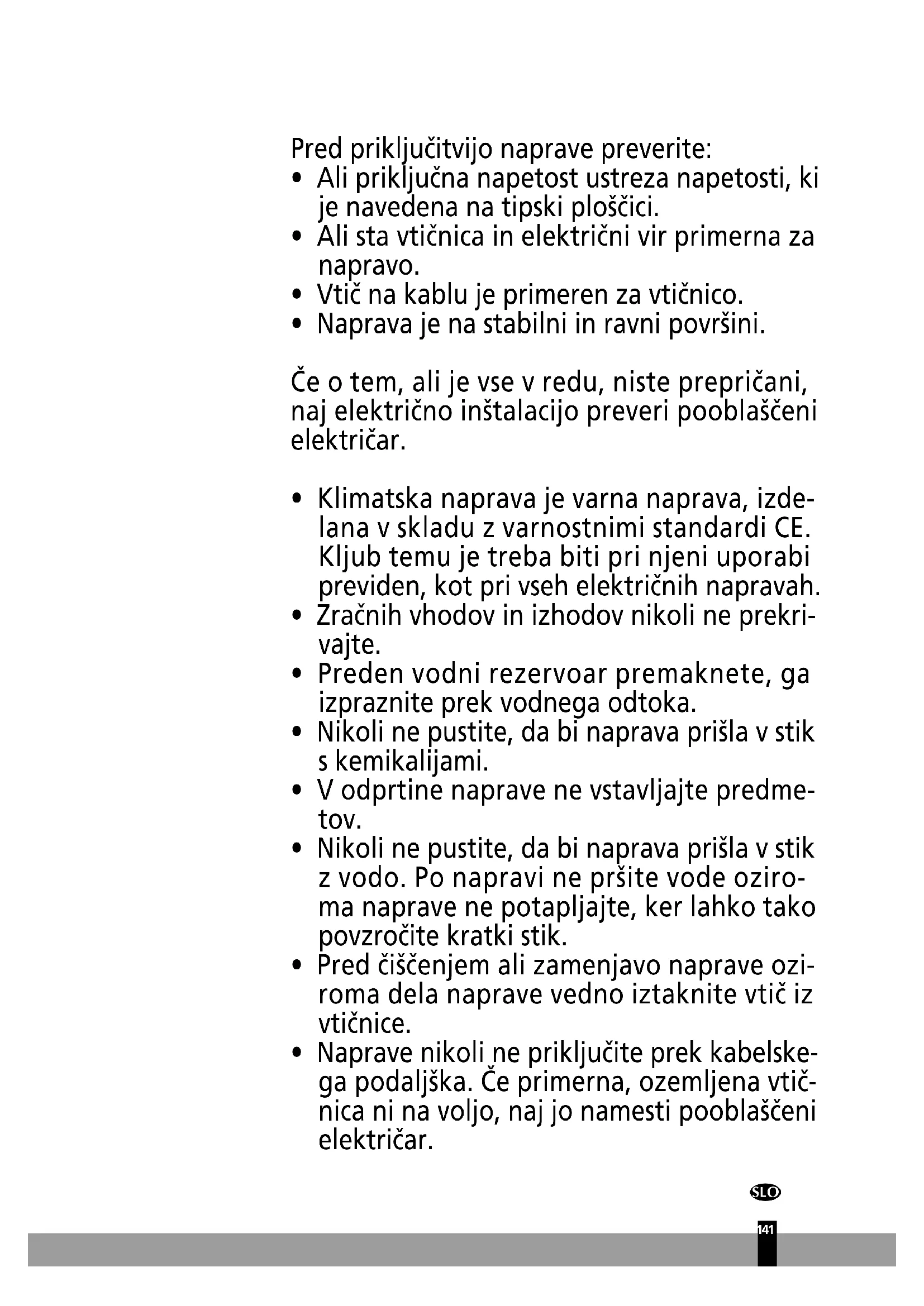 - Klimatska naprava je varna naprava, izde- lana v skladu z varnostnimi standardi CE. Kljub temu je treba biti pri njeni uporabi previden, kot pri vseh električnih napravah.