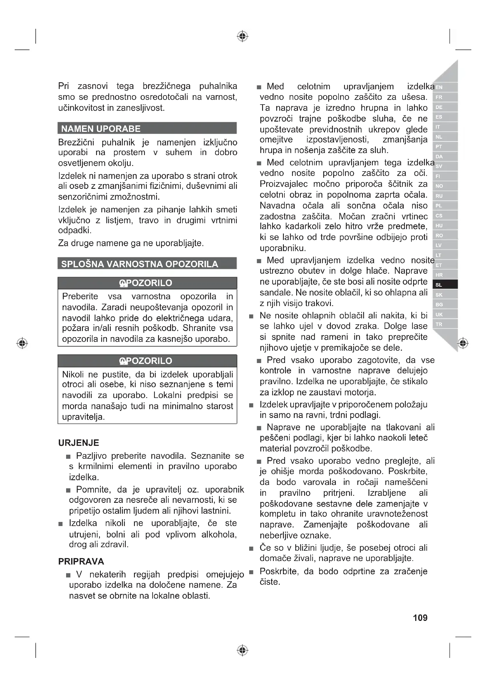 OPOZORILO Preberite vsa varnostna opozorila in navodila. Zaradi neupoštevanja opozoril in navodil lahko pride do električnega udara, požara in/ali resnih poškodb. Shranite vsa opozorila in navodila za kasnejšo uporabo. OPOZORILO Nikoli ne pustite, da bi izdelek uporabljali otroci ali osebe, ki niso seznanjene s temi navodili za uporabo. Lokalni predpisi se morda nanašajo tudi na minimalno starost upravitelja. URJENJE ■ Pazljivo preberite navodila. Seznanite se s krmilnimi elementi in pravilno uporabo izdelka. ■ Pomnite, da je upravitelj oz. uporabnik odgovoren za nesreče ali nevarnosti, ki se pripetijo ostalim ljudem ali njihovi lastnini. ■ Izdelka nikoli ne uporabljajte, če ste utrujeni, bolni ali pod vplivom alkohola, drog ali zdravil. PRIPRAVA ■ V nekaterih regijah predpisi omejujejo uporabo izdelka na določene namene. Za nasvet se obrnite na lokalne oblasti. ■ Med celotnim upravljanjem izdelka vedno nosite popolno zaščito za ušesa. Ta naprava je izredno hrupna in lahko povzroči trajne poškodbe sluha, če ne upoštevate previdnostnih ukrepov glede omejitve izpostavljenosti, zmanjšanja hrupa in nošenja zaščite za sluh. ■ Med celotnim upravljanjem tega izdelka vedno nosite popolno zaščito za oči. Proizvajalec močno priporoča ščitnik za celotni obraz in popolnoma zaprta očala. Navadna očala ali sončna očala niso zadostna zaščita. Močan zračni vrtinec lahko kadarkoli zelo hitro vrže predmete, ki se lahko od trde površine odbijejo proti uporabniku. ■ Med upravljanjem izdelka vedno nosite ustrezno obutev in dolge hlače. Naprave ne uporabljajte, če ste bosi ali nosite odprte sandale. Ne nosite oblačil, ki so ohlapna ali z njih visijo trakovi. ■ Ne nosite ohlapnih oblačil ali nakita, ki bi se lahko ujel v dovod zraka. Dolge lase si spnite nad rameni in tako preprečite njihovo ujetje v premikajoče se dele. ■ Pred vsako uporabo zagotovite, da vse kontrole in varnostne naprave delujejo pravilno. Izdelka ne uporabljajte, če stikalo za izklop ne zaustavi motorja. ■ Izdelek upravljajte v priporočenem položaju in samo na ravni, trdni podlagi. ■ Naprave ne uporabljajte na tlakovani ali peščeni podlagi, kjer bi lahko naokoli leteč material povzročil poškodbe. ■ Pred vsako uporabo vedno preglejte, ali je ohišje morda poškodovano. Poskrbite, da bodo varovala in ročaji nameščeni in pravilno pritrjeni. Izrabljene ali poškodovane sestavne dele zamenjajte v kompletu in tako ohranite uravnoteženost naprave. Zamenjajte poškodovane ali neberljive oznake. ■ Če so v bližini ljudje, še posebej otroci ali domače živali, naprave ne uporabljajte. ■ Poskrbite, da bodo odprtine za zračenje čiste.110 | Slovensko