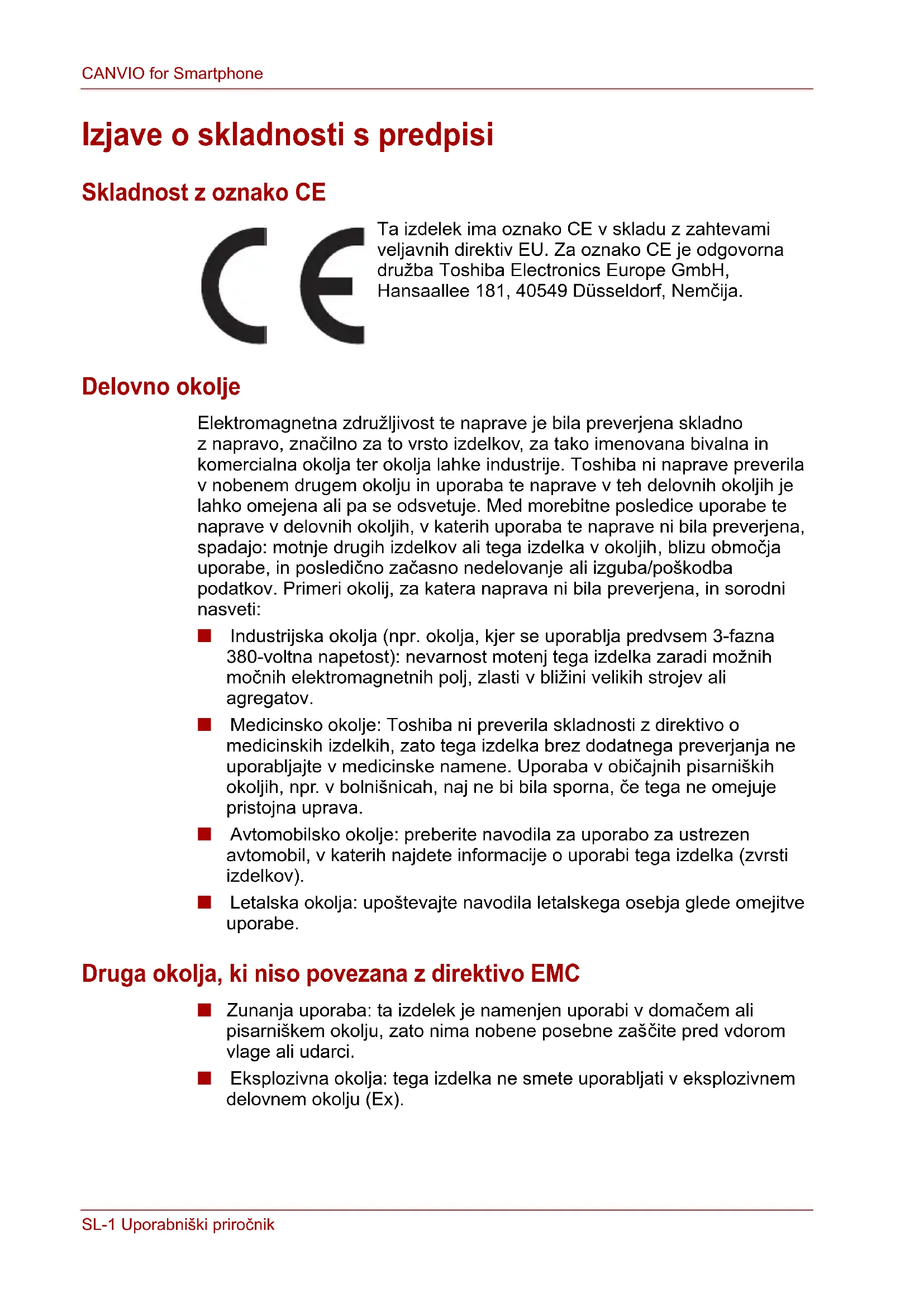je registrovaná ochranná známka spoločnosti Microsoft Corporation v Spojených štátoch amerických alebo ďalších krajinách. USB Type-C™ je ochranná známka spoločnosti USB Implementers Forum. Iné ochranné známky spomenuté alebo zobrazené v tomto dokumente sú majetkom ich príslušných vlastníkov. Spoločnosť nezodpovedá za chyby a vynechané časti.SL-1 Uporabniški priročnik CANVIO for Smartphone Uporabniški priročnik Izjave o skladnosti s predpisi Skladnost z oznako CE Ta izdelek ima oznako CE v skladu z zahtevami veljavnih direktiv EU. Za oznako CE je odgovorna družba Toshiba Electronics Europe GmbH, Hansaallee 181, 40549 Düsseldorf, Nemčija. Delovno okolje Elektromagnetna združljivost te naprave je bila preverjena skladno z napravo, značilno za to vrsto izdelkov, za tako imenovana bivalna in komercialna okolja ter okolja lahke industrije. Toshiba ni naprave preverila v nobenem drugem okolju in uporaba te naprave v teh delovnih okoljih je lahko omejena ali pa se odsvetuje. Med morebitne posledice uporabe te naprave v delovnih okoljih, v katerih uporaba te naprave ni bila preverjena, spadajo: motnje drugih izdelkov ali tega izdelka v okoljih, blizu območja uporabe, in posledično začasno nedelovanje ali izguba/poškodba podatkov. Primeri okolij, za katera naprava ni bila preverjena, in sorodni nasveti: ■ Industrijska okolja (npr. okolja, kjer se uporablja predvsem 3-fazna 380-voltna napetost): nevarnost motenj tega izdelka zaradi možnih močnih elektromagnetnih polj, zlasti v bližini velikih strojev ali agregatov. ■ Medicinsko okolje: Toshiba ni preverila skladnosti z direktivo o medicinskih izdelkih, zato tega izdelka brez dodatnega preverjanja ne uporabljajte v medicinske namene. Uporaba v običajnih pisarniških okoljih, npr. v bolnišnicah, naj ne bi bila sporna, če tega ne omejuje pristojna uprava. ■ Avtomobilsko okolje: preberite navodila za uporabo za ustrezen avtomobil, v katerih najdete informacije o uporabi tega izdelka (zvrsti izdelkov). ■ Letalska okolja: upoštevajte navodila letalskega osebja glede omejitve uporabe. Druga okolja, ki niso povezana z direktivo EMC ■ Zunanja uporaba: ta izdelek je namenjen uporabi v domačem ali pisarniškem okolju, zato nima nobene posebne zaščite pred vdorom vlage ali udarci. ■ Eksplozivna okolja: tega izdelka ne smete uporabljati v eksplozivnem delovnem okolju (Ex).Uporabniški priročnik SL-2 CANVIO for Smartphone Spodnje informacije veljajo samo za države članice EU: REACH – izjava o skladnosti Nova uredba o kemikalijah Evropske unije (EU), REACH (registracija, evalvacija, avtorizacija in omejevanje kemikalij), je začela veljati 1. junija 2007. Izdelki družbe Toshiba so skladni z vsemi zahtevami uredbe REACH, družba pa svojim strankam zagotavlja informacije o kemičnih snoveh v njenih izdelkih v skladu z uredbo REACH. Odstranjevanje izdelkov Uporaba znaka pomeni, da izdelka ni mogoče obravnavati kot gospodinjskega odpadka. Če zagotovite pravilno odlaganje tega izdelka, pomagate preprečiti morebitne negativne posledice za okolje in človekovo zdravje, ki bi lahko nastale zaradi nepravilnega ravnanja z odpadki tega izdelka. Če želite podrobnejše informacije o recikliranju tega izdelka, se obrnite na lokalne oblasti, službo za odlaganje gospodinjskih odpadkov ali na trgovino, kjer ste kupili izdelek.SL-3 Uporabniški priročnik CANVIO for Smartphone Ikone varnosti V tem priročniku so varnostna navodila, ki jih morate upoštevati, da se izognete morebitnim nevarnostim, ki lahko povzročijo telesne poškodbe, poškodbe opreme ali izgubo podatkov. Varnostne informacije so razvrščene glede na resnost tveganja. Za označevanje stopenj tveganja so uporabljene te ikone: Druge uporabljene ikone Dodatne ikone označujejo druge uporabne ali poučne informacije: Opozorilne besede Pomen Označuje neposredno nevarnost, ki bo povzročila smrt ali hudo telesno poškodbo, če se ji ne izognete. Označuje morebitno nevarnost, ki bi lahko povzročila smrt ali hude telesne poškodbe, če se ji ne izognete. Označuje morebitno nevarnost, ki bi lahko povzročila lažje ali zmerne telesne poškodbe, če se ji ne izognete. Označuje postopke, ki lahko povzročijo materialno škodo in druge težave, vendar ne telesnih poškodb. Navaja pomembne informacije *Hude poškodbe, med drugim slepota, rane, opekline (nizka in visoka temperatura), električni udar, zlomi, zastrupitev in druge, z dolgoročnimi posledicami ali hospitalizacijo in/ali dolgoročnim zdravljenjem v bolnišnici. *Med lažje ali zmerne poškodbe spadajo rane, opekline, električni udar in druge, za katere ni potrebna hospitalizacija in/ali dolgoročno zdravljenje v bolnišnici. *Materialna škoda je škoda na napravi. NEVARNOST OPOZORILO PREVIDNO OBVESTILO OPOMBA TEHNIČNO OBVESTILO: ta ikona označuje tehnične informacije o napravi. NAMIG: ta ikona označuje uporabne namige in nasvete. DEFINICIJA: ta ikona označuje definicijo izraza, uporabljenega v besedilu.Uporabniški priročnik SL-4 CANVIO for Smartphone Kazalo vsebine Uvod ......................................................................................................SL-5 Pregled.............................................................................................SL-5 Funkcije............................................................................................SL-5