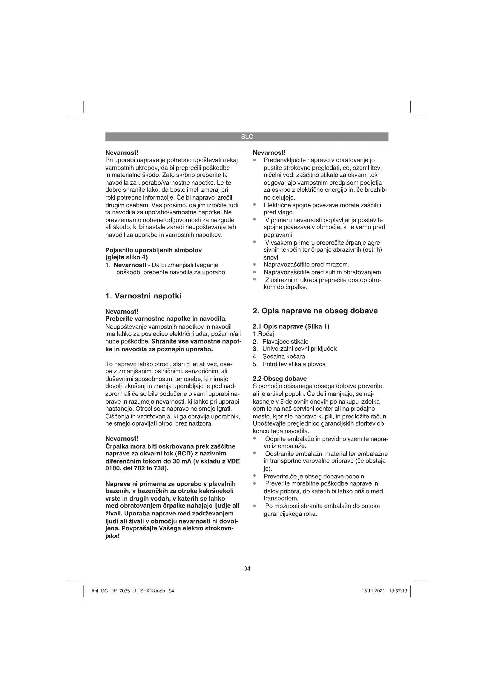 Nevarnost! Preberite varnostne napotke in navodila. Neupoštevanje varnostnih napotkov in navodil ima lahko za posledico električni udar, požar in/ali hude poškodbe. Shranite vse varnostne napot- ke in navodila za poznejšo uporabo. To napravo lahko otroci, stari 8 let ali več, ose- be z zmanjšanimi psihičnimi, senzoričnimi ali duševnimi sposobnostmi ter osebe, ki nimajo dovolj izkušenj in znanja uporabljajo le pod nad- zorom ali če so bile podučene o varni uporabi na- prave in razumejo nevarnosti, ki lahko pri uporabi nastanejo. Otroci se z napravo ne smejo igrati. Čiščenja in vzdrževanja, ki ga opravlja uporabnik, ne smejo opravljati otroci brez nadzora. Nevarnost! Črpalka mora biti oskrbovana prek zaščitne naprave za okvarni tok (RCD) z nazivnim diferenčnim tokom do 30 mA (v skladu z VDE 0100, del 702 in 738). Naprava ni primerna za uporabo v plavalnih bazenih, v bazenčkih za otroke kakršnekoli vrste in drugih vodah, v katerih se lahko med obratovanjem črpalke nahajajo ljudje ali živali. Uporaba naprave med zadrževanjem ljudi ali živali v območju nevarnosti ni dovol- jena. Povprašajte Vašega elektro strokovn- jaka! Nevarnost!