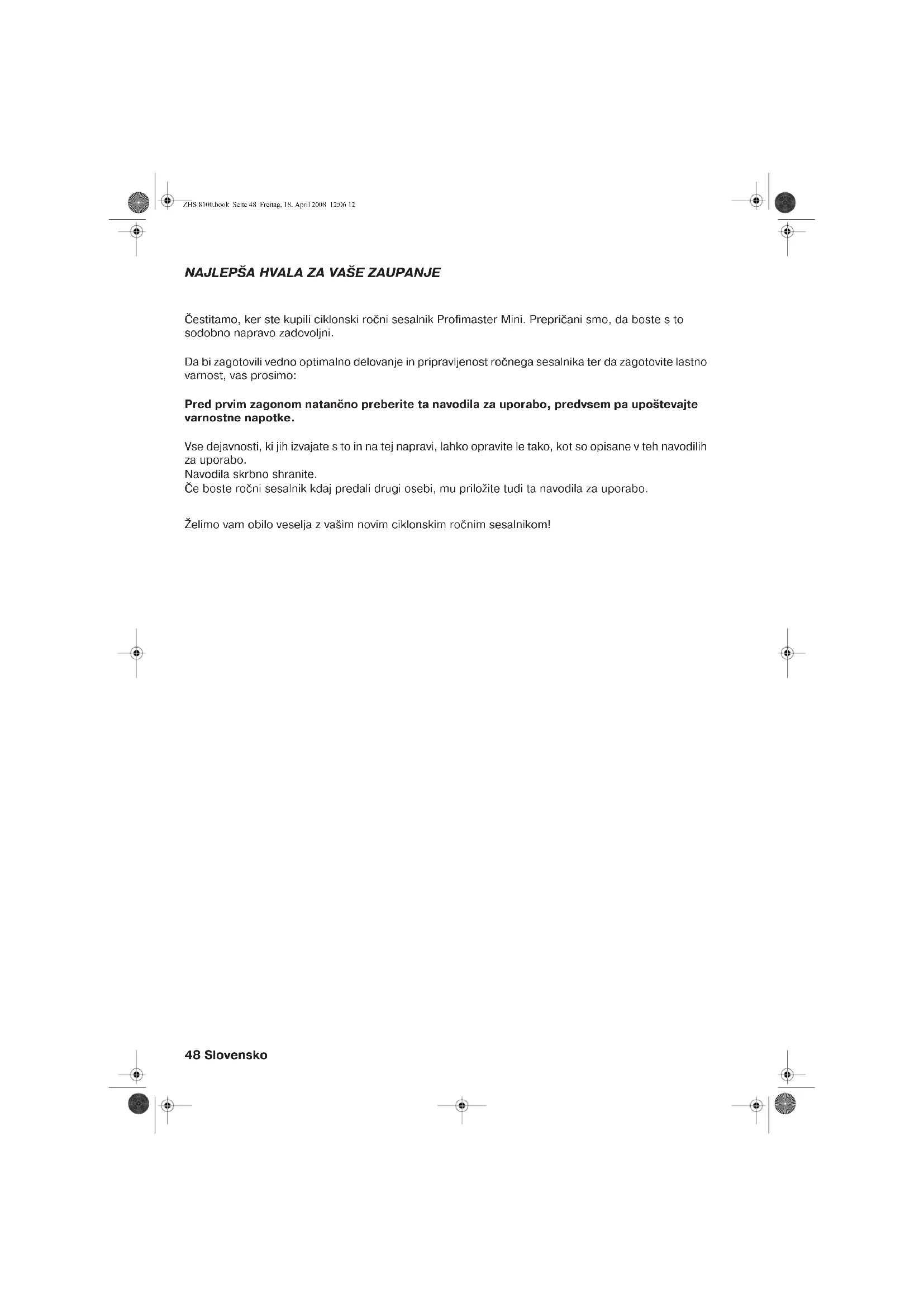 ZHS 8100.book Seite 47 Freitag, 18. April 2008 1:05 1348 Slovensko NAJLEPŠA HVALA ZA VAŠE ZAUPANJE Čestitamo, ker ste kupili ciklonski ročni sesalnik Profimaster Mini. Prepričani smo, da boste s to sodobno napravo zadovoljni. Da bi zagotovili vedno optimalno delovanje in pripravljenost ročnega sesalnika ter da zagotovite lastno varnost, vas prosimo: Pred prvim zagonom natančno preberite ta navodila za uporabo, predvsem pa upoštevajte varnostne napotke. Vse dejavnosti, ki jih izvajate s to in na tej napravi, lahko opravite le tako, kot so opisane v teh navodilih za uporabo. Navodila skrbno shranite. Če boste ročni sesalnik kdaj predali drugi osebi, mu priložite tudi ta navodila za uporabo. Želimo vam obilo veselja z vašim novim ciklonskim ročnim sesalnikom! ZHS 8100.book Seite 48 Freitag, 18. April 2008 12:06 12Slovensko 49