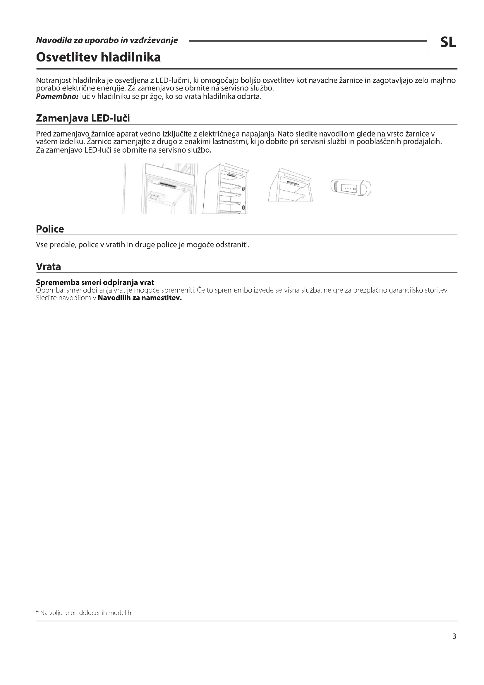 Navodila za uporabo in vzdrževanje Osvetlitev hladilnika Notranjost hladilnika je osvetljena z LED-lučmi, ki omogočajo boljšo osvetlitev kot navadne žarnice in zagotavljajo zelo majhno porabo električne energije. Za zamenjavo se obrnite na servisno službo. Pomembno: luč v hladilniku se prižge, ko so vrata hladilnika odprta. Zamenjava LED-luči Pred zamenjavo žarnice aparat vedno izključite z električnega napajanja. Nato sledite navodilom glede na vrsto žarnice v vašem izdelku. Žarnico zamenjajte z drugo z enakimi lastnostmi, ki jo dobite pri servisni službi in pooblaščenih prodajalcih. Za zamenjavo LED-luči se obrnite na servisno službo. Police Vse predale, police v vratih in druge police je mogoče odstraniti. Vrata Sprememba smeri odpiranja vrat Opomba: smer odpiranja vrat je mogoče spremeniti. Če to spremembo izvede servisna služba, ne gre za brezplačno garancijsko storitev. Sledite navodilom v Navodilih za namestitev.* Na voljo le pri določenih modelih4 Navodila za uporabo in vzdrževanje Uporaba aparata Prva uporaba Po namestitvi počakajte vsaj dve uri, preden aparat priključite na električno omrežje. Ko aparat priključite na električno omrežje, se samodejno vklopi. Idealne temperature za shranjevanje živil so tovarniško prednastavljene. Po vklopu aparata morate počakati 4–6 ur, da je temperatura primerna za običajno napolnjen aparat. Protibakterijski lter za preprečevanje vonjav namestite v ventilator, kot je prikazano na embalaži ltra (če je na voljo). Če se zasliši zvočni signal, to pomeni, da je temperaturni alarm vklopljen: pritisnite tipko za izklop zvočnega alarma. Hladilni prostor in shranjevanje živil Hladilni prostor omogoča shranjevanje svežih živil in pijače. Hladilni prostor se odmrzuje popolnoma samodejno. Občasna pojavitev vodnih kapljic na zadnji steni v notranjosti hladilnega prostora je znak, da je samodejno odmrzovanje v teku. Vodo, ki nastane med odmrzovanjem, sistem odvede v odtok in naprej v posodo, v kateri izhlapi. Opomba: notranji temperaturi obeh hladilnih prostorov sta lahko odvisni od temperature okolice, pogostosti odpiranja vrat in položaja aparata. Temperaturo nastavite glede na naslednje dejavnike. V zelo vlažnih pogojih se v hladilnem prostoru lahko nabere kondenzat, še posebej na steklenih policah. V tem primeru priporočamo, da zaprete embalaže s tekočinami (npr. lonec juhe), zavijete živila z visoko vsebnostjo vode (npr. zelenjavo) in vklopite ventilator, če je na voljo. Vse predale, police v vratih in druge police je mogoče odstraniti. Vsestranska porazdelitev zraka Vsestranska porazdelitev zraka prispeva k enakomernemu kroženju hladnega zraka v prostoru in s tem k boljši obstojnosti živil. Živila lahko odložite na katero koli polico aparata. Da omogočite prosto kroženje zraka, ne blokirajte prezračevalnih odprtin. Shranjevanje svežih živil in pijače Živila, ki oddajajo večjo količino etilena (jabolka, marelice, hruške, breskve, avokado, ge, slive, borovnice, melone, žol) ali so občutljiva na ta plin, npr. sadje, zelenjava in solata, vedno ločite ali zavijte, da se jim ne zmanjša obstojnost; ne shranjujte npr. paradižnikov skupaj s kiviji ali zeljem. Ne shranjujte živil preveč skupaj, da omogočite boljši pretok zraka. Živila zavijajte v plastično folijo ali jih shranjujte v plastičnih, kovinskih, aluminijastih in steklenih posodah, ki jih je mogoče reciklirati. Če v hladilniku shranjujete manjšo količino hrane, priporočamo uporabo polic nad predalom za sadje in zelenjavo, saj je to najhladnejši predel v hladilniku. Tekočine in živila, s katerih ali na katere se lahko prenaša vonj ali okus, shranjujte v zaprtih posodah ali jih pokrijte. Uporabljajte ločilnik steklenic, da se steklenice ne prevrnejo (na voljo pri izbranih modelih).