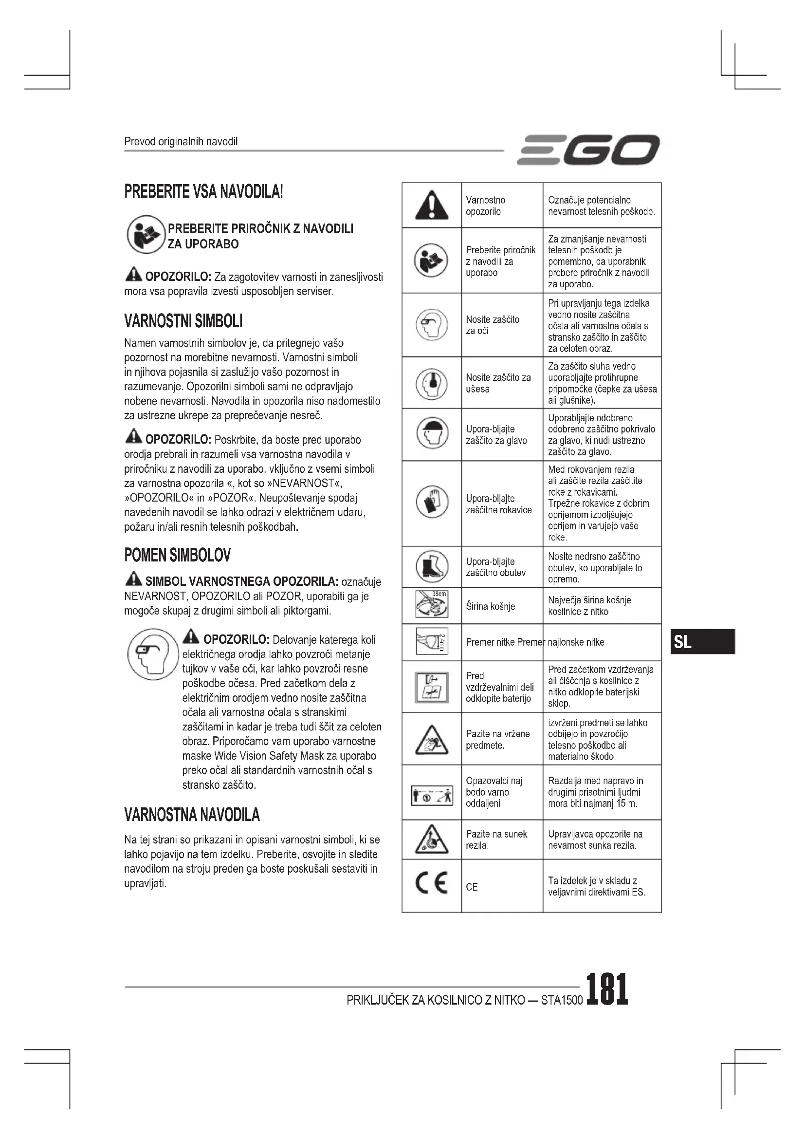ZA UPORABO OPOZORILO: Za zagotovitev varnosti in zanesljivosti mora vsa popravila izvesti usposobljen serviser. VARNOSTNI SIMBOLI Namen varnostnih simbolov je, da pritegnejo vašo pozornost na morebitne nevarnosti. Varnostni simboli in njihova pojasnila si zaslužijo vašo pozornost in razumevanje. Opozorilni simboli sami ne odpravljajo nobene nevarnosti. Navodila in opozorila niso nadomestilo za ustrezne ukrepe za preprečevanje nesreč. OPOZORILO: Poskrbite, da boste pred uporabo orodja prebrali in razumeli vsa varnostna navodila v priročniku z navodili za uporabo, vključno z vsemi simboli za varnostna opozorila «, kot so »NEVARNOST«, »OPOZORILO« in »POZOR«. Neupoštevanje spodaj navedenih navodil se lahko odrazi v električnem udaru, požaru in/ali resnih telesnih poškodbah. POMEN SIMBOLOV SIMBOL VARNOSTNEGA OPOZORILA: označuje NEVARNOST, OPOZORILO ali POZOR, uporabiti ga je mogoče skupaj z drugimi simboli ali piktorgami. OPOZORILO: Delovanje katerega koli električnega orodja lahko povzroči metanje tujkov v vaše oči, kar lahko povzroči resne poškodbe očesa. Pred začetkom dela z električnim orodjem vedno nosite zaščitna očala ali varnostna očala s stranskimi zaščitami in kadar je treba tudi ščit za celoten obraz. Priporočamo vam uporabo varnostne maske Wide Vision Safety Mask za uporabo preko očal ali standardnih varnostnih očal s stransko zaščito. VARNOSTNA NAVODILA Na tej strani so prikazani in opisani varnostni simboli, ki se lahko pojavijo na tem izdelku. Preberite, osvojite in sledite navodilom na stroju preden ga boste poskušali sestaviti in upravljati.Varnostno opozoriloOznačuje potencialno nevarnost telesnih poškodb.Preberite priročnik z navodili za uporaboZa zmanjšanje nevarnosti telesnih poškodb je pomembno, da uporabnik prebere priročnik z navodili za uporabo.Nosite zaščito za očiPri upravljanju tega izdelka vedno nosite zaščitna očala ali varnostna očala s stransko zaščito in zaščito za celoten obraz.Nosite zaščito za ušesaZa zaščito sluha vedno uporabljajte protihrupne pripomočke (čepke za ušesa ali glušnike).Upora-bljajte zaščito za glavoUporabljajte odobreno odobreno zaščitno pokrivalo za glavo, ki nudi ustrezno zaščito za glavo.Upora-bljajte zaščitne rokaviceMed rokovanjem rezila ali zaščite rezila zaščitite roke z rokavicami. Trpežne rokavice z dobrim oprijemom izboljšujejo oprijem in varujejo vaše roke.Upora-bljajte zaščitno obutevNosite nedrsno zaščitno obutev, ko uporabljate to opremo. 38cm Širina košnjeNajvečja širina košnje kosilnice z nitko 2.4mm Premer nitke Premer najlonske nitkePred vzdrževalnimi deli odklopite baterijoPred začetkom vzdrževanja ali čiščenja s kosilnice z nitko odklopite baterijski sklop.Pazite na vržene predmete.izvrženi predmeti se lahko odbijejo in povzročijo telesno poškodbo ali materialno škodo.Opazovalci naj bodo varno oddaljeniRazdalja med napravo in drugimi prisotnimi ljudmi mora biti najmanj 15 m.Pazite na sunek rezila.Upravljavca opozorite na nevarnost sunka rezila.