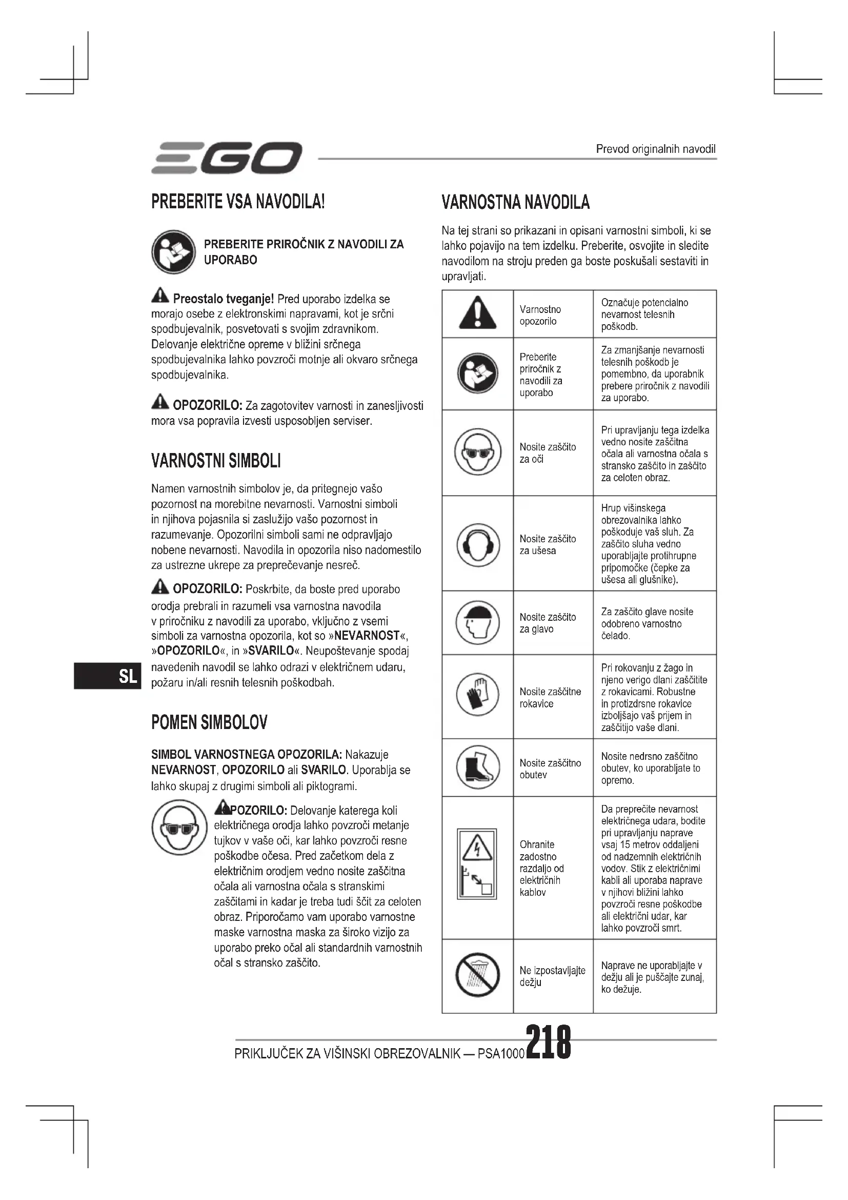 UPORABO Preostalo tveganje! Pred uporabo izdelka se morajo osebe z elektronskimi napravami, kot je srčni spodbujevalnik, posvetovati s svojim zdravnikom. Delovanje električne opreme v bližini srčnega spodbujevalnika lahko povzroči motnje ali okvaro srčnega spodbujevalnika. OPOZORILO: Za zagotovitev varnosti in zanesljivosti mora vsa popravila izvesti usposobljen serviser. VARNOSTNI SIMBOLI Namen varnostnih simbolov je, da pritegnejo vašo pozornost na morebitne nevarnosti. Varnostni simboli in njihova pojasnila si zaslužijo vašo pozornost in razumevanje. Opozorilni simboli sami ne odpravljajo nobene nevarnosti. Navodila in opozorila niso nadomestilo za ustrezne ukrepe za preprečevanje nesreč. OPOZORILO: Poskrbite, da boste pred uporabo orodja prebrali in razumeli vsa varnostna navodila v priročniku z navodili za uporabo, vključno z vsemi simboli za varnostna opozorila, kot so »NEVARNOST«, »OPOZORILO«, in »SVARILO«. Neupoštevanje spodaj navedenih navodil se lahko odrazi v električnem udaru, požaru in/ali resnih telesnih poškodbah. POMEN SIMBOLOV SIMBOL VARNOSTNEGA OPOZORILA: Nakazuje NEVARNOST, OPOZORILO ali SVARILO. Uporablja se lahko skupaj z drugimi simboli ali piktogrami. OPOZORILO: Delovanje katerega koli električnega orodja lahko povzroči metanje tujkov v vaše oči, kar lahko povzroči resne poškodbe očesa. Pred začetkom dela z električnim orodjem vedno nosite zaščitna očala ali varnostna očala s stranskimi zaščitami in kadar je treba tudi ščit za celoten obraz. Priporočamo vam uporabo varnostne maske varnostna maska za široko vizijo za uporabo preko očal ali standardnih varnostnih očal s stransko zaščito. VARNOSTNA NAVODILA Na tej strani so prikazani in opisani varnostni simboli, ki se lahko pojavijo na tem izdelku. Preberite, osvojite in sledite navodilom na stroju preden ga boste poskušali sestaviti in upravljati. Varnostno opozoriloOznačuje potencialno nevarnost telesnih poškodb.Preberite priročnik z navodili za uporaboZa zmanjšanje nevarnosti telesnih poškodb je pomembno, da uporabnik prebere priročnik z navodili za uporabo.Nosite zaščito za očiPri upravljanju tega izdelka vedno nosite zaščitna očala ali varnostna očala s stransko zaščito in zaščito za celoten obraz.Nosite zaščito za ušesaHrup višinskega obrezovalnika lahko poškoduje vaš sluh. Za zaščito sluha vedno uporabljajte protihrupne pripomočke (čepke za ušesa ali glušnike).Nosite zaščito za glavoZa zaščito glave nosite odobreno varnostno čelado.Nosite zaščitne rokavicePri rokovanju z žago in njeno verigo dlani zaščitite z rokavicami. Robustne in protizdrsne rokavice izboljšajo vaš prijem in zaščitijo vaše dlani.Nosite zaščitno obutevNosite nedrsno zaščitno obutev, ko uporabljate to opremo.Ohranite zadostno razdaljo od električnih kablovDa preprečite nevarnost električnega udara, bodite pri upravljanju naprave vsaj 15 metrov oddaljeni od nadzemnih električnih vodov. Stik z električnimi kabli ali uporaba naprave v njihovi bližini lahko povzroči resne poškodbe ali električni udar, kar lahko povzroči smrt.Ne izpostavljajte dežjuNaprave ne uporabljajte v dežju ali je puščajte zunaj, ko dežuje. Prevod originalnih navodilPRIKLJUČEK ZA VIŠINSKI OBREZOVALNIK — PSA1000 219