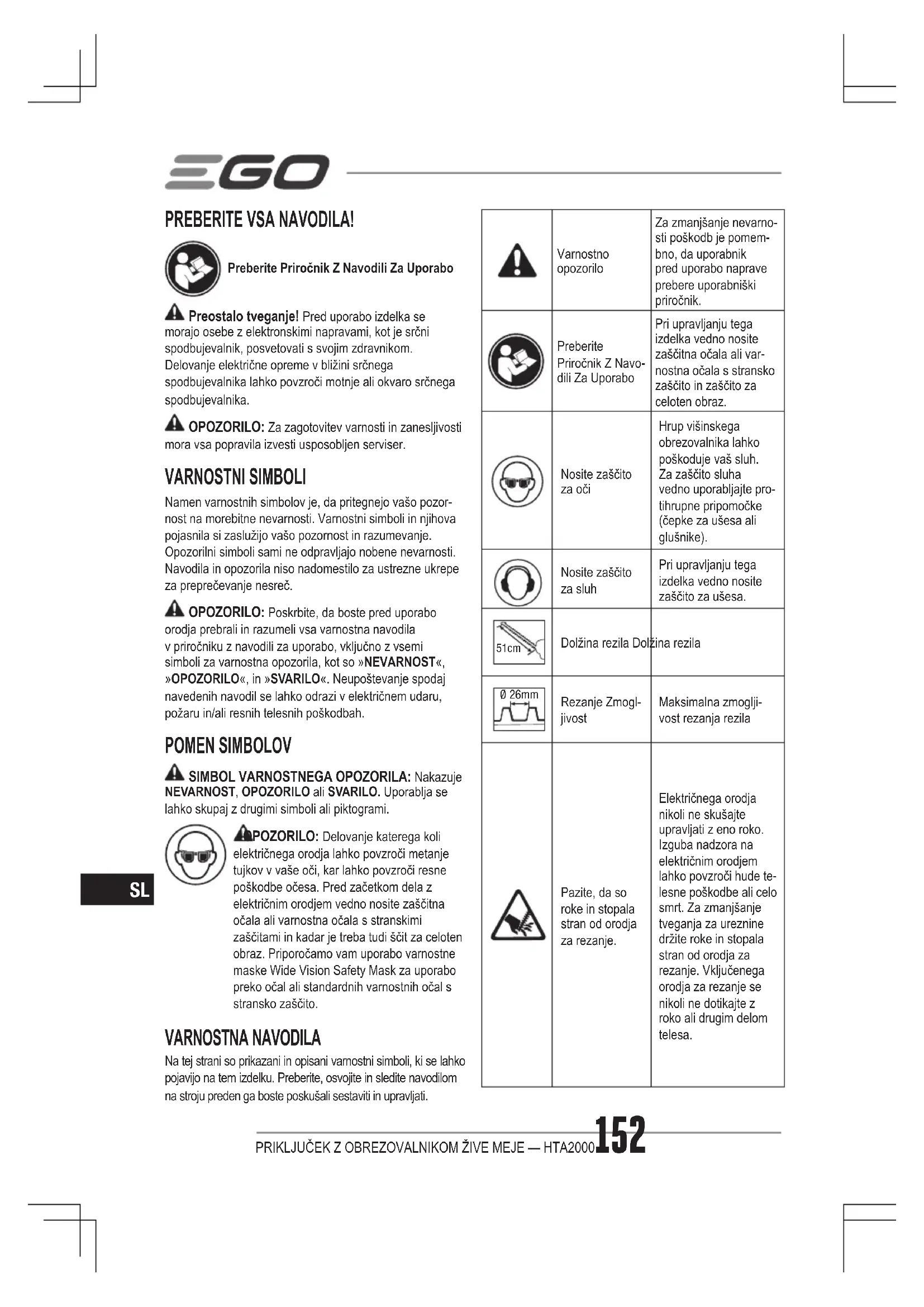 PREBERITE VSA NAVODILA! Preberite Priročnik Z Navodili Za Uporabo Preostalo tveganje! Pred uporabo izdelka se morajo osebe z elektronskimi napravami, kot je srčni spodbujevalnik, posvetovati s svojim zdravnikom. Delovanje električne opreme v bližini srčnega spodbujevalnika lahko povzroči motnje ali okvaro srčnega spodbujevalnika. OPOZORILO: Za zagotovitev varnosti in zanesljivosti mora vsa popravila izvesti usposobljen serviser. VARNOSTNI SIMBOLI Namen varnostnih simbolov je, da pritegnejo vašo pozor- nost na morebitne nevarnosti. Varnostni simboli in njihova pojasnila si zaslužijo vašo pozornost in razumevanje. Opozorilni simboli sami ne odpravljajo nobene nevarnosti. Navodila in opozorila niso nadomestilo za ustrezne ukrepe za preprečevanje nesreč. OPOZORILO: Poskrbite, da boste pred uporabo orodja prebrali in razumeli vsa varnostna navodila v priročniku z navodili za uporabo, vključno z vsemi simboli za varnostna opozorila, kot so »NEVARNOST«, »OPOZORILO«, in »SVARILO«. Neupoštevanje spodaj navedenih navodil se lahko odrazi v električnem udaru, požaru in/ali resnih telesnih poškodbah. POMEN SIMBOLOV SIMBOL VARNOSTNEGA OPOZORILA: Nakazuje NEVARNOST, OPOZORILO ali SVARILO. Uporablja se lahko skupaj z drugimi simboli ali piktogrami. OPOZORILO: Delovanje katerega koli električnega orodja lahko povzroči metanje tujkov v vaše oči, kar lahko povzroči resne poškodbe očesa. Pred začetkom dela z električnim orodjem vedno nosite zaščitna očala ali varnostna očala s stranskimi zaščitami in kadar je treba tudi ščit za celoten obraz. Priporočamo vam uporabo varnostne maske Wide Vision Safety Mask za uporabo preko očal ali standardnih varnostnih očal s stransko zaščito. VARNOSTNA NAVODILA Na tej strani so prikazani in opisani varnostni simboli, ki se lahko pojavijo na tem izdelku. Preberite, osvojite in sledite navodilom na stroju preden ga boste poskušali sestaviti in upravljati. Varnostno opozorilo Za zmanjšanje nevarno- sti poškodb je pomem- bno, da uporabnik pred uporabo naprave prebere uporabniški priročnik. Preberite Priročnik Z Navo- dili Za Uporabo Pri upravljanju tega izdelka vedno nosite zaščitna očala ali var- nostna očala s stransko zaščito in zaščito za celoten obraz. Nosite zaščito za oči Hrup višinskega obrezovalnika lahko poškoduje vaš sluh. Za zaščito sluha vedno uporabljajte pro- tihrupne pripomočke (čepke za ušesa ali glušnike). Nosite zaščito za sluh Pri upravljanju tega izdelka vedno nosite zaščito za ušesa. 51cm Dolžina rezila Dolžina rezila Ø 26mm Rezanje Zmogl- jivost Maksimalna zmoglji- vost rezanja rezila Pazite, da so roke in stopala stran od orodja za rezanje. Električnega orodja nikoli ne skušajte upravljati z eno roko. Izguba nadzora na električnim orodjem lahko povzroči hude te- lesne poškodbe ali celo smrt. Za zmanjšanje tveganja za ureznine držite roke in stopala stran od orodja za rezanje. Vključenega orodja za rezanje se nikoli ne dotikajte z roko ali drugim delom telesa.PRIKLJUČEK Z OBREZOVALNIKOM ŽIVE MEJE — HTA2000 153