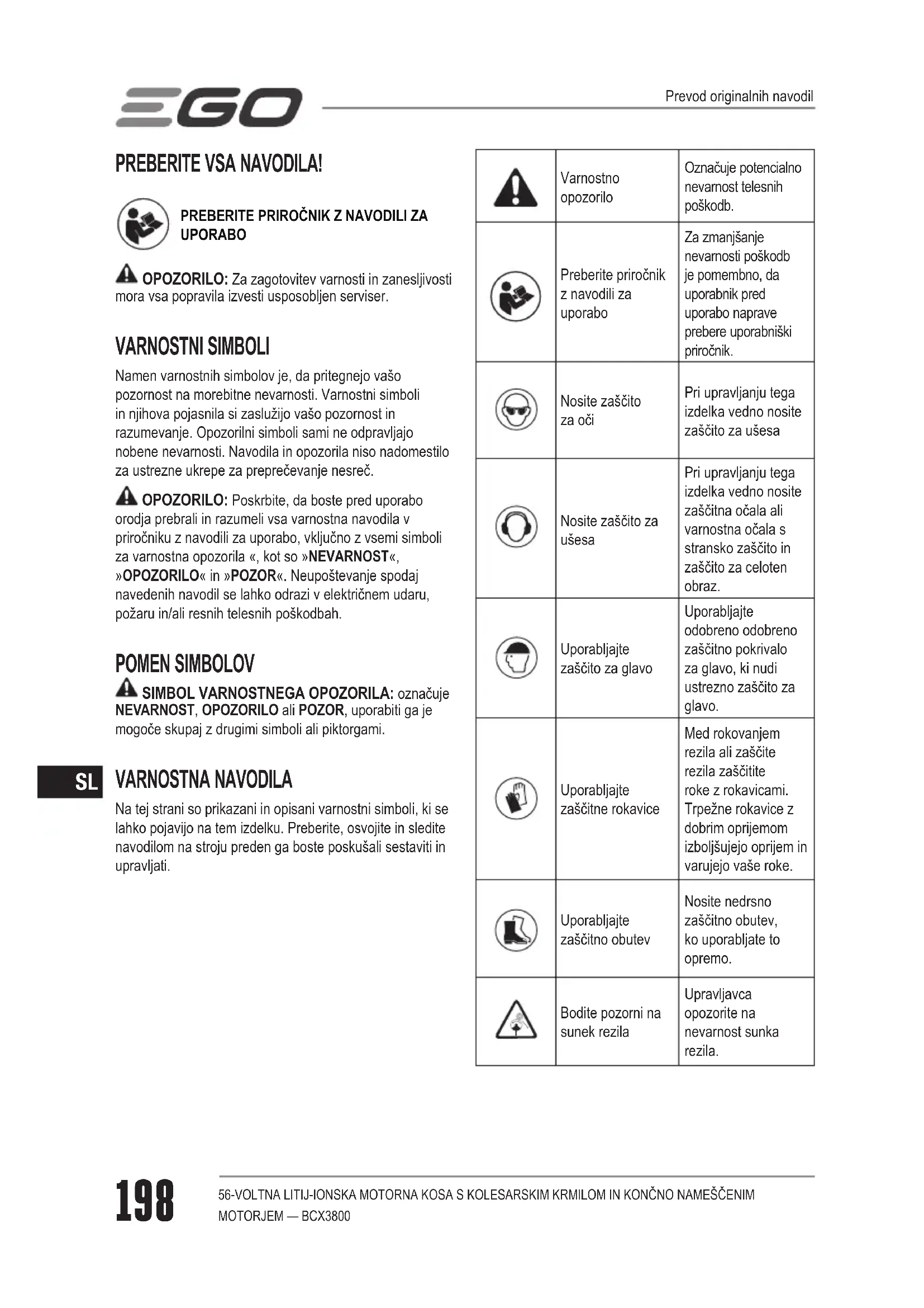 UPORABO OPOZORILO: Za zagotovitev varnosti in zanesljivosti mora vsa popravila izvesti usposobljen serviser. VARNOSTNI SIMBOLI Namen varnostnih simbolov je, da pritegnejo vašo pozornost na morebitne nevarnosti. Varnostni simboli in njihova pojasnila si zaslužijo vašo pozornost in razumevanje. Opozorilni simboli sami ne odpravljajo nobene nevarnosti. Navodila in opozorila niso nadomestilo za ustrezne ukrepe za preprečevanje nesreč. OPOZORILO: Poskrbite, da boste pred uporabo orodja prebrali in razumeli vsa varnostna navodila v priročniku z navodili za uporabo, vključno z vsemi simboli za varnostna opozorila «, kot so »NEVARNOST«, »OPOZORILO« in »POZOR«. Neupoštevanje spodaj navedenih navodil se lahko odrazi v električnem udaru, požaru in/ali resnih telesnih poškodbah. POMEN SIMBOLOV SIMBOL VARNOSTNEGA OPOZORILA: označuje NEVARNOST, OPOZORILO ali POZOR, uporabiti ga je mogoče skupaj z drugimi simboli ali piktorgami. VARNOSTNA NAVODILA Na tej strani so prikazani in opisani varnostni simboli, ki se lahko pojavijo na tem izdelku. Preberite, osvojite in sledite navodilom na stroju preden ga boste poskušali sestaviti in upravljati. Varnostno opozorilo Označuje potencialno nevarnost telesnih poškodb. Preberite priročnik z navodili za uporabo Za zmanjšanje nevarnosti poškodb je pomembno, da uporabnik pred uporabo naprave prebere uporabniški priročnik. Nosite zaščito za oči Pri upravljanju tega izdelka vedno nosite zaščito za ušesa Nosite zaščito za ušesa Pri upravljanju tega izdelka vedno nosite zaščitna očala ali varnostna očala s stransko zaščito in zaščito za celoten obraz. Uporabljajte zaščito za glavo Uporabljajte odobreno odobreno zaščitno pokrivalo za glavo, ki nudi ustrezno zaščito za glavo. Uporabljajte zaščitne rokavice Med rokovanjem rezila ali zaščite rezila zaščitite roke z rokavicami. Trpežne rokavice z dobrim oprijemom izboljšujejo oprijem in varujejo vaše roke. Uporabljajte zaščitno obutev Nosite nedrsno zaščitno obutev, ko uporabljate to opremo. Bodite pozorni na sunek rezila Upravljavca opozorite na nevarnost sunka rezila. Prevod originalnih navodil56-VOLTNA LITIJ-IONSKA MOTORNA KOSA S KOLESARSKIM KRMILOM IN KONČNO NAMEŠČENIM MOTORJEM — BCX3800