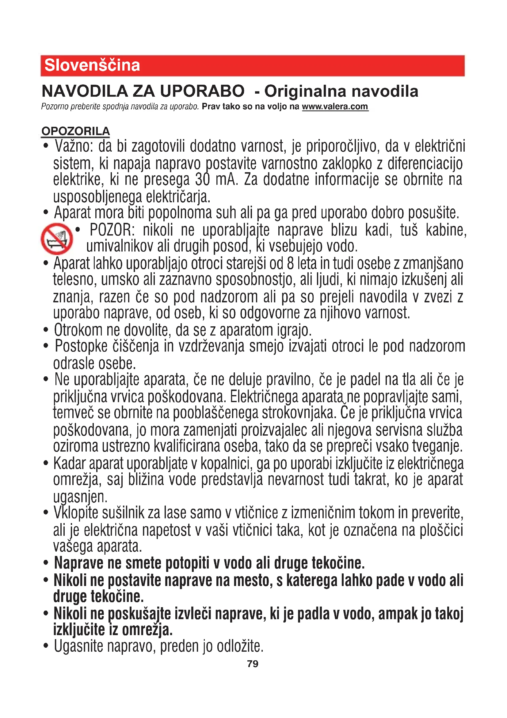 - POZOR: nikoli ne uporabljajte naprave blizu kadi, tuš kabine, umivalnikov ali drugih posod, ki vsebujejo vodo.