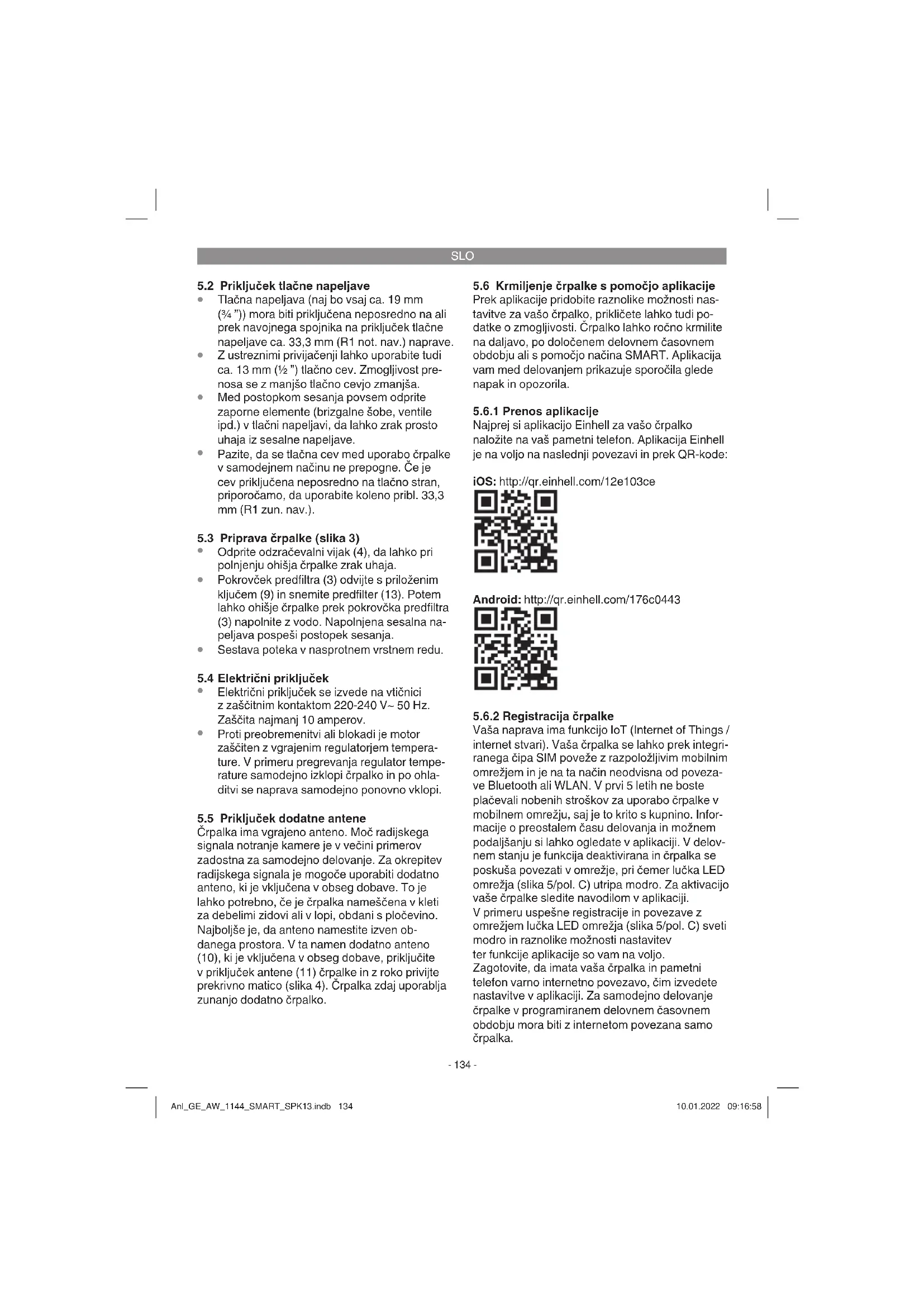 Vaša naprava ima funkcijo IoT (Internet of Things / internet stvari). Vaša črpalka se lahko prek integri- ranega čipa SIM poveže z razpoložljivim mobilnim omrežjem in je na ta način neodvisna od poveza- ve Bluetooth ali WLAN. V prvi 5 letih ne boste plačevali nobenih stroškov za uporabo črpalke v mobilnem omrežju, saj je to krito s kupnino. Infor- macije o preostalem času delovanja in možnem podaljšanju si lahko ogledate v aplikaciji. V delov- nem stanju je funkcija deaktivirana in črpalka se poskuša povezati v omrežje, pri čemer lučka LED omrežja (slika 5/pol. C) utripa modro. Za aktivacijo vaše črpalke sledite navodilom v aplikaciji. V primeru uspešne registracije in povezave z omrežjem lučka LED omrežja (slika 5/pol. C) sveti modro in raznolike možnosti nastavitev ter funkcije aplikacije so vam na voljo. Zagotovite, da imata vaša črpalka in pametni telefon varno internetno povezavo, čim izvedete nastavitve v aplikaciji. Za samodejno delovanje črpalke v programiranem delovnem časovnem obdobju mora biti z internetom povezana samo črpalka. Anl_GE_AW_1144_SMART_SPK13.indb 134Anl_GE_AW_1144_SMART_SPK13.indb 134 10.01.2022 09:16:5810.01.2022 09:16:58SLO