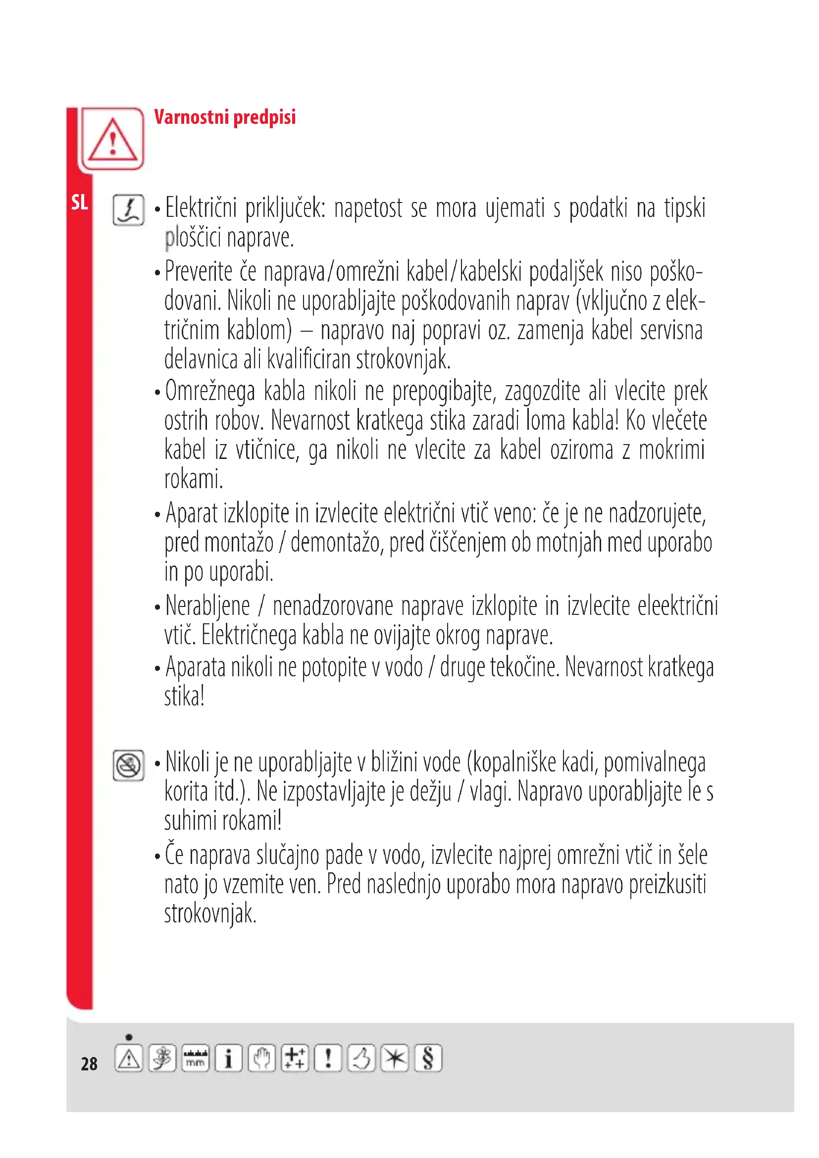 - Nikoli je ne uporabljajte v bližini vode (kopalniške kadi, pomivalnega korita itd.). Ne izpostavljajte je dežju / vlagi. Napravo uporabljajte le s suhimi rokami!29 Varnostni predpisi