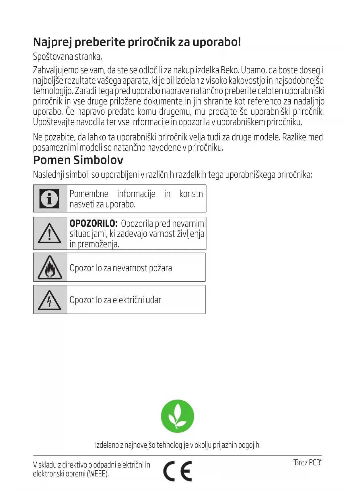 Risoluzione dei problemiNajprej preberite priročnik za uporabo! Spoštovana stranka, Zahvaljujemo se vam, da ste se odločili za nakup izdelka Beko. Upamo, da boste dosegli najboljše rezultate vašega aparata, ki je bil izdelan z visoko kakovostjo in najsodobnejšo tehnologijo. Zaradi tega pred uporabo naprave natančno preberite celoten uporabniški priročnik in vse druge priložene dokumente in jih shranite kot referenco za nadaljnjo uporabo. Če napravo predate komu drugemu, mu predajte še uporabniški priročnik. Upoštevajte navodila ter vse informacije in opozorila v uporabniškem priročniku. Ne pozabite, da lahko ta uporabniški priročnik velja tudi za druge modele. Razlike med posameznimi modeli so natančno navedene v priročniku. Pomen Simbolov Naslednji simboli so uporabljeni v različnih razdelkih tega uporabniškega priročnika: