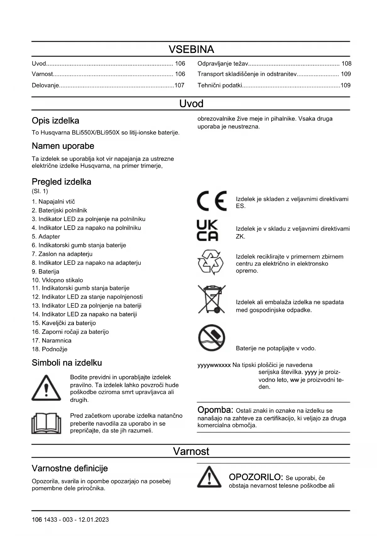 Prenesite navodila za vaš Baterija v formatu PDF brezplačno! Poiščite svoja navodila BLi550X - HUSQVARNA in vzemite svojo elektronsko napravo nazaj v roke. Na tej strani so objavljeni vsi dokumenti, potrebni za uporabo vaše naprave. BLi550X znamke HUSQVARNA.