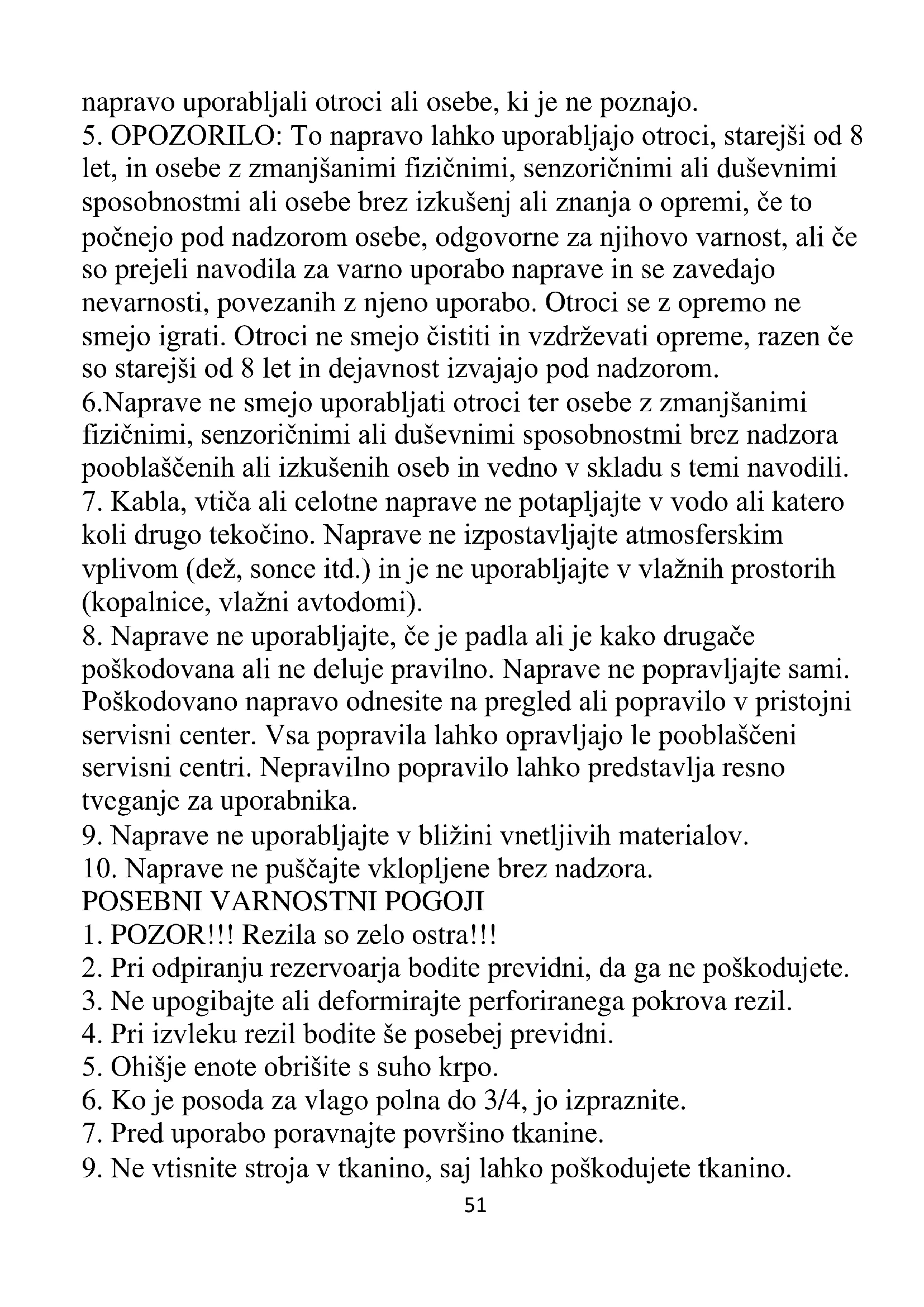 let, in osebe z zmanjšanimi fizičnimi, senzoričnimi ali duševnimi sposobnostmi ali osebe brez izkušenj ali znanja o opremi, če to počnejo pod nadzorom osebe, odgovorne za njihovo varnost, ali če so prejeli navodila za varno uporabo naprave in se zavedajo nevarnosti, povezanih z njeno uporabo. Otroci se z opremo ne smejo igrati. Otroci ne smejo čistiti in vzdrževati opreme, razen če so starejši od 8 let in dejavnost izvajajo pod nadzorom. 6.Naprave ne smejo uporabljati otroci ter osebe z zmanjšanimi fizičnimi, senzoričnimi ali duševnimi sposobnostmi brez nadzora pooblaščenih ali izkušenih oseb in vedno v skladu s temi navodili.