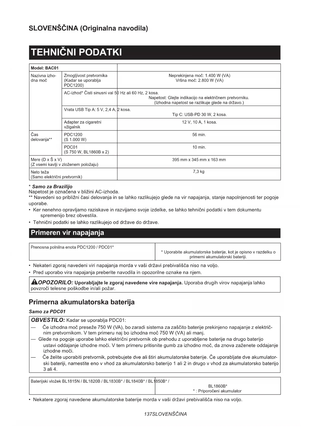 - Samo za Brazilijo Napetost je označena v bližini AC-izhoda. ** Navedeni so približni časi delovanja in se lahko razlikujejo glede na vir napajanja, stanje napolnjenosti ter pogoje uporabe.