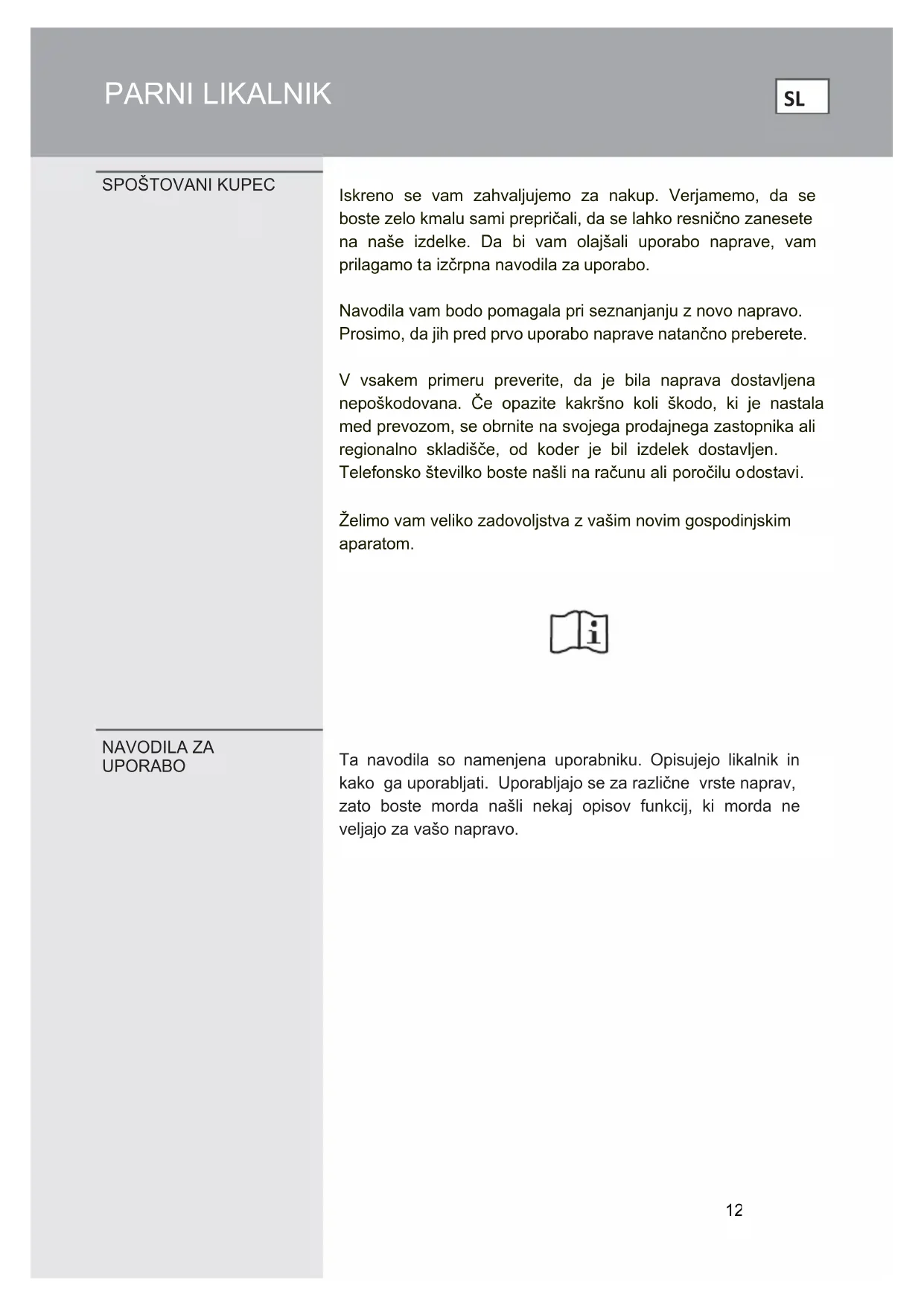 Iskreno se vam zahvaljujemo za nakup. Verjamemo, da se boste zelo kmalu sami prepričali, da se lahko resnično zanesete na naše izdelke. Da bi vam olajšali uporabo naprave, vam prilagamo ta izčrpna navodila za uporabo. Navodila vam bodo pomagala pri seznanjanju z novo napravo. Prosimo, da jih pred prvo uporabo naprave natančno preberete. V vsakem primeru preverite, da je bila naprava dostavljena nepoškodovana. Če opazite kakršno koli škodo, ki je nastala med prevozom, se obrnite na svojega prodajnega zastopnika ali regionalno skladišče, od koder je bil izdelek dostavljen. Telefonsko številko boste našli na računu ali poročilu o dostavi. Želimo vam veliko zadovoljstva z vašim novim gospodinjskim aparatom. NAVODILA ZA UPORABO Ta navodila so namenjena uporabniku. Opisujejo likalnik in kako ga uporabljati. Uporabljajo se za različne vrste naprav, zato boste morda našli nekaj opisov funkcij, ki morda ne veljajo za vašo napravo.