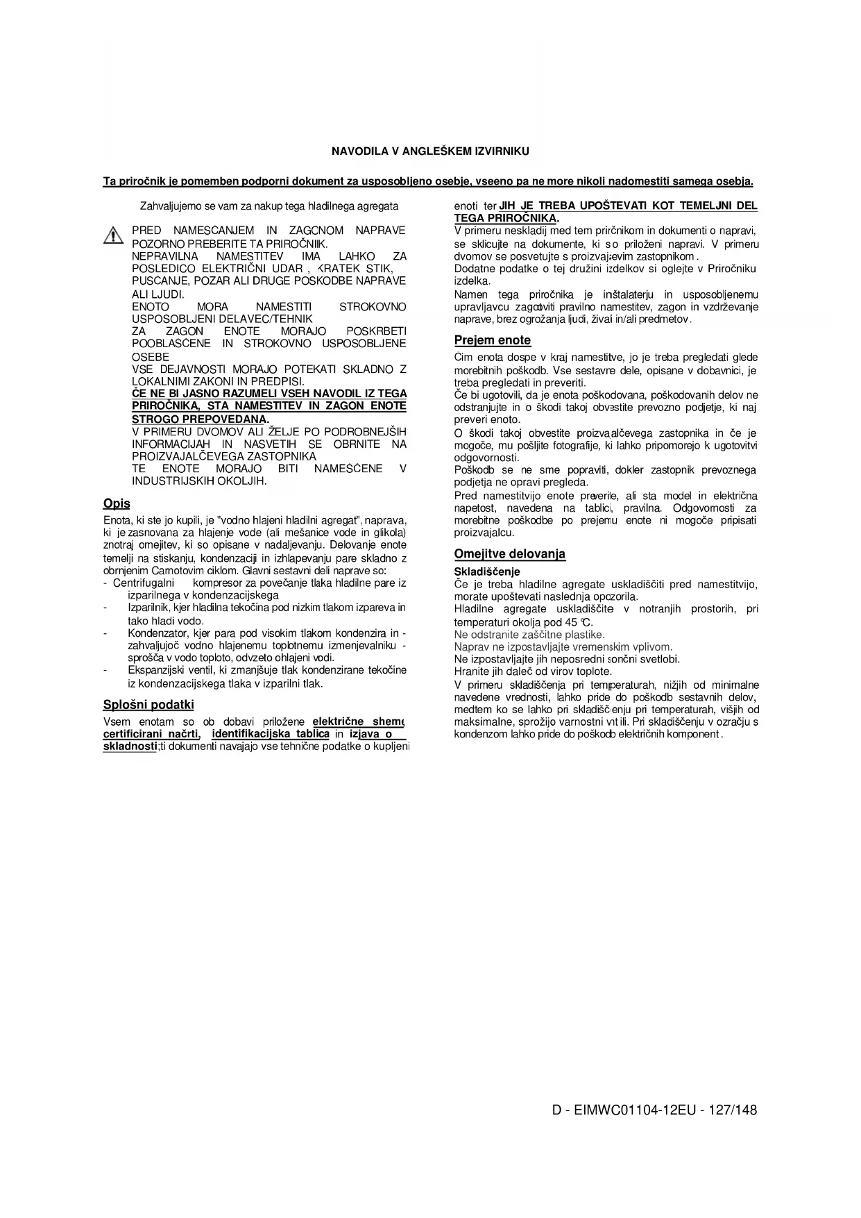 Pomembne informacije o uporabljenem hladilnem sredstvu Ta izdelek vsebuje fluorirane toplogredne pline, ki so zajeti v Kjotskem protokolu. Plinov ne izpuščajte v ozračje. Vrsta hladiva: R134a Vrednost GWP(1): 1300 (1)GWP = potencial globalnega segrevanja Količina hladiva, potrebna za standardno delovanje, je navedena na identifikacijski ploščici enote. Količina hladiva, s katero je dejansko napolnjena enota, je označena na posrebreni paličici v električni omarici. Evropska ali lokalna zakonodaja lahko zahteva redne kontrole za ugotovitev morebitnega puščanja hladiva. Za podrobnejše informacije se obrnite na lokalnega pooblaščenega prodajalca. Odlaganje Enota je izdelana iz kovinskih, plastičnih in elektronskih komponent. Vse te dele je treba odlagati skladno z lokalnimi predpisi, ki veljajo na tem področju. Svinčeve baterije je treba zbrati in jih odnesti v posebne zbirne centre za odlaganje odpadkov. Olje je treba zbrati in ga odnesti v posebne zbirne centre za odlaganje odpadkov.D - EIMWC01104-12EU - 132/148