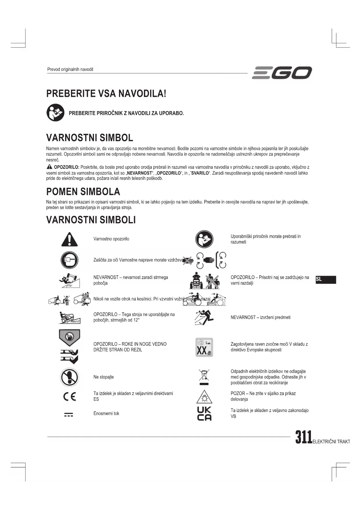 Vă rugăm să consultați site-ul egopowerplus.eu pentru termenii și condițiile complete ale politicii privind garanția EGO.SL 311ELEKTRIČNI TRAKTOR ZA TRAVO — TR4200E PREBERITE VSA NAVODILA! PREBERITE PRIROČNIK Z NAVODILI ZA UPORABO. VARNOSTNI SIMBOL Namen varnostnih simbolov je, da vas opozorijo na morebitne nevarnosti. Bodite pozorni na varnostne simbole in njihova pojasnila ter jih poskušajte razumeti. Opozorilni simboli sami ne odpravljajo nobene nevarnosti. Navodila in opozorila ne nadomeščajo ustreznih ukrepov za preprečevanje nesreč. OPOZORILO: Poskrbite, da boste pred uporabo orodja prebrali in razumeli vsa varnostna navodila v priročniku z navodili za uporabo, vključno z vsemi simboli za varnostna opozorila, kot so „NEVARNOST“, „OPOZORILO“, in „ˇSVARILO“. Zaradi neupoštevanja spodaj navedenih navodil lahko pride do električnega udara, požara in/ali resnih telesnih poškodb. POMEN SIMBOLA Na tej strani so prikazani in opisani varnostni simboli, ki se lahko pojavijo na tem izdelku. Preberite in osvojite navodila na napravi ter jih upoštevajte, preden se lotite sestavljanja in upravljanja stroja. VARNOSTNI SIMBOLI Varnostno opozoriloUporabniški priročnik morate prebrati in razumetiZaščita za oči Varnostne naprave morate vzdrževati>12°NEVARNOST – nevarnost zaradi strmega pobočjaOPOZORILO – Prisotni naj se zadržujejo na varni razdaljiNikoli ne vozite otrok na kosilnici. Pri vzvratni vožnji poglejte nazajmax12°OPOZORILO – Tega stroja ne uporabljajte na pobočjih, strmejših od 12°NEVARNOST – izvrženi predmetiOPOZORILO – ROKE IN NOGE VEDNO DRŽITE STRAN OD REZIL Zagotovljena raven zvočne moči V skladu z direktivo Evropske skupnostiNe stopajteOdpadnih električnih izdelkov ne odlagajte med gospodinjske odpadke. Odnesite jih v pooblaščeni obrat za recikliranjeTa izdelek je skladen z veljavnimi direktivami POZOR – Ne zrite v sijalko za prikaz delovanjaEnosmerni tokTa izdelek je skladen z veljavno zakonodajo Prevod originalnih navodilSL ELEKTRIČNI TRAKTOR ZA TRAVO — TR4200E312kPa Kilopascal RPM Število vrtljajev na minutoV Volt m Metriin Palec cm centimetriNm Newton meter mm Milimetri°C Celzij kg Kilogramkm/h Kilometri na uro IPX4 Stopnja zaščite pred vdorom