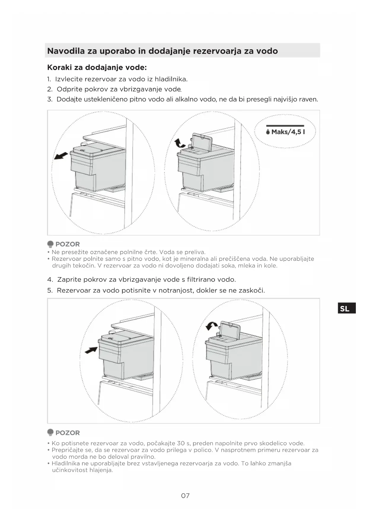 Navodila za uporabo in dodajanje rezervoarja za vodo Koraki za dodajanje vode: