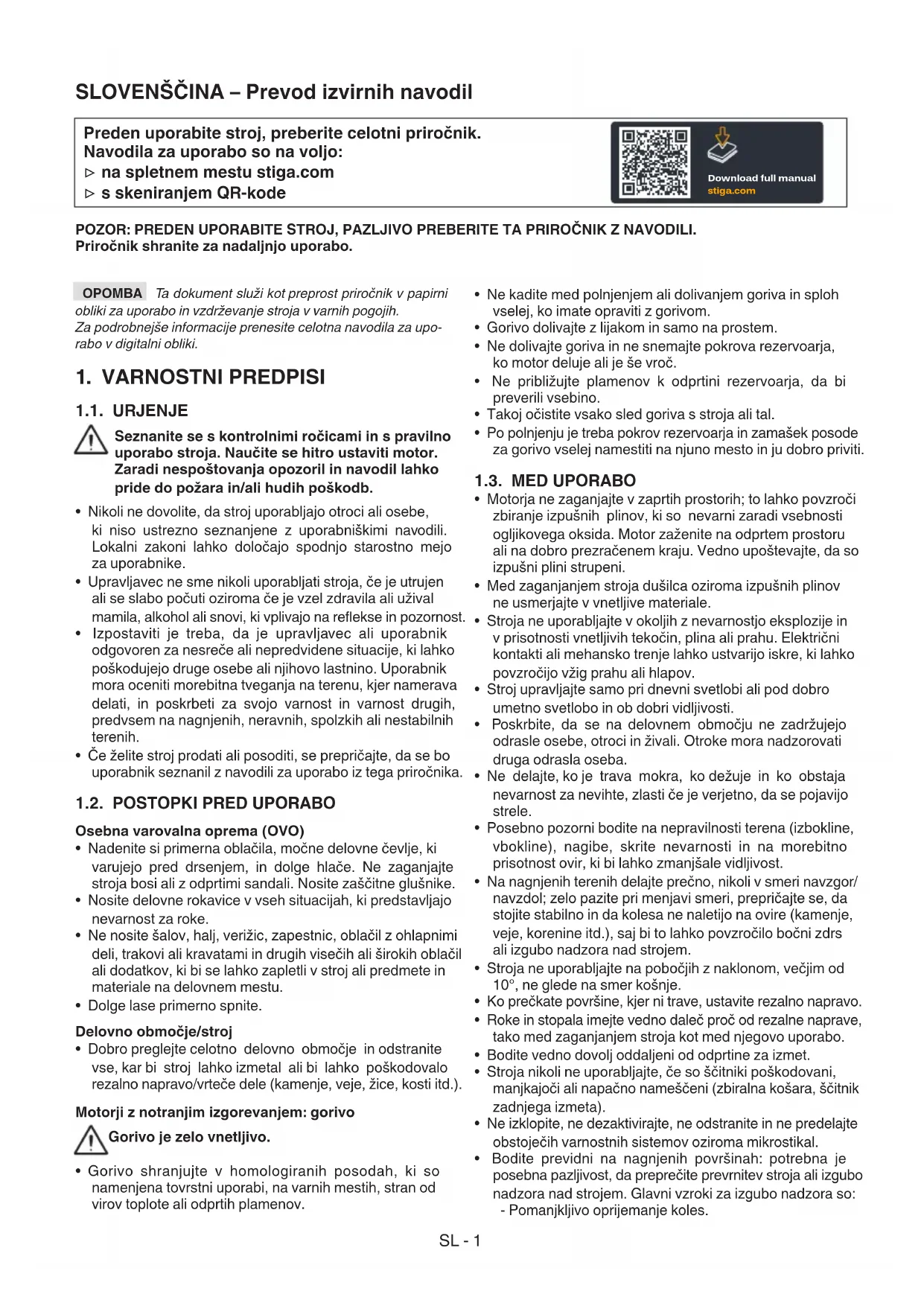 1.1. URJENJE Seznanite se s kontrolnimi ročicami in s pravilno uporabo stroja. Naučite se hitro ustaviti motor. Zaradi nespoštovanja opozoril in navodil lahko pride do požara in/ali hudih poškodb.