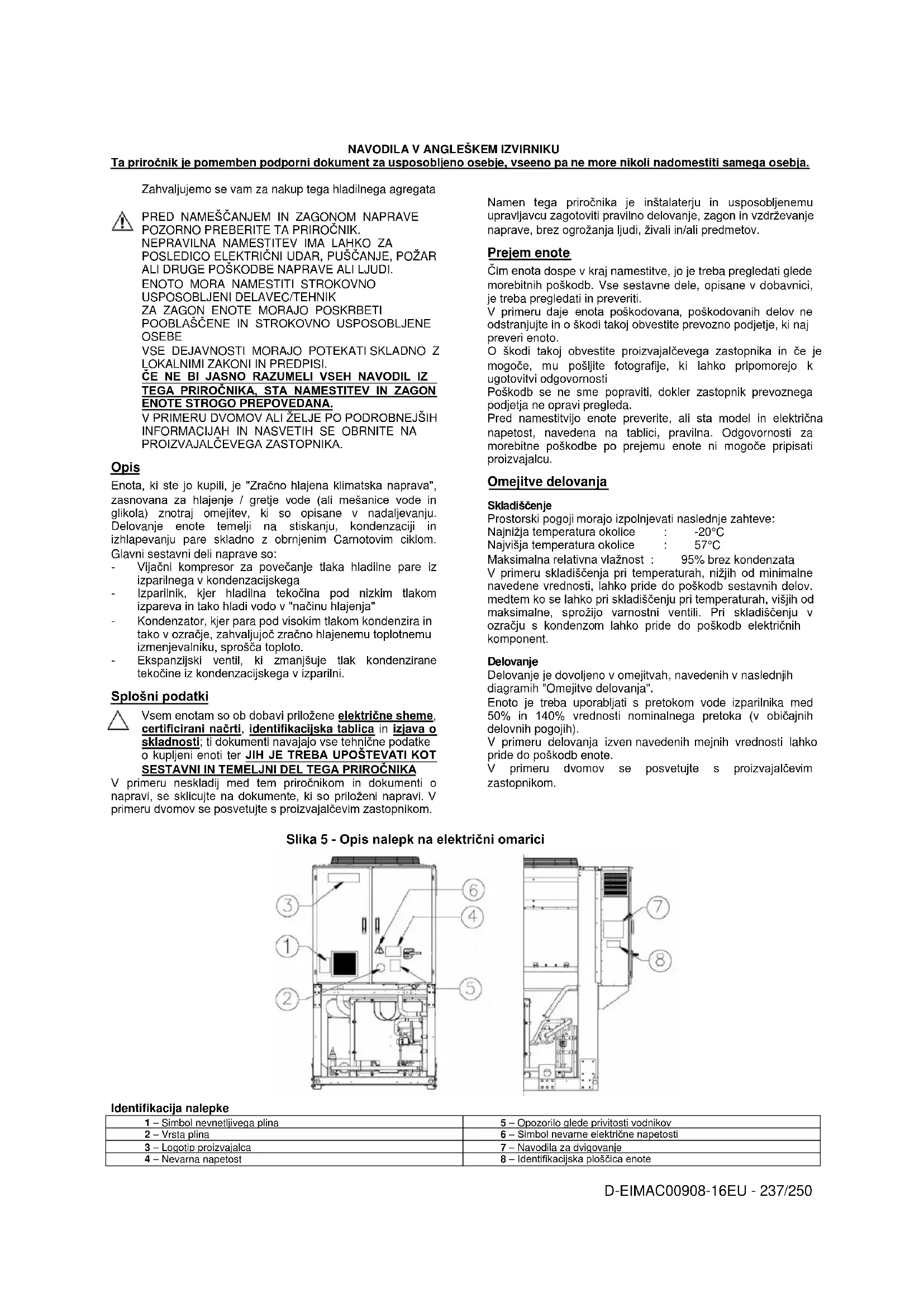 1 – Simbol nevnetljivega plina 5 – Opozorilo glede privitosti vodnikov 2 – Vrsta plina 6 – Nevarna napetost 3 – Identifikacijska ploščica enote 7 – Simbol nevarne električne napetosti 4 – Logotip proizvajalca 8 – Navodila za dvigovanje Temperatura vode na izhodu iz uparjalnika (°C) Delovna temperatura (°C) Reguliranje hitrosti ventilatorja ali potrebno mešano koračno krmiljenje in krmiljenje hitrosti (Speedtroll) (pod -10 °C okoljske temperature) V tem območju lahko klimatska naprava deluje z delno obremenitvijo Obratovanje z glikolom (pod 4 °C uparjalnik