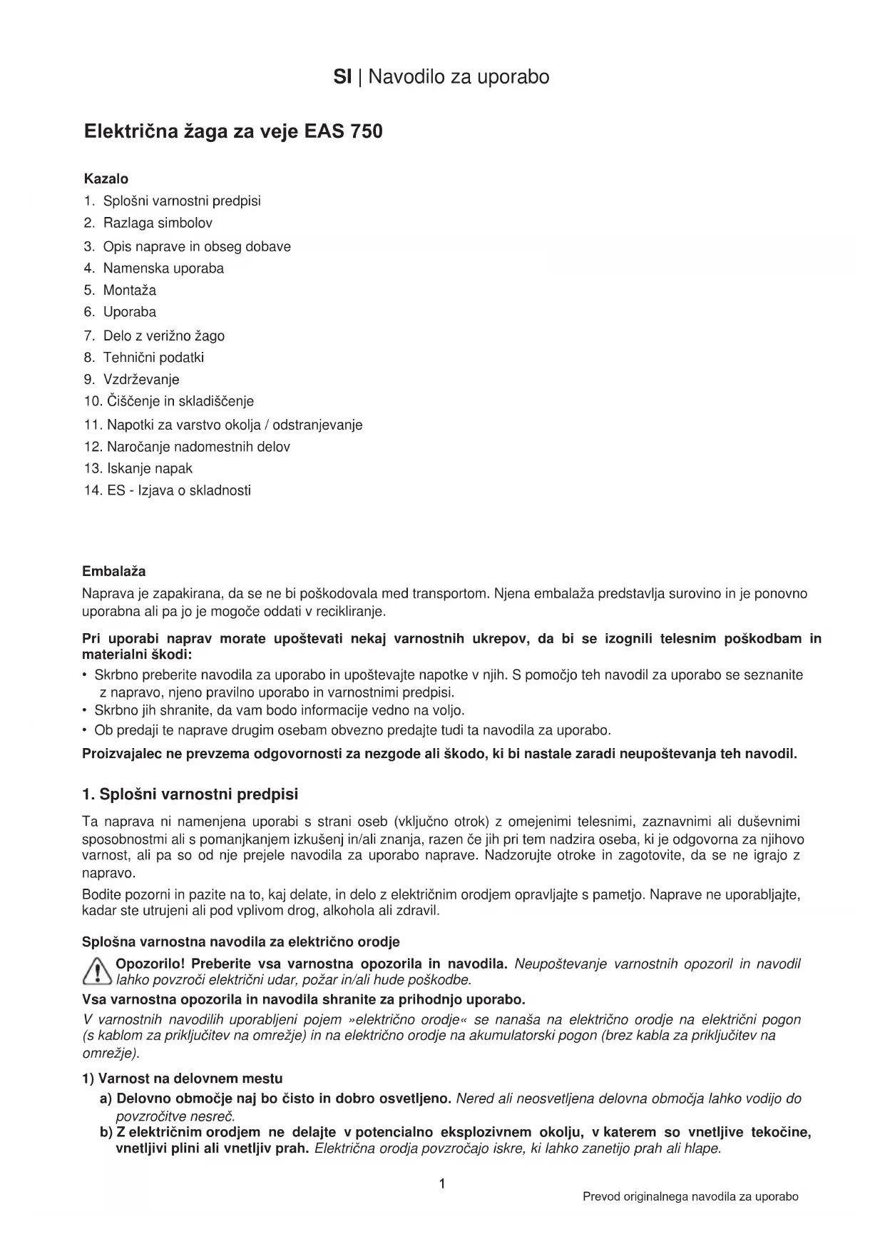 Električna žaga za veje EAS 750 Omrežna napetost 230-240 V ~ / 50 Hz Nazivna moč 750 W Nazivnem številu vrtljajev 6000 min
