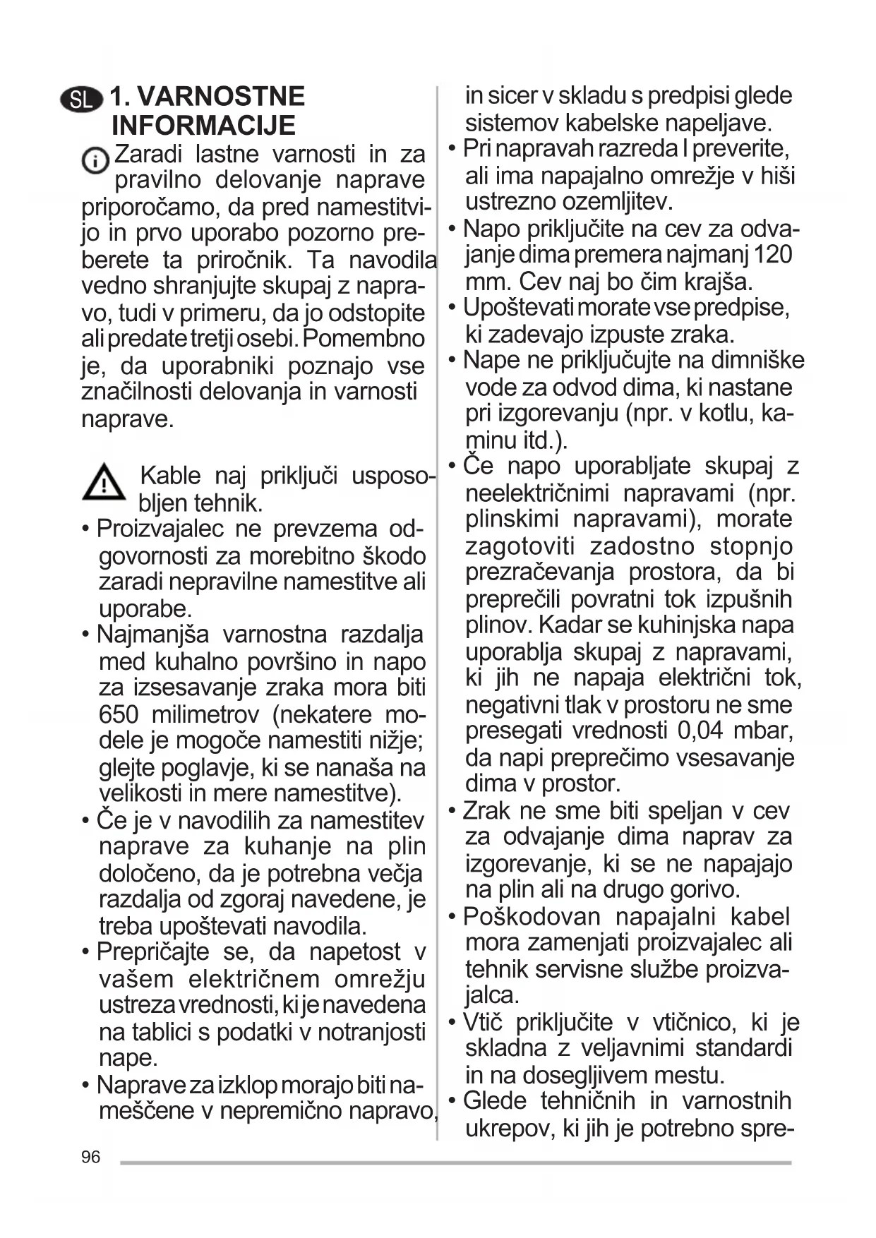 - Če napo uporabljate skupaj z neelektričnimi napravami (npr. plinskimi napravami), morate zagotoviti zadostno stopnjo prezračevanja prostora, da bi preprečili povratni tok izpušnih plinov. Kadar se kuhinjska napa uporablja skupaj z napravami, ki jih ne napaja električni tok, negativni tlak v prostoru ne sme presegati vrednosti 0,04 mbar, da napi preprečimo vsesavanje dima v prostor.