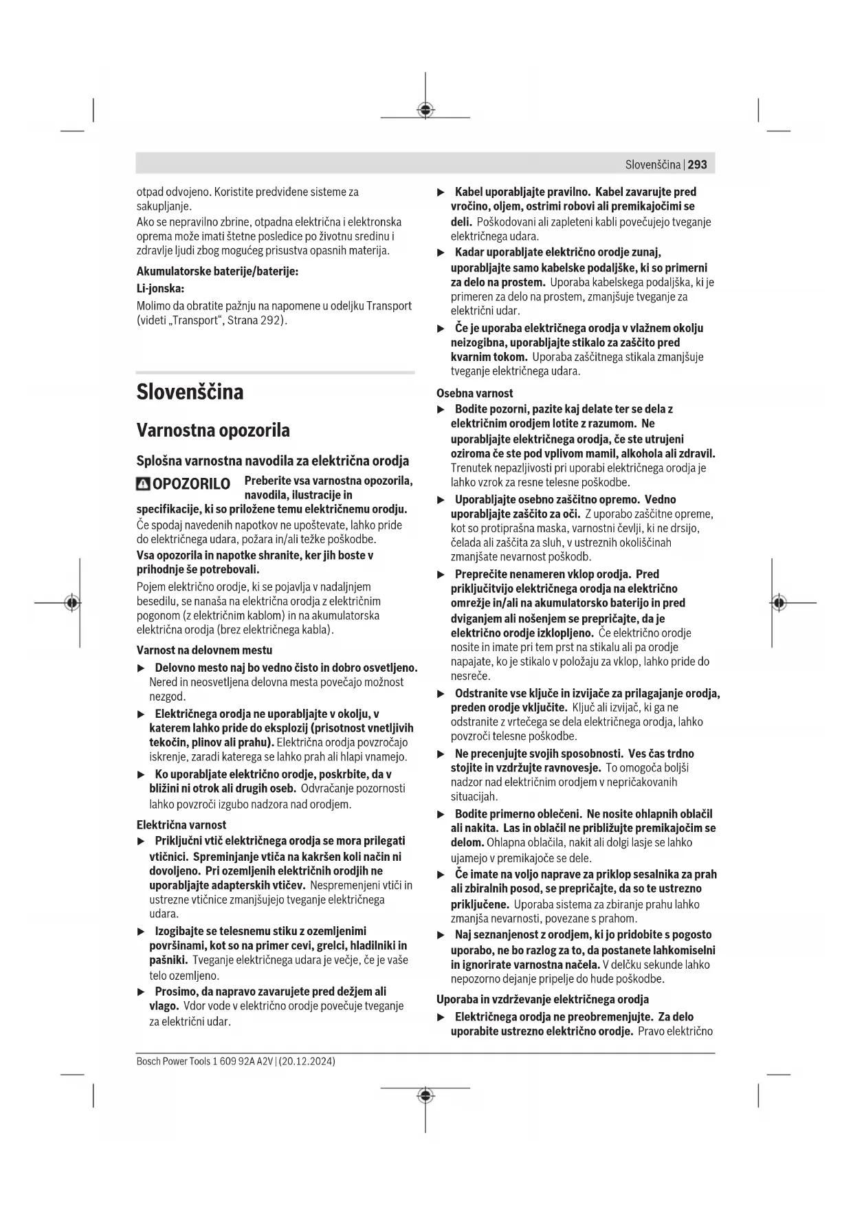 i na: www.bosch-pt.com/serviceaddresses Transport Sadržani litijum-jonski akumulatori podležu zahtevima zakona o opasnim materijalima. Korisnik može da transportuje akumulatore kopnenim putem bez dodatnih uslova. Kod slanja preko posrednika (npr.: vazdušnim transportom ili otpremom) treba poštovati posebne zahteve u pogledu pakovanja i označavanja. Pri tome je kod pripreme pošiljke potrebno angažovati stručnjaka za opasne materijale. Šaljite akumulatore samo ako je kućište neoštećeno. Otvorene kontakte odlepite i tako upakujte akumulator da se u pakovanju ne pokreće. Molimo da obratite pažnju i na eventualne dodatne nacionalne propise. Uklanjanje đubreta Električne alate, akumulacione baterije, pribor i pakovanja treba predati na reciklažu koja je u skladu sa zaštitom životne sredine. Ne bacajte električne alate i akumulatore/ baterije u kućno djubre! Samo za EU‑zemlje: Električni uređaji koji se više ne mogu koristiti i neispravni ili istrošeni akumulatori/baterije se moraju da se odlažu u 1 609 92A A2V | (20.12.2024) Bosch Power ToolsSlovenščina | 293 otpad odvojeno. Koristite predviđene sisteme za sakupljanje. Ako se nepravilno zbrine, otpadna električna i elektronska oprema može imati štetne posledice po životnu sredinu i zdravlje ljudi zbog mogućeg prisustva opasnih materija. Akumulatorske baterije/baterije: Li-jonska: Molimo da obratite pažnju na napomene u odeljku Transport (videti „Transport“, Strana292). Slovenščina Varnostna opozorila Splošna varnostna navodila za električna orodja OPOZORILO Preberite vsa varnostna opozorila, navodila, ilustracije in specifikacije, ki so priložene temu električnemu orodju. Če spodaj navedenih napotkov ne upoštevate, lahko pride do električnega udara, požara in/ali težke poškodbe. Vsa opozorila in napotke shranite, ker jih boste v prihodnje še potrebovali. Pojem električno orodje, ki se pojavlja v nadaljnjem besedilu, se nanaša na električna orodja z električnim pogonom (z električnim kablom) in na akumulatorska električna orodja (brez električnega kabla). Varnost na delovnem mestu u Delovno mesto naj bo vedno čisto in dobro osvetljeno. Nered in neosvetljena delovna mesta povečajo možnost nezgod. u Električnega orodja ne uporabljajte v okolju, v katerem lahko pride do eksplozij (prisotnost vnetljivih tekočin, plinov ali prahu). Električna orodja povzročajo iskrenje, zaradi katerega se lahko prah ali hlapi vnamejo. u Ko uporabljate električno orodje, poskrbite, da v bližini ni otrok ali drugih oseb. Odvračanje pozornosti lahko povzroči izgubo nadzora nad orodjem. Električna varnost u Priključni vtič električnega orodja se mora prilegati vtičnici. Spreminjanje vtiča na kakršen koli način ni dovoljeno. Pri ozemljenih električnih orodjih ne uporabljajte adapterskih vtičev. Nespremenjeni vtiči in ustrezne vtičnice zmanjšujejo tveganje električnega udara. u Izogibajte se telesnemu stiku z ozemljenimi površinami, kot so na primer cevi, grelci, hladilniki in pašniki. Tveganje električnega udara je večje, če je vaše telo ozemljeno. u Prosimo, da napravo zavarujete pred dežjem ali vlago. Vdor vode v električno orodje povečuje tveganje za električni udar. u Kabel uporabljajte pravilno. Kabel zavarujte pred vročino, oljem, ostrimi robovi ali premikajočimi se deli. Poškodovani ali zapleteni kabli povečujejo tveganje električnega udara. u Kadar uporabljate električno orodje zunaj, uporabljajte samo kabelske podaljške, ki so primerni za delo na prostem. Uporaba kabelskega podaljška, ki je primeren za delo na prostem, zmanjšuje tveganje za električni udar. u Če je uporaba električnega orodja v vlažnem okolju neizogibna, uporabljajte stikalo za zaščito pred kvarnim tokom. Uporaba zaščitnega stikala zmanjšuje tveganje električnega udara. Osebna varnost u Bodite pozorni, pazite kaj delate ter se dela z električnim orodjem lotite z razumom. Ne uporabljajte električnega orodja, če ste utrujeni oziroma če ste pod vplivom mamil, alkohola ali zdravil. Trenutek nepazljivosti pri uporabi električnega orodja je lahko vzrok za resne telesne poškodbe. u Uporabljajte osebno zaščitno opremo. Vedno uporabljajte zaščito za oči. Z uporabo zaščitne opreme, kot so protiprašna maska, varnostni čevlji, ki ne drsijo, čelada ali zaščita za sluh, v ustreznih okoliščinah zmanjšate nevarnost poškodb. u Preprečite nenameren vklop orodja. Pred priključitvijo električnega orodja na električno omrežje in/ali na akumulatorsko baterijo in pred dviganjem ali nošenjem se prepričajte, da je električno orodje izklopljeno. Če električno orodje nosite in imate pri tem prst na stikalu ali pa orodje napajate, ko je stikalo v položaju za vklop, lahko pride do nesreče. u Odstranite vse ključe in izvijače za prilagajanje orodja, preden orodje vključite. Ključ ali izvijač, ki ga ne odstranite z vrtečega se dela električnega orodja, lahko povzroči telesne poškodbe. u Ne precenjujte svojih sposobnosti. Ves čas trdno stojite in vzdržujte ravnovesje. To omogoča boljši nadzor nad električnim orodjem v nepričakovanih situacijah. u Bodite primerno oblečeni. Ne nosite ohlapnih oblačil ali nakita. Las in oblačil ne približujte premikajočim se delom. Ohlapna oblačila, nakit ali dolgi lasje se lahko ujamejo v premikajoče se dele. u Če imate na voljo naprave za priklop sesalnika za prah ali zbiralnih posod, se prepričajte, da so te ustrezno priključene. Uporaba sistema za zbiranje prahu lahko zmanjša nevarnosti, povezane s prahom. u Naj seznanjenost z orodjem, ki jo pridobite s pogosto uporabo, ne bo razlog za to, da postanete lahkomiselni in ignorirate varnostna načela. V delčku sekunde lahko nepozorno dejanje pripelje do hude poškodbe. Uporaba in vzdrževanje električnega orodja u Električnega orodja ne preobremenjujte. Za delo uporabite ustrezno električno orodje. Pravo električno Bosch Power Tools 1 609 92A A2V | (20.12.2024)294 | S