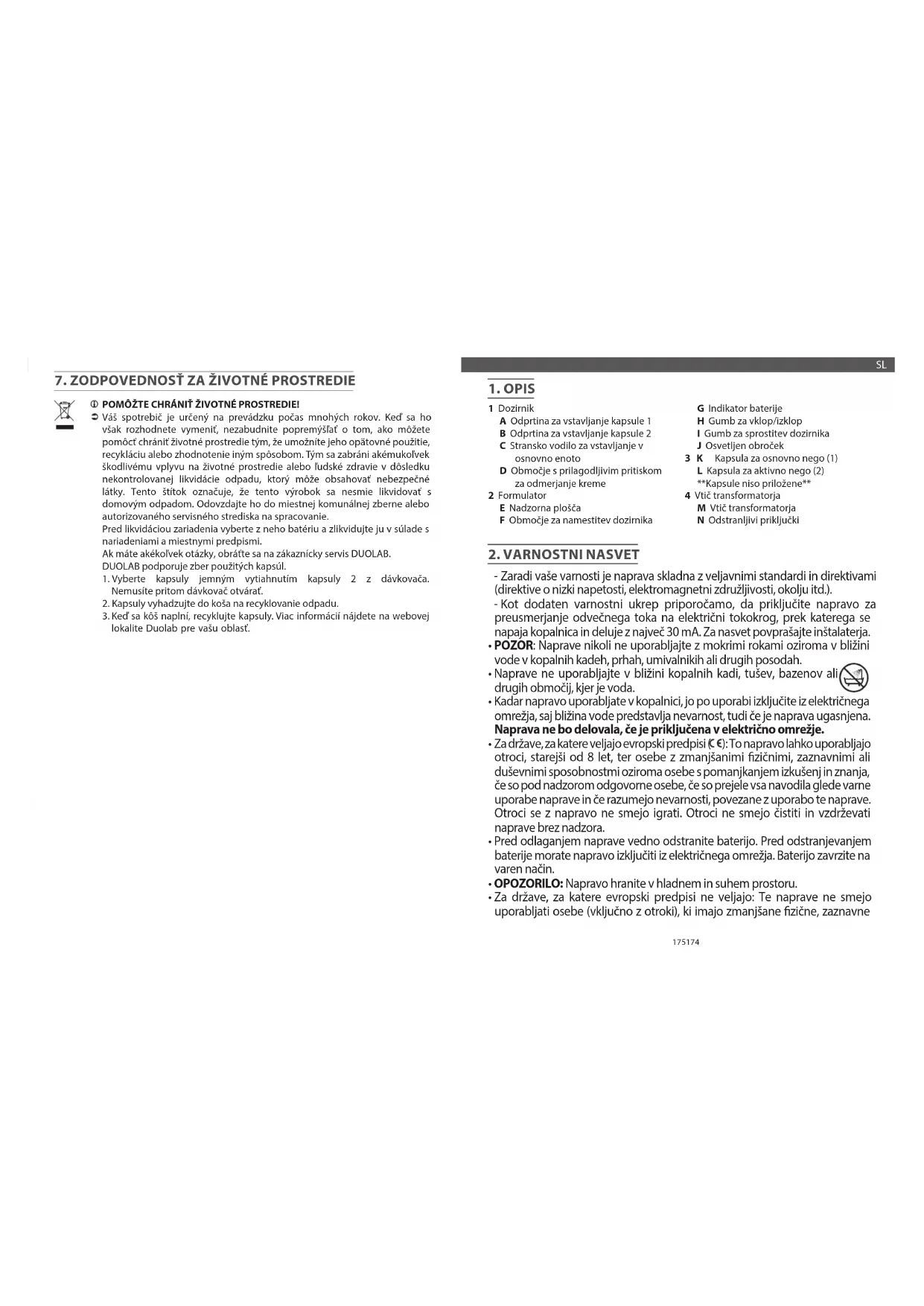 Pomagajte varovati okolje Vaša naprava je zasnovana za večletno delovanje. Ko se odločite, da jo želite zamenjati, razmislite, kako lahko pomagate pri varovanju okolja, tako da omogočite njeno vnovično uporabo, reciklažo ali obnovo. Na ta način boste preprečili škodljiv vpliv na okolje ali zdravje ljudi zaradi nenadzorovanega odlaganja odpadkov, ki lahko vsebujejo škodljive snovi. Ta nalepka označuje, da izdelka ne smete zavreči med gospodinjske odpadke. Dostavite ga v zbirni center, distributerju, ko kupite nov, enak izdelek, ali v pooblaščeni servisni center za obdelavo. Preden zavržete napravo, odstranite baterije in jih zavrzite v skladu s predpisi in lokalnimi ureditvami. V primeru vprašanj se obrnite na službo za pomoč strankam podjetja DUOLAB. Podjetje DUOLAB spodbuja zbiranje uporabljenih kapsul. . 1 Odstranite kapsuli tako, da 2. kapsulo nežno odstranite iz dozirnika. Pri tem dozirnika ni treba odpreti. . 2 Kapsuli odložite v koš za recikliranje. . 3 Ko je koš poln, kapsule reciklirajte. Več informacij za svojo regijo najdete na uradnem spletnem mestu Duolab. KREMA SE RAZLIJE IN STEČE V NAPRAVO.