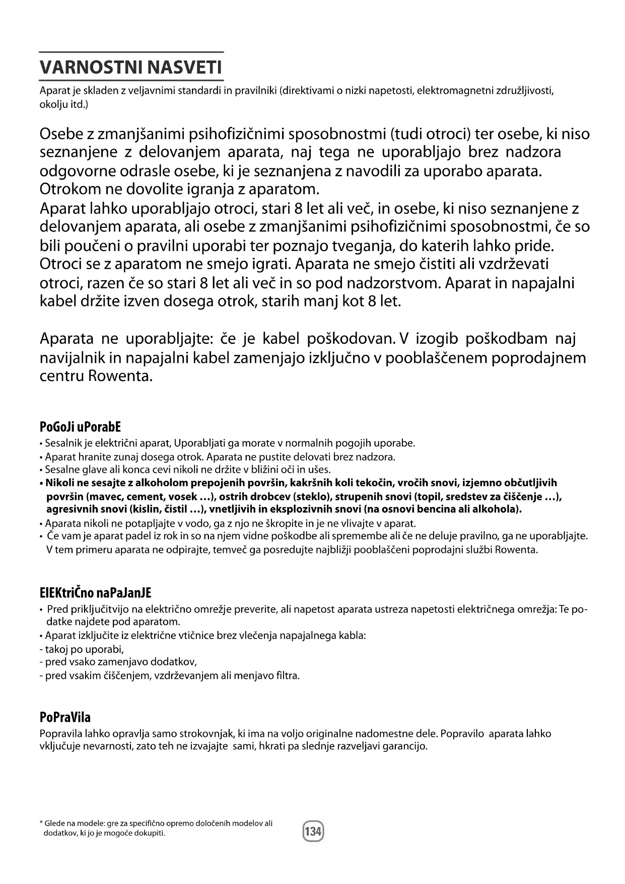 - Glede na modele: gre za specifično opremo določenih modelov ali dodatkov, ki jo je mogoče dokupiti. VARNOSTNI NASVETI Aparat je skladen z veljavnimi standardi in pravilniki (direktivami o nizki napetosti, elektromagnetni združljivosti, okolju itd.) Osebe z zmanjšanimi psihofizičnimi sposobnostmi (tudi otroci) ter osebe, ki niso seznanjene z delovanjem aparata, naj tega ne uporabljajo brez nadzora odgovorne odrasle osebe, ki je seznanjena z navodili za uporabo aparata. Otrokom ne dovolite igranja z aparatom. Aparat lahko uporabljajo otroci, stari 8 let ali več, in osebe, ki niso seznanjene z delovanjem aparata, ali osebe z zmanjšanimi psihofizičnimi sposobnostmi, če so bili poučeni o pravilni uporabi ter poznajo tveganja, do katerih lahko pride. Otroci se z aparatom ne smejo igrati. Aparata ne smejo čistiti ali vzdrževati otroci, razen če so stari 8 let ali več in so pod nadzorstvom. Aparat in napajalni kabel držite izven dosega otrok, starih manj kot 8 let. Aparata ne uporabljajte: če je kabel poškodovan. V izogib poškodbam naj navijalnik in napajalni kabel zamenjajo izključno v pooblaščenem poprodajnem centru Rowenta. PoGoJi uPorabE