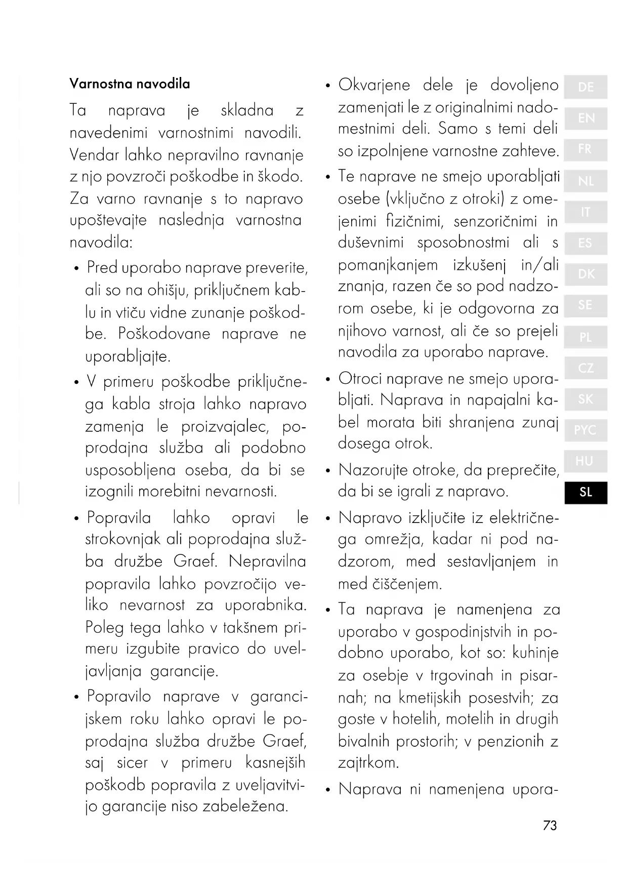 - Popravilo naprave v garanci- jskem roku lahko opravi le po- prodajna služba družbe Graef, saj sicer v primeru kasnejših poškodb popravila z uveljavitvi- jo garancije niso zabeležena.