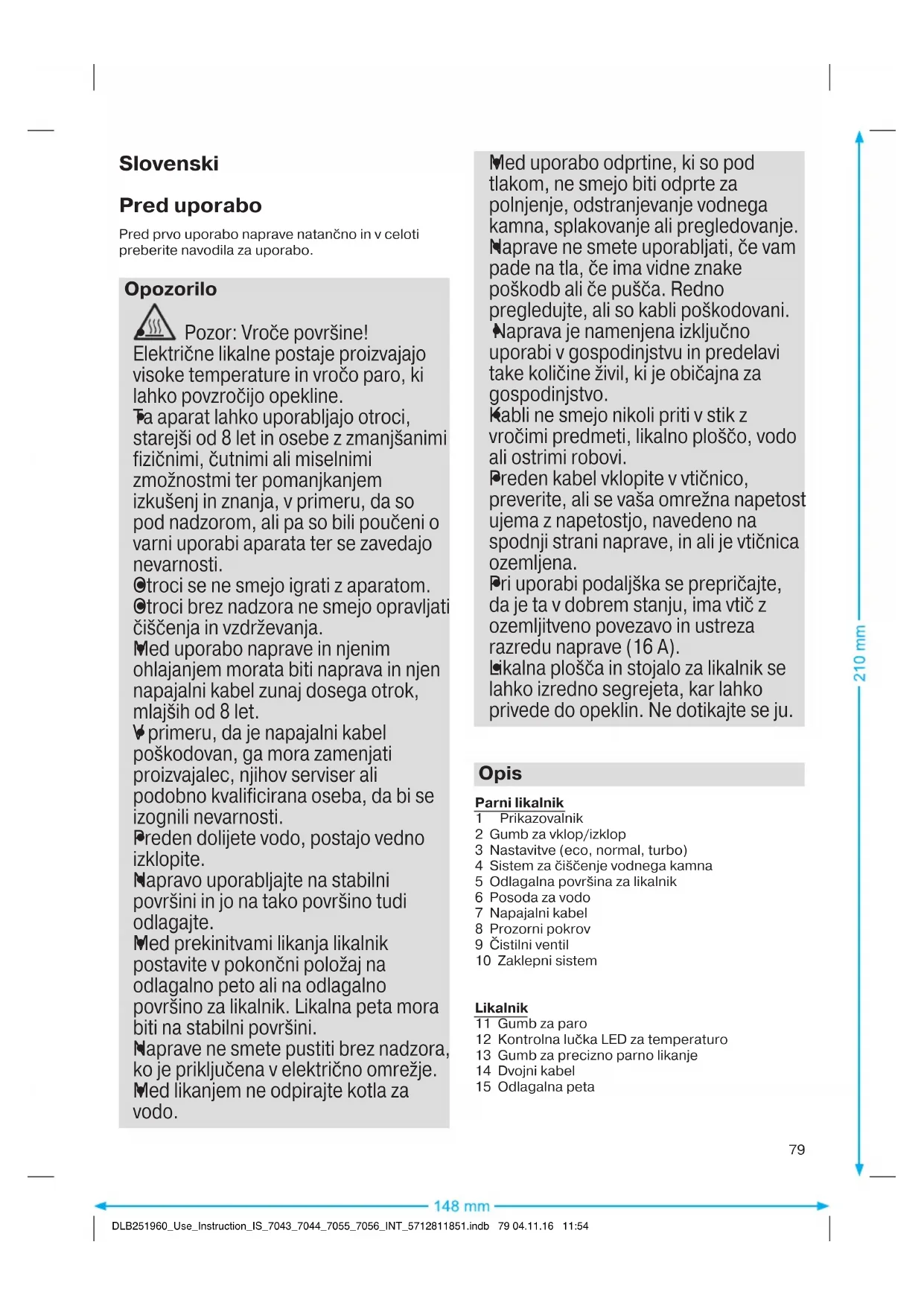 Pozor: Vroče površine! Električne likalne postaje proizvajajo visoke temperature in vročo paro, ki lahko povzročijo opekline.