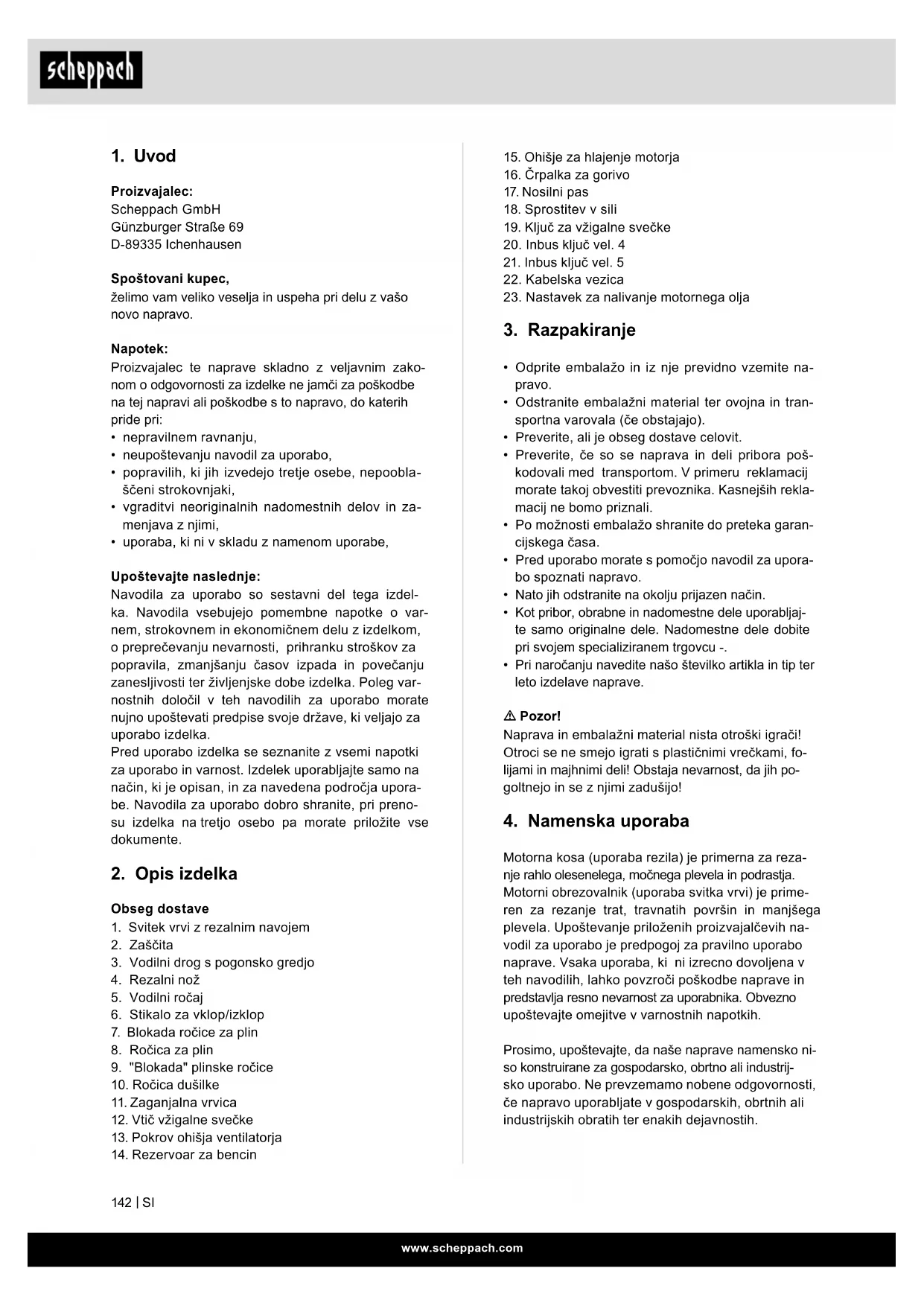 Razlaga simbolov na izdelku Pred zagonom preberite navodila za uporabo in varnostne napotke ter jih upoštevajte! Uporabljajte zaščitno čelado, zaščito sluha in zaščitna očala! Nosite trdno obutev! Nosite delovne rokavice! Pozor! Bencin je zelo lahko vnetljiv. Preprečite kajenje, odprti ogenj ali iskre v bližini goriva. Pozor! se zadušijo! Izpušni plini so strupeni, zato motor ne sme delovati v neprezračenih območjih. Opozorilo! Ob neupoštevanju možnost življenjske nevarnosti, nevarnosti telesnih poškodb ali poškodb orodja Pozor, nevarnost telesnih poškodb! Kadar motor deluje, roke in noge ne smejo priti v stik z rezilom. 15m Otroci, tretje osebe in pomočniki se rezalniku grmičevja ne smejo približati na več kot 15 m! Pozor! Izpuh in drugi deli motorja se med delovanjem zelo segrejejo – ne dotikajte se jih! Kapaciteta rezervoarja Pozor! Nevarnost telesnih poškodb zaradi izvrženih predmetov Pazite na povratne udarce! Pozor: ne uporabljajte žaginih listov ali večdelnega kovinskega rezalnega orodja! Rezalnik grmičevja Obrezovalnik trave Zajamčeni nivo zvočne moči Črpanje bencina, črpalka za bencin Dušilka, vklopljena (hladni zagon) Dušilka, izklopljena (topli zagon) Preverite nivo olja. Izdelek ustreza veljavnim srbskimi direktivam. Izdelek ustreza veljavnim evropskim direktivam.www.scheppach.com
