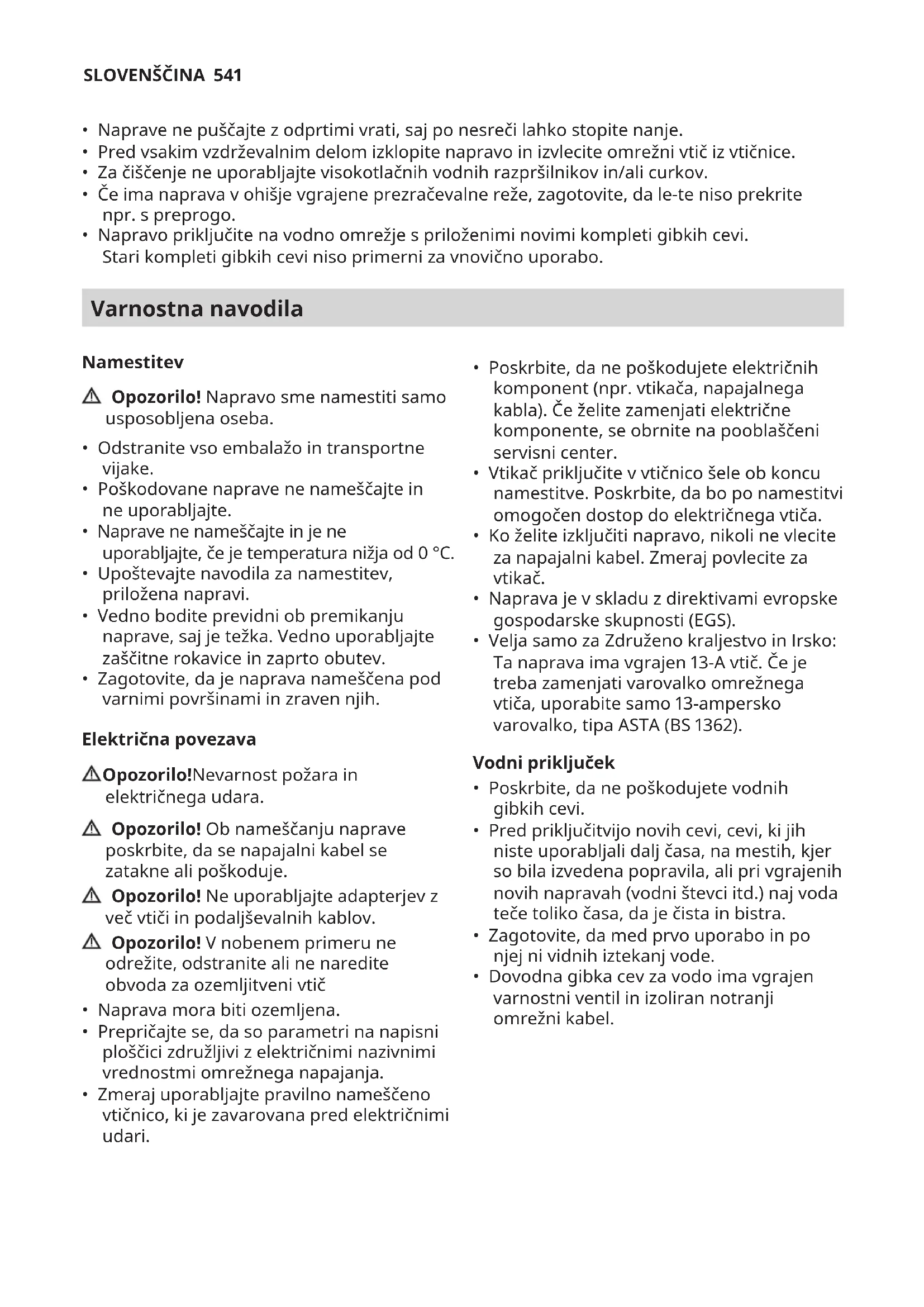 - Dovodna gibka cev za vodo ima vgrajen varnostni ventil in izoliran notranji omrežni kabel.SLOVENŠČINA 542 Opozorilo! Nevarna napetost.