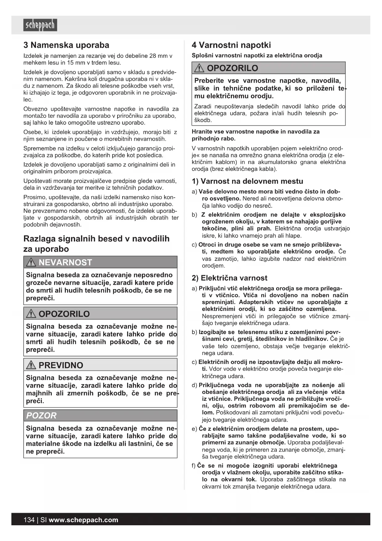 - = Ni nujno v obsegu dostave! SI | 133www.scheppach.com3 Namenska uporaba Izdelek je namenjen za rezanje vej do debeline 28mm v mehkem lesu in 15mm v trdem lesu. Izdelek je dovoljeno uporabljati samo v skladu s predvide- nim namenom. Kakršna koli drugačna uporaba ni v skla- du z namenom. Za škodo ali telesne poškodbe vseh vrst, ki izhajajo iz tega, je odgovoren uporabnik in ne proizvaja- lec. Obvezno upoštevajte varnostne napotke in navodila za montažo ter navodila za uporabo v priročniku za uporabo, saj lahko le tako omogočite ustrezno uporabo. Osebe, ki izdelek uporabljajo in vzdržujejo, morajo biti z njim seznanjene in poučene o morebitnih nevarnostih. Spremembe na izdelku v celoti izključujejo garancijo proi- zvajalca za poškodbe, do katerih pride kot posledica. Izdelek je dovoljeno uporabljati samo z originalnimi deli in originalnim priborom proizvajalca. Upoštevati morate proizvajalčeve predpise glede varnosti, dela in vzdrževanja ter meritve iz tehničnih podatkov. Prosimo, upoštevajte, da naši izdelki namensko niso kon- struirani za gospodarsko, obrtno ali industrijsko uporabo. Ne prevzemamo nobene odgovornosti, če izdelek uporab- ljate v gospodarskih, obrtnih ali industrijskih obratih ter podobnih dejavnostih. Razlaga signalnih besed v navodilih za uporabo NEVARNOST Signalna beseda za označevanje neposredno grozeče nevarne situacije, zaradi katere pride do smrti ali hudih telesnih poškodb, če se ne prepreči. OPOZORILO Signalna beseda za označevanje možne ne- varne situacije, zaradi katere lahko pride do smrti ali hudih telesnih poškodb, če se ne prepreči. PREVIDNO Signalna beseda za označevanje možne ne- varne situacije, zaradi katere lahko pride do majhnih ali zmernih poškodb, če se ne pre- preči. POZOR Signalna beseda za označevanje možne ne- varne situacije, zaradi katere lahko pride do materialne škode na izdelku ali lastnini, če se ne prepreči. 4 Varnostni napotki Splošni varnostni napotki za električna orodja OPOZORILO Preberite vse varnostne napotke, navodila, slike in tehnične podatke, ki so priloženi te- mu električnemu orodju. Zaradi neupoštevanja sledečih navodil lahko pride do električnega udara, požara in/ali hudih telesnih po- škodb. Hranite vse varnostne napotke in navodila za prihodnjo rabo. V varnostnih napotkih uporabljen pojem »električno orod- je« se nanaša na omrežno gnana električna orodja (z ele- ktričnim kablom) in na akumulatorsko gnana električna orodja (brez električnega kabla).