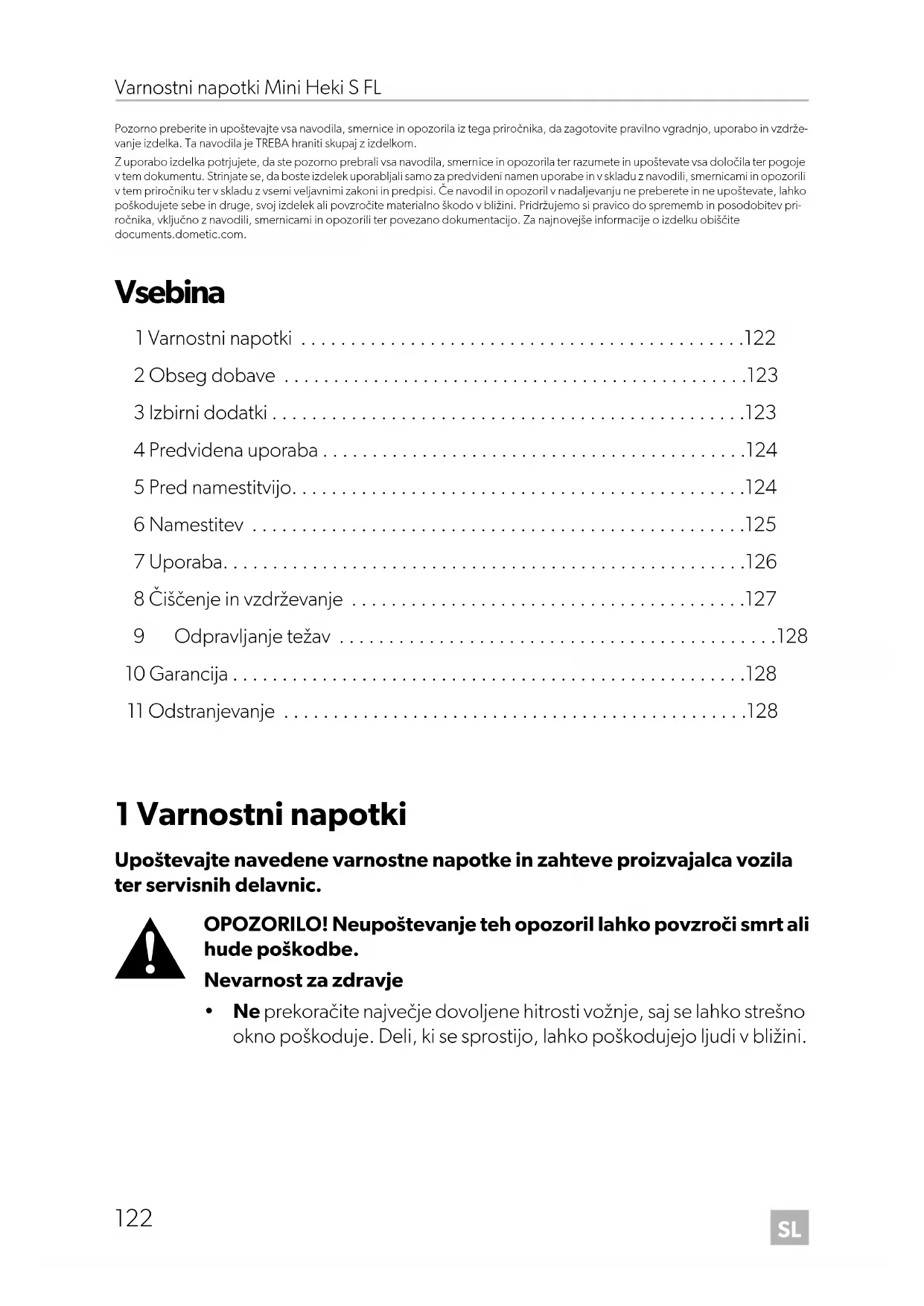 - Ne prekoračite največje dovoljene hitrosti vožnje, saj se lahko strešno okno poškoduje. Deli, ki se sprostijo, lahko poškodujejo ljudi v bližini. DometicMiniHeki-S-FL_IOM_4445104092_EMEA24_202x-xx-xx.book Page 122 Thursday, July 6, 2023 2:00 PMSL Mini Heki S FL Obseg dobave