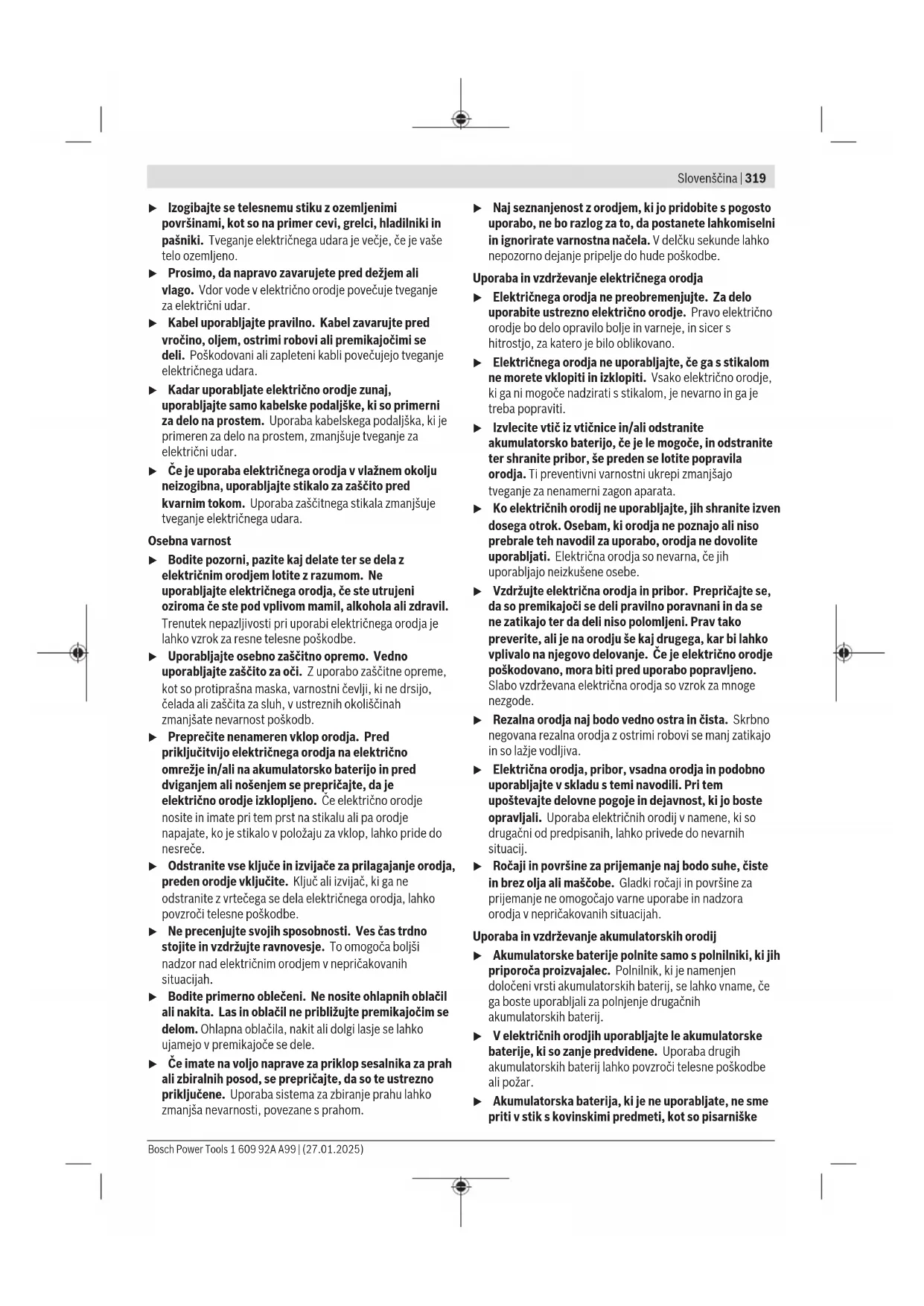 i na: www.bosch-pt.com/serviceaddresses Transport Sadržani litijum-jonski akumulatori podležu zahtevima zakona o opasnim materijalima. Korisnik može da transportuje akumulatore kopnenim putem bez dodatnih uslova. Kod slanja preko posrednika (npr.: vazdušnim transportom ili otpremom) treba poštovati posebne zahteve u pogledu pakovanja i označavanja. Pri tome je kod pripreme pošiljke potrebno angažovati stručnjaka za opasne materijale. Šaljite akumulatore samo ako je kućište neoštećeno. Otvorene kontakte odlepite i tako upakujte akumulator da se u pakovanju ne pokreće. Molimo da obratite pažnju i na eventualne dodatne nacionalne propise. Uklanjanje đubreta Električne alate, akumulacione baterije, pribor i pakovanja treba predati na reciklažu koja je u skladu sa zaštitom životne sredine. Ne bacajte električne alate i akumulatore/ baterije u kućno djubre! Samo za EU‑zemlje: Električni uređaji koji se više ne mogu koristiti i neispravni ili istrošeni akumulatori/baterije se moraju da se odlažu u otpad odvojeno. Koristite predviđene sisteme za sakupljanje. Ako se nepravilno zbrine, otpadna električna i elektronska oprema može imati štetne posledice po životnu sredinu i zdravlje ljudi zbog mogućeg prisustva opasnih materija. Akumulatorske baterije/baterije: Li-jonska: Molimo da obratite pažnju na napomene u odeljku Transport (videti „Transport“, Strana318). Slovenščina Varnostna opozorila Splošna varnostna navodila za električna orodja OPOZORILO Preberite vsa varnostna opozorila, navodila, ilustracije in specifikacije, ki so priložene temu električnemu orodju. Če spodaj navedenih napotkov ne upoštevate, lahko pride do električnega udara, požara in/ali težke poškodbe. Vsa opozorila in napotke shranite, ker jih boste v prihodnje še potrebovali. Pojem električno orodje, ki se pojavlja v nadaljnjem besedilu, se nanaša na električna orodja z električnim pogonom (z električnim kablom) in na akumulatorska električna orodja (brez električnega kabla). Varnost na delovnem mestu u Delovno mesto naj bo vedno čisto in dobro osvetljeno. Nered in neosvetljena delovna mesta povečajo možnost nezgod. u Električnega orodja ne uporabljajte v okolju, v katerem lahko pride do eksplozij (prisotnost vnetljivih tekočin, plinov ali prahu). Električna orodja povzročajo iskrenje, zaradi katerega se lahko prah ali hlapi vnamejo. u Ko uporabljate električno orodje, poskrbite, da v bližini ni otrok ali drugih oseb. Odvračanje pozornosti lahko povzroči izgubo nadzora nad orodjem. Električna varnost u Priključni vtič električnega orodja se mora prilegati vtičnici. Spreminjanje vtiča na kakršen koli način ni dovoljeno. Pri ozemljenih električnih orodjih ne uporabljajte adapterskih vtičev. Nespremenjeni vtiči in ustrezne vtičnice zmanjšujejo tveganje električnega udara. 1 609 92A A99 | (27.01.2025) Bosch Power ToolsSlovenščina | 319 u Izogibajte se telesnemu stiku z ozemljenimi površinami, kot so na primer cevi, grelci, hladilniki in pašniki. Tveganje električnega udara je večje, če je vaše telo ozemljeno. u Prosimo, da napravo zavarujete pred dežjem ali vlago. Vdor vode v električno orodje povečuje tveganje za električni udar. u Kabel uporabljajte pravilno. Kabel zavarujte pred vročino, oljem, ostrimi robovi ali premikajočimi se deli. Poškodovani ali zapleteni kabli povečujejo tveganje električnega udara. u Kadar uporabljate električno orodje zunaj, uporabljajte samo kabelske podaljške, ki so primerni za delo na prostem. Uporaba kabelskega podaljška, ki je primeren za delo na prostem, zmanjšuje tveganje za električni udar. u Če je uporaba električnega orodja v vlažnem okolju neizogibna, uporabljajte stikalo za zaščito pred kvarnim tokom. Uporaba zaščitnega stikala zmanjšuje tveganje električnega udara. Osebna varnost u Bodite pozorni, pazite kaj delate ter se dela z električnim orodjem lotite z razumom. Ne uporabljajte električnega orodja, če ste utrujeni oziroma če ste pod vplivom mamil, alkohola ali zdravil. Trenutek nepazljivosti pri uporabi električnega orodja je lahko vzrok za resne telesne poškodbe. u Uporabljajte osebno zaščitno opremo. Vedno uporabljajte zaščito za oči. Z uporabo zaščitne opreme, kot so protiprašna maska, varnostni čevlji, ki ne drsijo, čelada ali zaščita za sluh, v ustreznih okoliščinah zmanjšate nevarnost poškodb. u Preprečite nenameren vklop orodja. Pred priključitvijo električnega orodja na električno omrežje in/ali na akumulatorsko baterijo in pred dviganjem ali nošenjem se prepričajte, da je električno orodje izklopljeno. Če električno orodje nosite in imate pri tem prst na stikalu ali pa orodje napajate, ko je stikalo v položaju za vklop, lahko pride do nesreče. u Odstranite vse ključe in izvijače za prilagajanje orodja, preden orodje vključite. Ključ ali izvijač, ki ga ne odstranite z vrtečega se dela električnega orodja, lahko povzroči telesne poškodbe. u Ne precenjujte svojih sposobnosti. Ves čas trdno stojite in vzdržujte ravnovesje. To omogoča boljši nadzor nad električnim orodjem v nepričakovanih situacijah. u Bodite primerno oblečeni. Ne nosite ohlapnih oblačil ali nakita. Las in oblačil ne približujte premikajočim se delom. Ohlapna oblačila, nakit ali dolgi lasje se lahko ujamejo v premikajoče se dele. u Če imate na voljo naprave za priklop sesalnika za prah ali zbiralnih posod, se prepričajte, da so te ustrezno priključene. Uporaba sistema za zbiranje prahu lahko zmanjša nevarnosti, povezane s prahom. u Naj seznanjenost z orodjem, ki jo pridobite s pogosto uporabo, ne bo razlog za to, da postanete lahkomiselni in ignorirate varnostna načela. V delčku sekunde lahko nepozorno dejanje pripelje do hude poškodbe. Uporaba in vzdrževanje električnega orodja u Električnega orodja ne preobremenjujte. Za delo uporabite ustrezno električno orodje. Pravo električno orodje bo delo opravilo bolje in varneje, in sicer s 